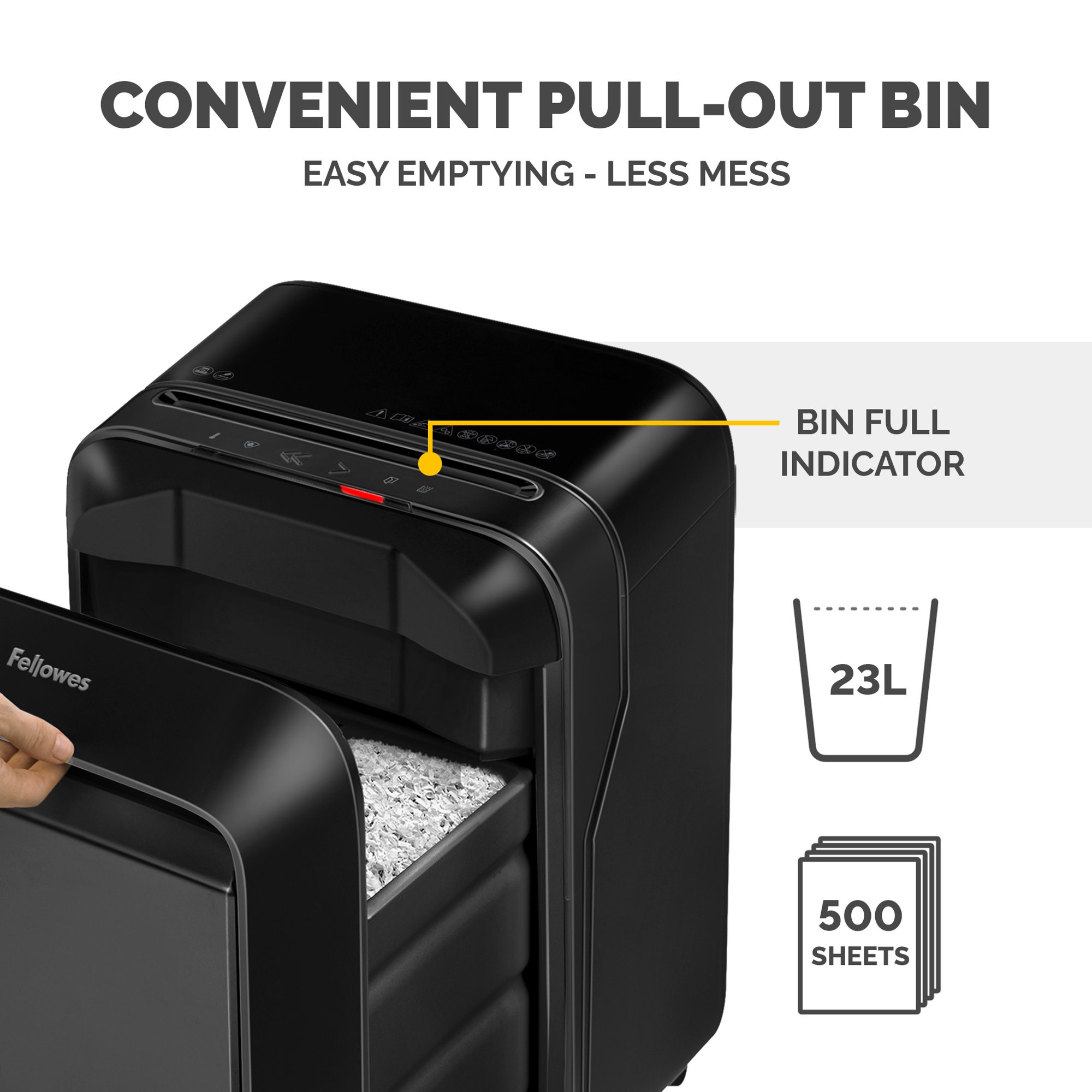The essential shredder for any office, the LX210 mini-cut paper shredder shreds 16 sheets of A4 paper per pass into 4 x 12 mm mini-cut particles (security level P-4), so you can be sure that your confidential work documents have been disposed of securely. The paper shredders powerful mini-cut cutters will not only shred your documents but can shred staples, paper clips and credit cards too. Maximise shredding performance with the LX210's Intellibar responsive technology which provides in-use feedback that maximises shredder performance €“ preventing interruptions by indicating when bin & sheet capacity is nearing the limit, or the run time is close to being reached. The Powershred LX210 paper shredder features the Fellowes 100 percent jam proof system to eliminate paper jams and provide relief from the number one shredding frustration. Designed with safety in mind, your mini cut paper shredder will automatically disable when hands come into contact with the opening, stopping the cutters immediately. The LX210 paper shredder has a long run time and will shred continuously for up to 20 minutes before requiring a 15 minutes cool down period. Fellowes shredders are built to last with solid steel cutters, a powerful motor and parts that are engineered to outperform our Compatibleetitors.