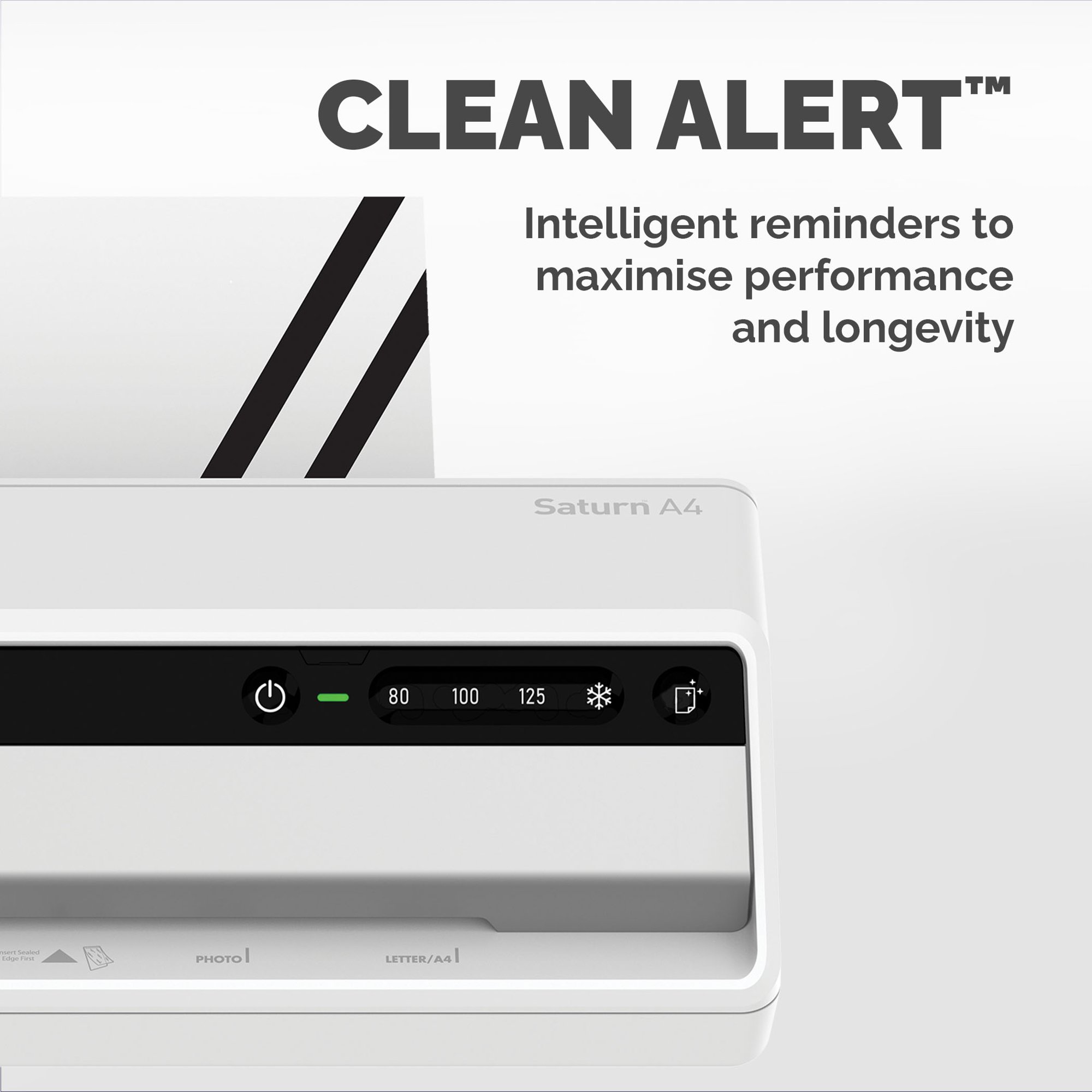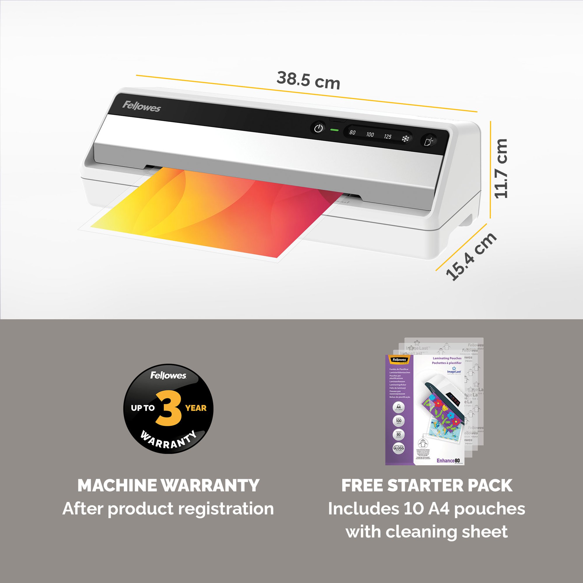 The Fellowes Saturn A4 laminator is Jam Free when used with Fellowes branded laminating pouches as it features a release lever which allows you to realign documents that have been misfed into the laminator. This small or home office use laminator machine can laminate up to 125 micron laminating pouches which is perfect for laminating your important documents or giving you a professional finish to social notices and work projects. Built for convenience, your Fellowes A4 laminator is ready to laminate in as little as 30 seconds from switching it on with InstaHeat technology. Its sleep mode will be activated after 30 minutes of inactivity. Your Fellowes A4 laminator includes a 10-document starter pack with samples of Fellowes laminating pouches that give a superior finish to your laminated work.