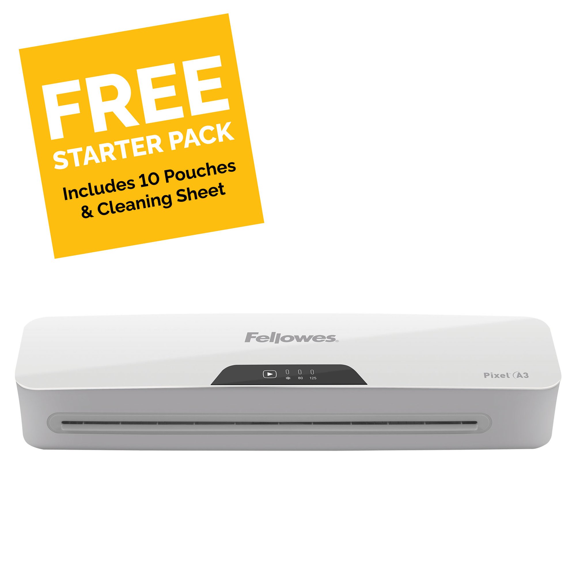 The Fellowes Pixel A3 home office laminator is jam free when used with Fellowes branded laminating pouches as it features a release lever which allows you to realign documents that have been misfed into the laminator. This Fellowes home office use laminator machine can laminate up to 125 micron laminating pouches, ideal for laminating your important documents or giving you a professional finish to your photos or personal projects. After a 3 minute heat up time, your Pixel A3 laminator is ready for use. A Jam release lever helps prevent paper jams by allowing the user to remove and realign misfed documents. Its sleep mode will be activated after 30 minutes of inactivity. Your Fellowes A3 laminator comes with a handy 10 document starter pack with samples of Fellowes laminating pouches, allowing you to get laminating straight away!