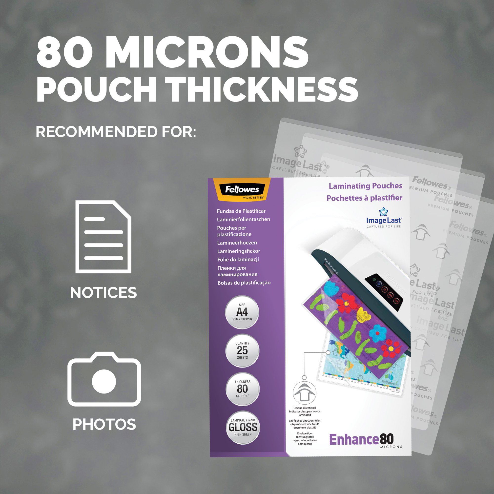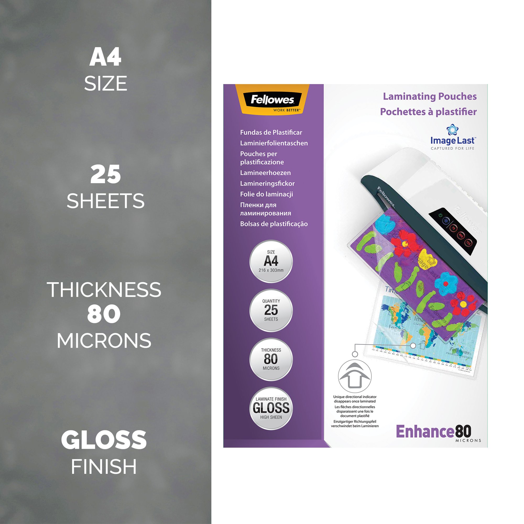 Make your document last with Fellowes premium quality laminating pouches. These gloss finish pouches are available in 80, 100, 125, 175 and 250 Microns for all levels of document protection, making them ideal for notices, photos, instructional materials and frequently handled documents. Available in various standard sizes from A2 to A5. Fellowes laminating pouches ensure 100% Jam Free performance when used with Fellowes laminators.