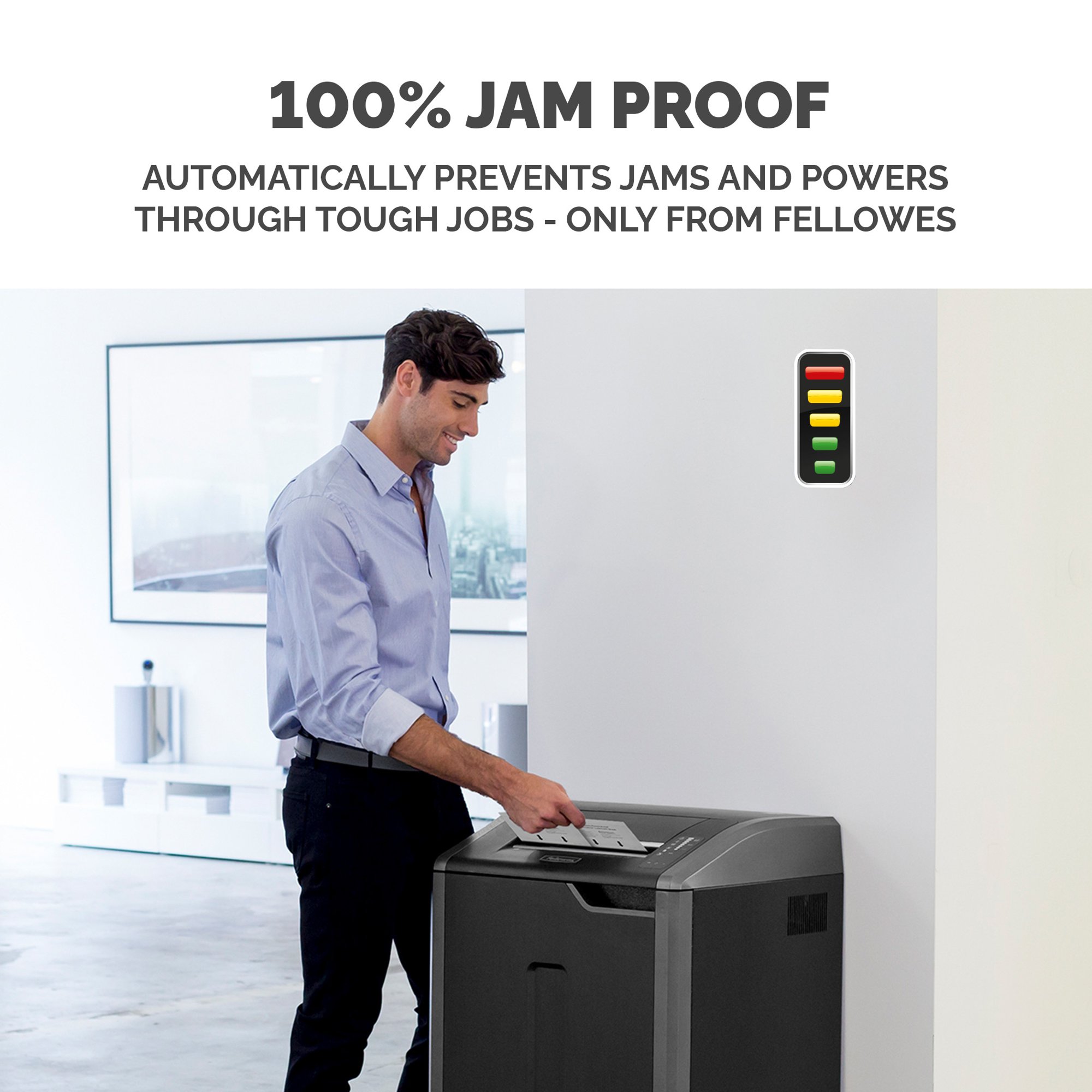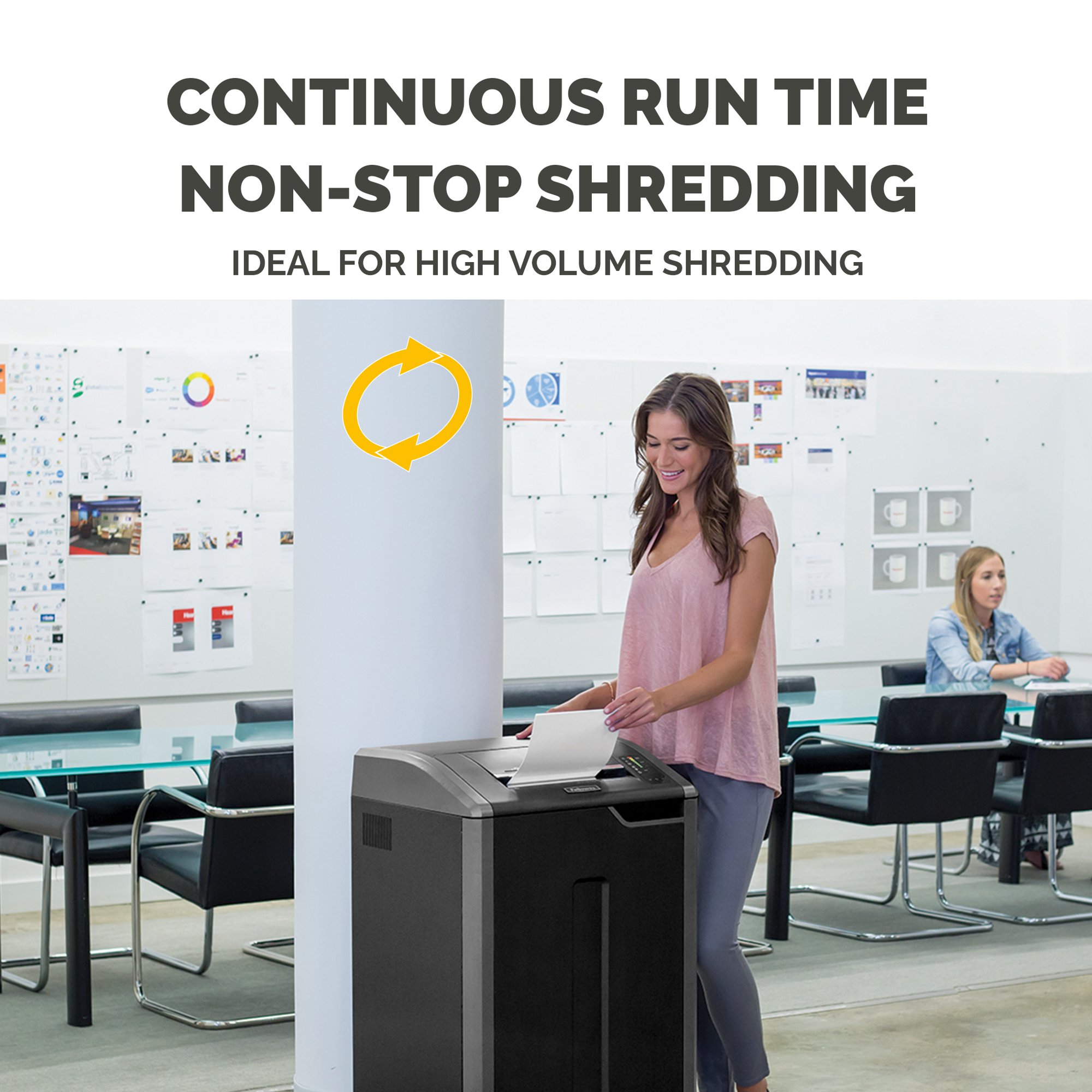 The Powershred 485Ci cross-cut shredder is a premium 100% Jam Proof machine, designed for commercial use in large offices, ideal for placing in copy areas and utility rooms to ensure a shredding best practice can be rolled out throughout the business and all information can be disposed of safely. This shredding machine shreds paper into 4 x 30 mm particles (P-4) as well as shredding staples, paperclips, credit cards and CD/DVD's too, with a flap for CD/DVD's. The continuous duty motor means that the machine can be used at any given time, regardless of how many people have used it beforehand, ideal for high volume shredding. The advanced 100% Jam Proof System eliminates paper jams and powers through tough jobs, so along with the 32 sheet capacity and 405mm paper entry, you can be sure that the shredding process will be productive and fast. It's Sleep Mode feature will cause the machine to shut off after 2 minutes of inactivity. The large 132 litre pull out bin means you will have to empty the paper waste less frequently saving valuable time. Fellowes shredders are built to last with solid steel cutters, a powerful motor and parts that are engineered to outperform our Compatibleetitors.