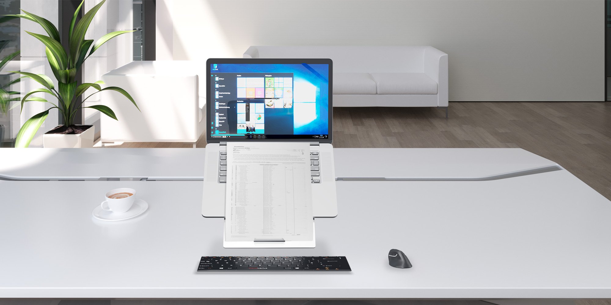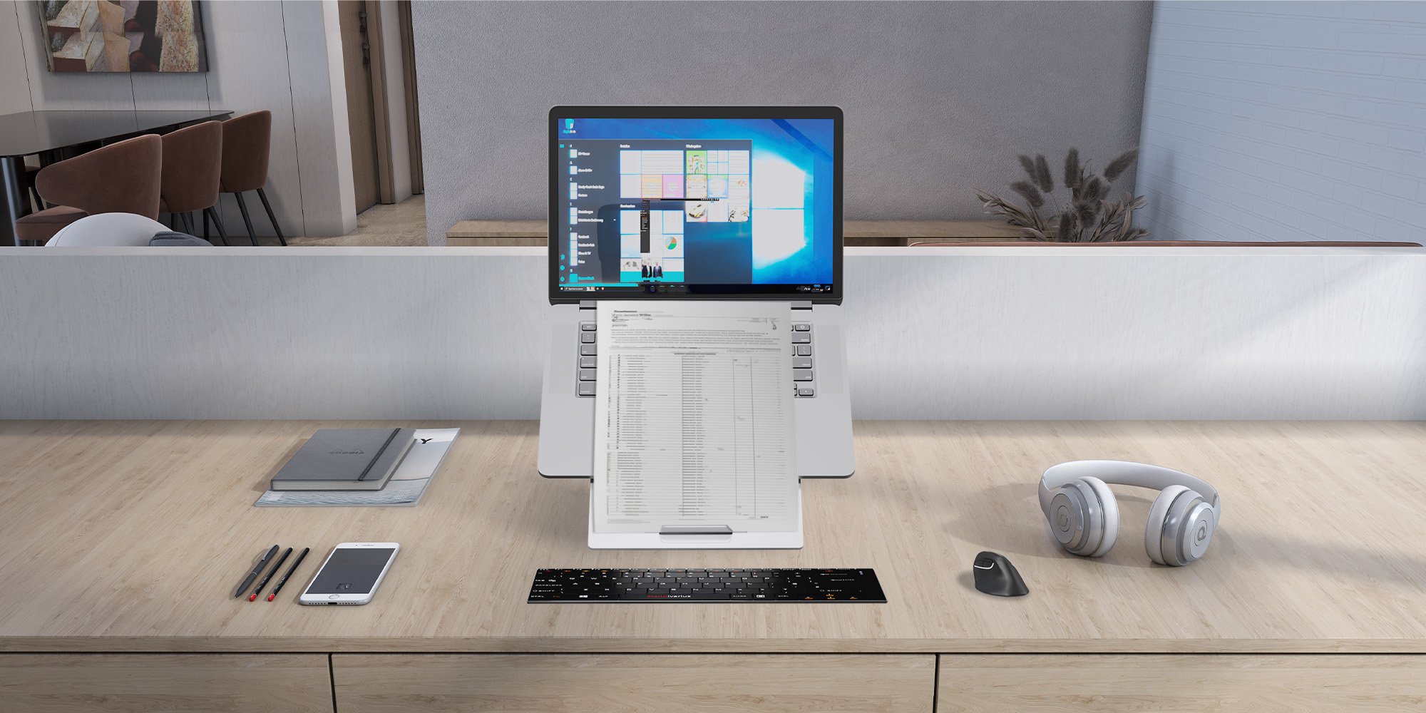 Ergonomic laptop stand with retractable in-line document holder for business comfort and pain-free work.<br><br>It has been developed to fit the majority of the laptops available on the market. The height adjustable design allows Oryx evo D to raise the laptop to a comfortable working position. <br><br>A versatile ergonomic accessory designed to Compatiblely with European health & safety regulations is certified by IGR Germany.<br>Created with the user in mind: instant setup and pack away, lightweight and thin for true mobility, easily adjustable screen elevation and inclination.<br>Refined design, minimalist but very sturdy, guaranteed against malfunction for life.