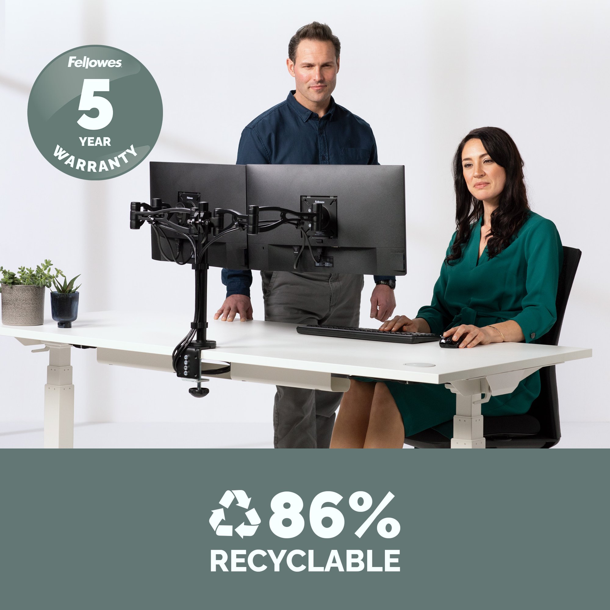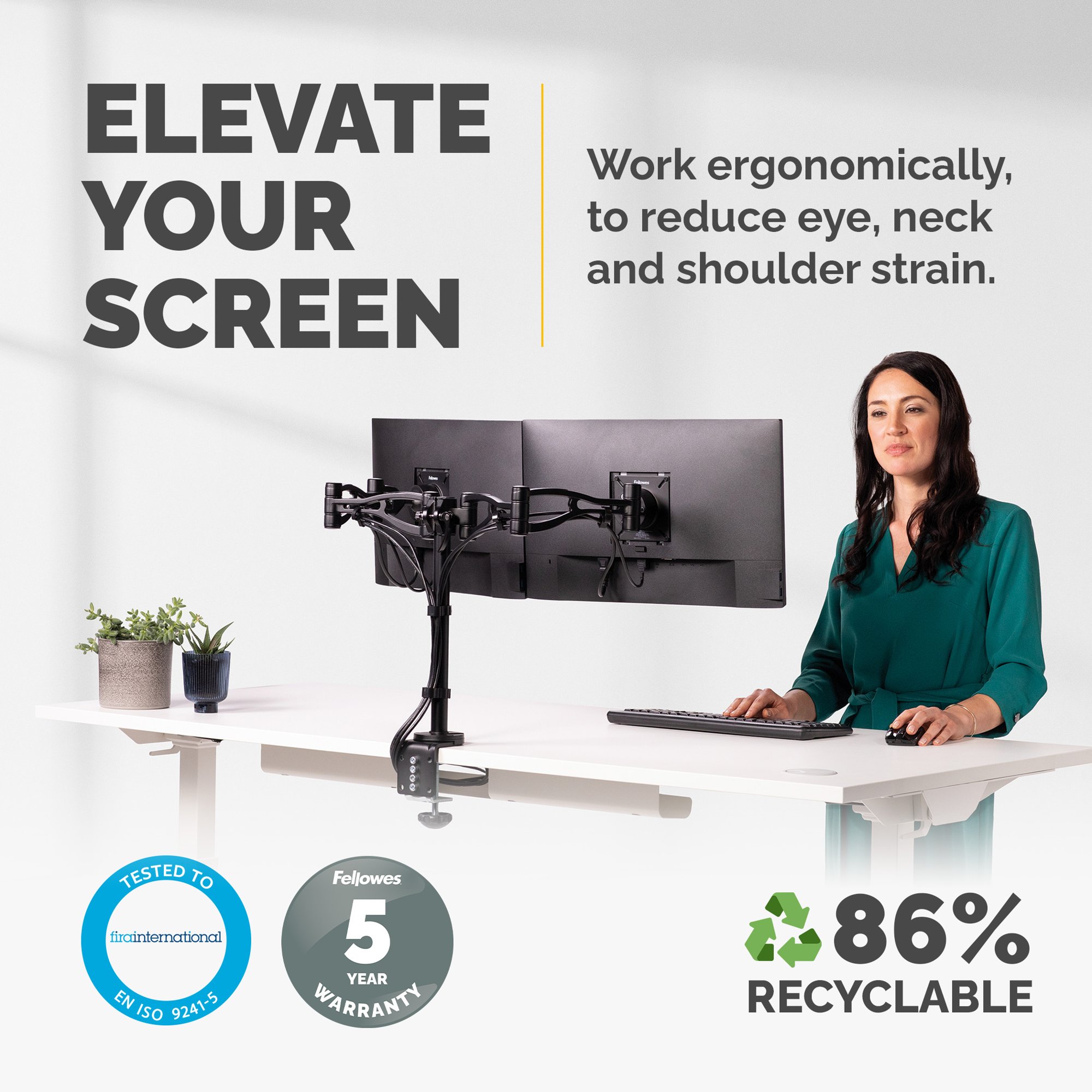 Sitting or standing with bad posture all day using a computer is bad for your health. Leaning forwards or tilting your head up or down not only causes back and neck strain but is also bad for your eyes. The Fellowes Vista Dual Monitor arm will improve your ergonomic posture and reduce back neck and eye strain. Working with a dual monitor stand means you can view more screen content and can use multiple programs simultaneously. With ever shrinking office spaces, using a dual monitor mount means you can free up valuable work space to become more organised and productive. With effortless adjustment you can collaborate and share information with colleagues easily, making them ideal for hot desks or shared desks. The Fellowes double monitor stand is ideal for any workspace, with its stylish, continent design. This fully independent adjustable dual monitor arm by Fellowes can pan 180° and can rotate 360° for optimum viewing control. Minimise clutter with the Vista Series monitor stands which feature an intuitive cable management system to keep your workspace tidier. Easily mounted via clamp, each of the monitor arms can hold up to a 10KG monitors with a maximum screen size of 32in / 66.04cm and meets VESA monitor desk mount standards.
