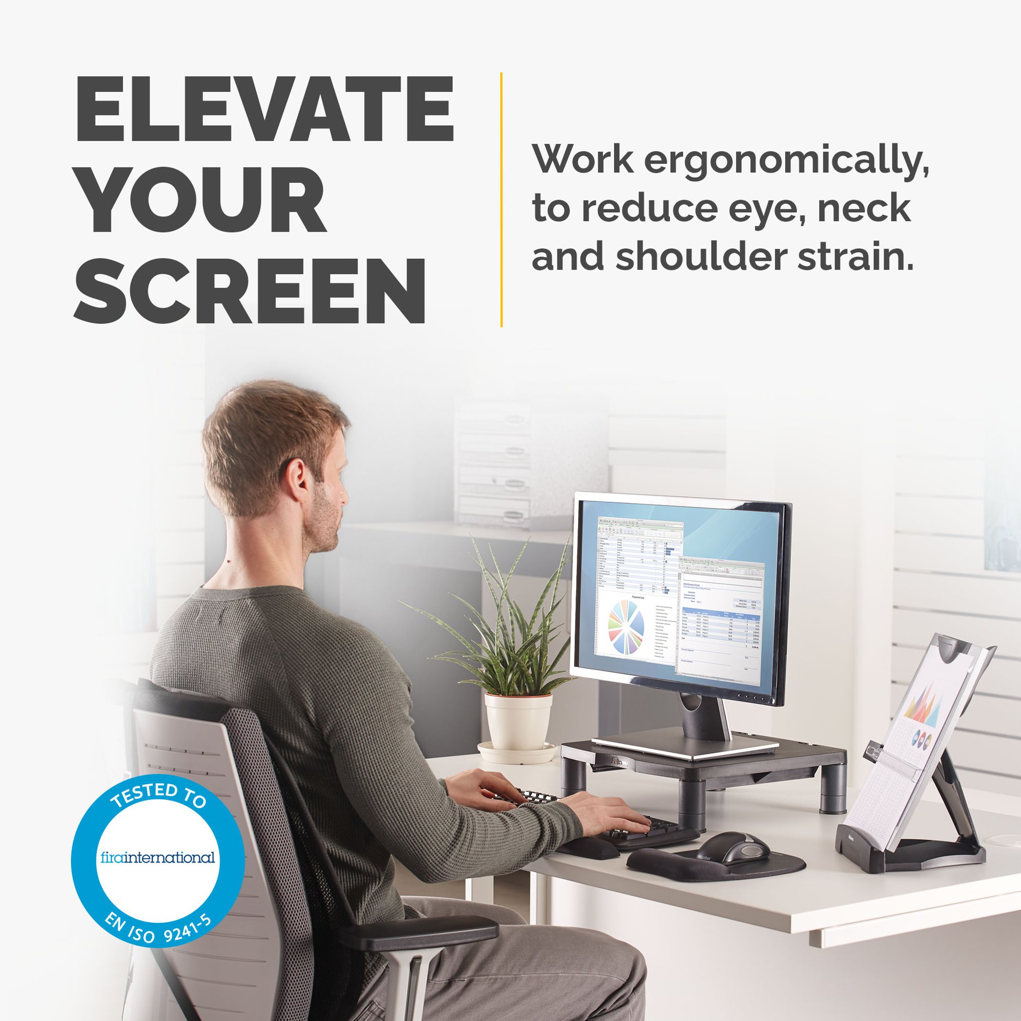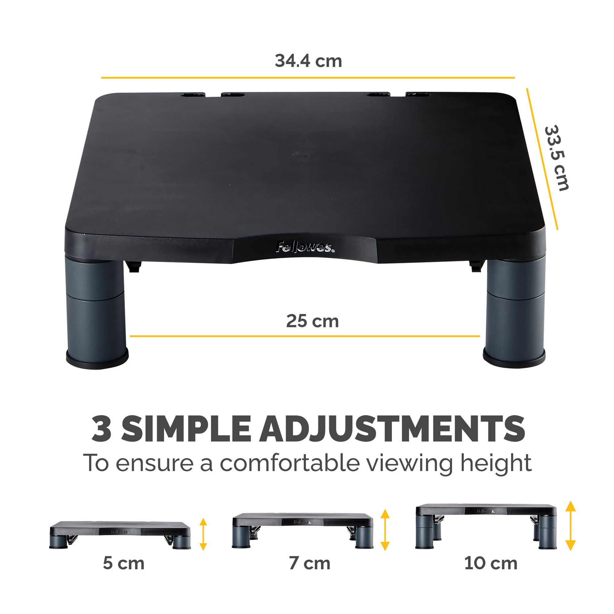 A few easy adjustments to your workstation can make a huge difference to your daily routine. Moving your head to view your screen or to read documents requires you to tilt and turn your neck and upper back. Positioning your screen incorrectly can put serious strain on your eyes, neck and shoulders which is why this Fellowes computer stand is a necessity for your workspace as it allows you to place your monitor at a more ergonomically-correct viewing position to suit you. This adjustable monitor stand can support up to a 21-Inch CRT or TFT/LCD monitor or a maximum weight of 27 kg, and features non skid foot rings, ensuring stability on any surface. accommodate the ideal viewing angle that ideal suits your needs, the Standard computer stand features three height adjustable settings (50-100 mm) allowing you to find a comfortable screen position accustomed to you. This monitor riser is accredited by FIRA International, an independent Ergonomic Accreditor.