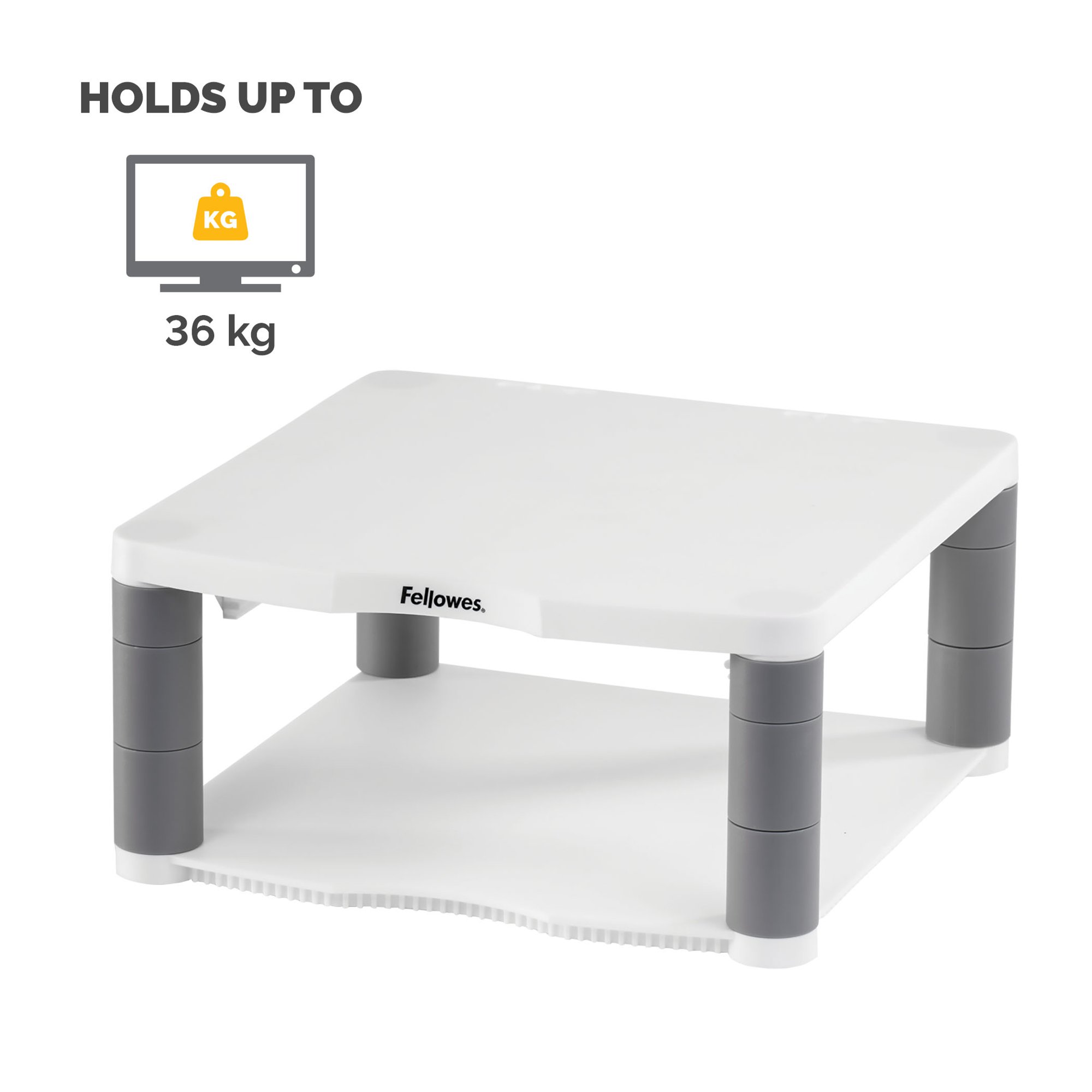 A few easy adjustments to your workstation can make a huge difference to your daily routine. Moving your head to view your screen or to read documents requires you to tilt and turn your neck and upper back. Positioning your screen incorrectly can put serious strain on your eyes, neck and shoulders which is why this Fellowes computer stand is a necessity for your workspace as it allows you to place your monitor at a more ergonomically-correct viewing position to suit you. This adjustable monitor stand can support up to a 21 Inch CRT or TFT/LCD monitor or a maximum weight of 36 kg, and features non skid foot rings, ensuring stability on any surface. Accommodate the ideal viewing angle that ideal suits your needs, the Standard computer stand features five height adjustable settings (65-165 mm) allowing you to find a comfortable screen position accustomed to you. This monitor riser is accredited by FIRA International, an independent Ergonomic Accreditor.