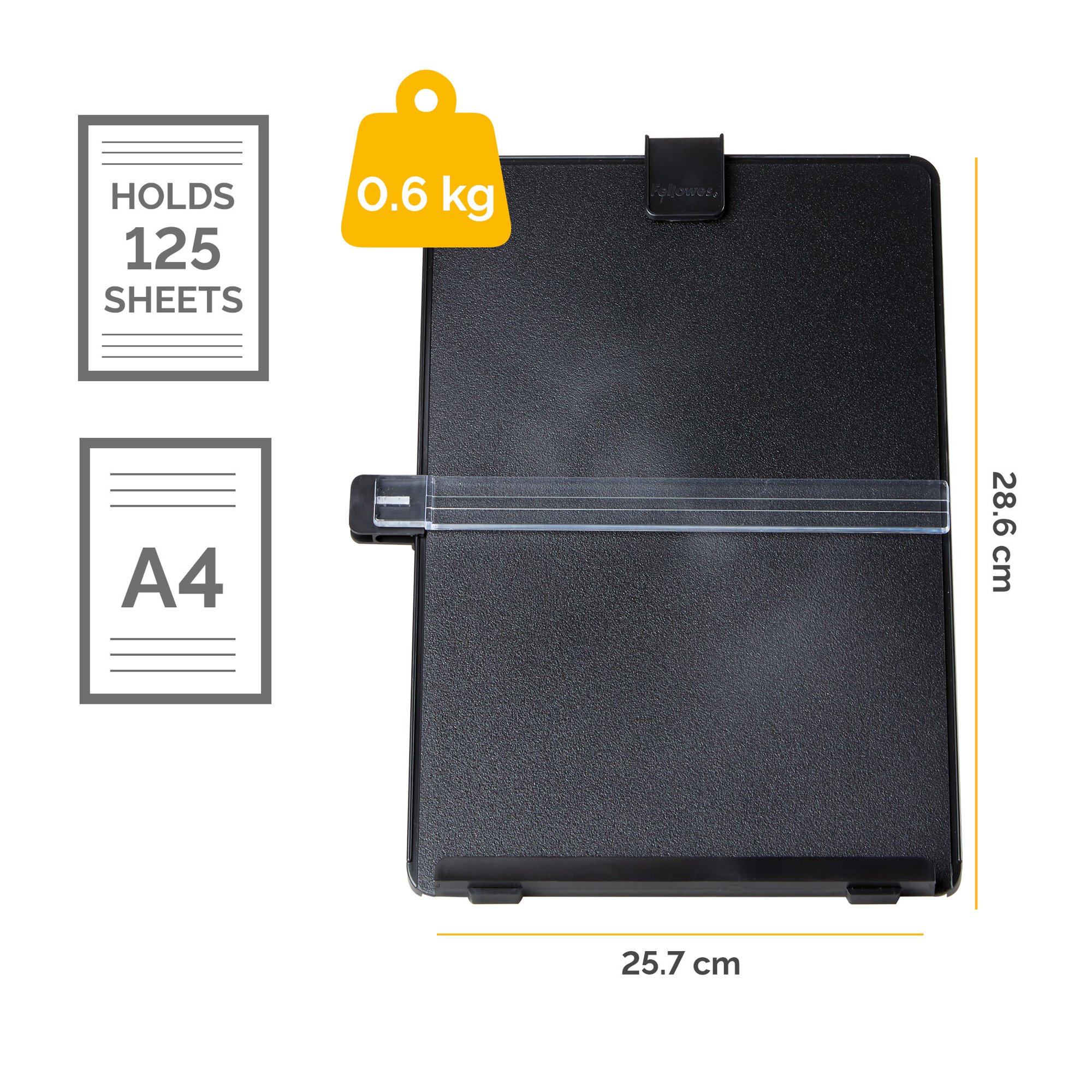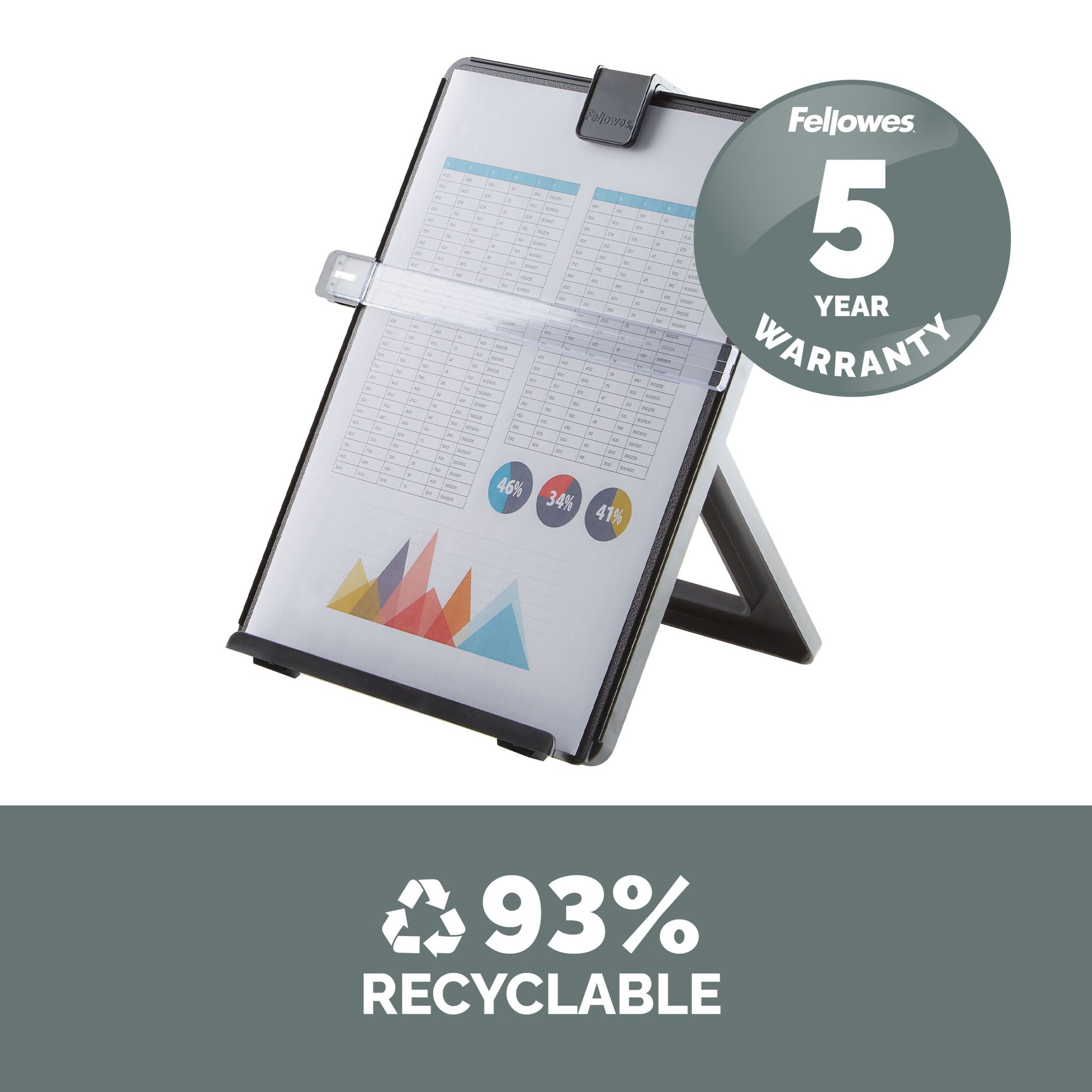 Workstation Document Holder includes a removable line guide for highlighting text. Track design allows user to position line guide and paper holder along the top or side. Easel back extends for height and angle adjustment or folds flat for easy storage. Holds up to 125 sheets of paper at a time.