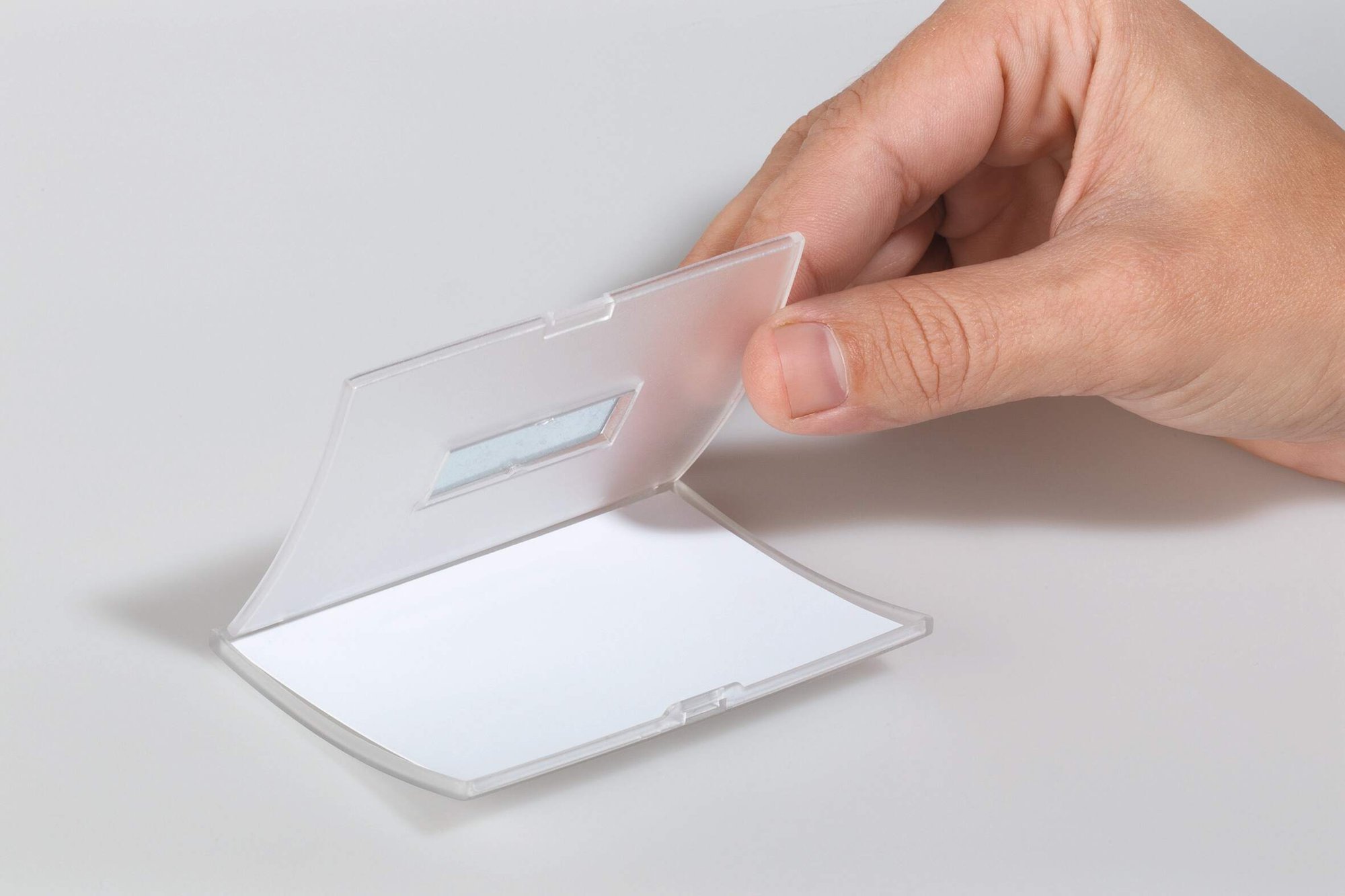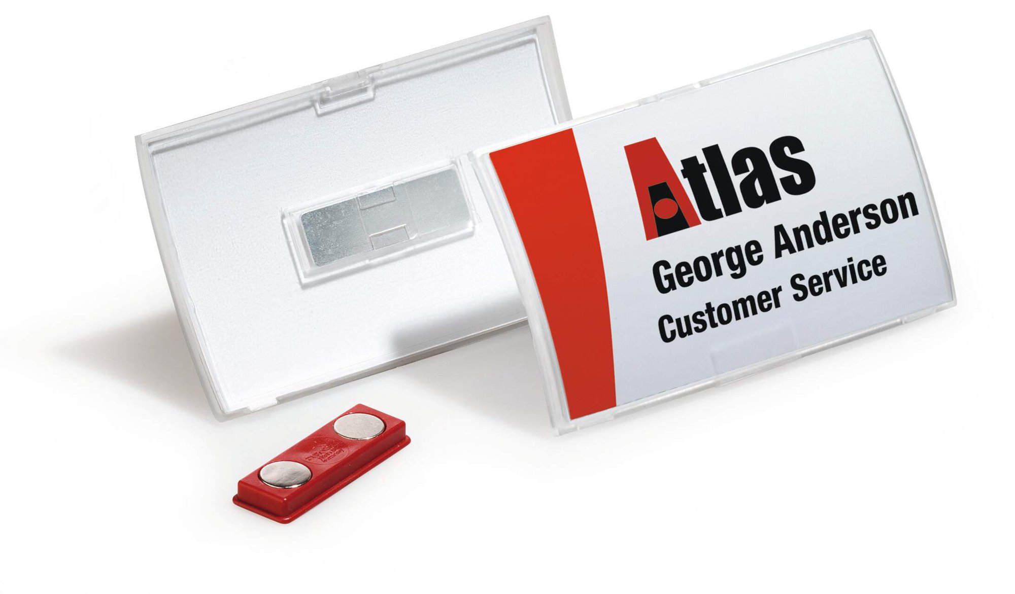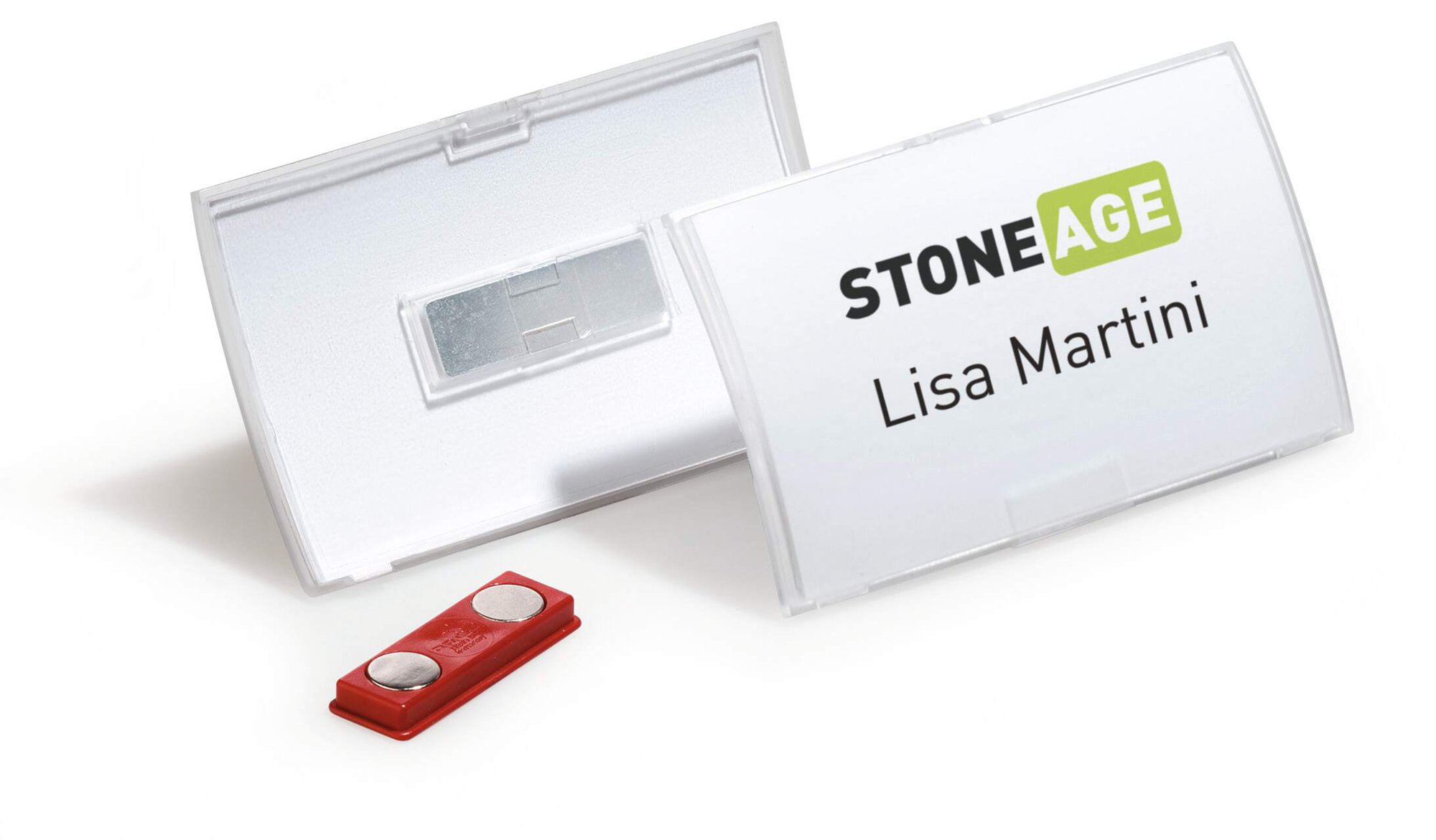 Modern frameless name badges made with recycled plastic, perfect for use in conferences, trade fairs or seminars. They feature simple and secure anti-slip magnetic fastenings that won€™t damage even delicate fabrics. Kind to the planet and your cloths.<br><br>Say goodbye to fiddling with inserts thanks to our unique convex CLICK FOLD design.<br><br>Made with over 70% recycled polypropylene, 100% recyclable and environmentally friendly in accordance with ISO 14021.<br><br>Provided with 10 pre-cut blank insert cards<br>Compatible with printable inserts (product # 145302)<br><br>Insert size: 40 x 75 mm<br>Pack size: 10<br><br>Made in Germany and built to last