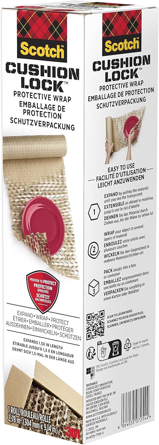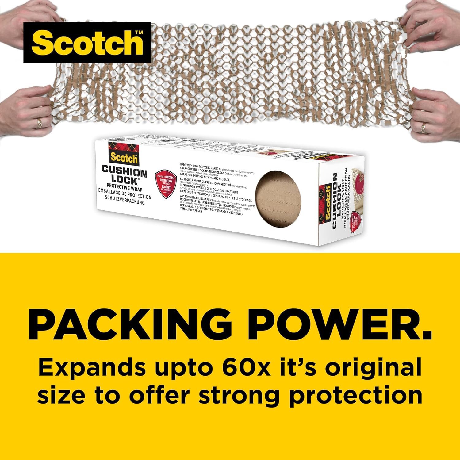 Scotch™ Cushion Lock™ Protective Wrap is an expanding paper cushion wrap that offers secure protection to even the most fragile items while on the move. The Advanced 3M™ Self-Locking Technology interlocks to itself to cushion items securely in the box during shipping. It also saves on storage space Compatibleared to more bulky plastic cushion wraps.