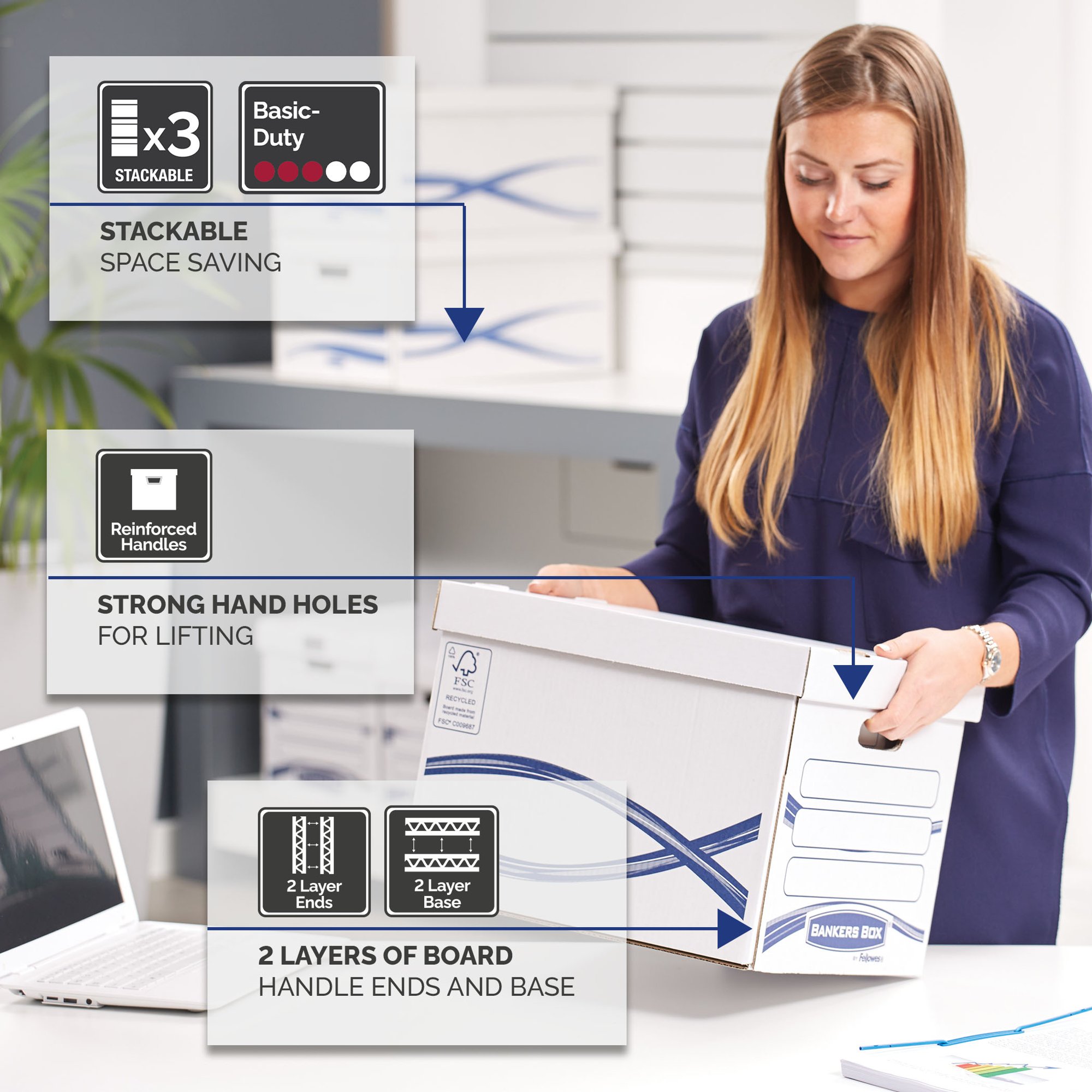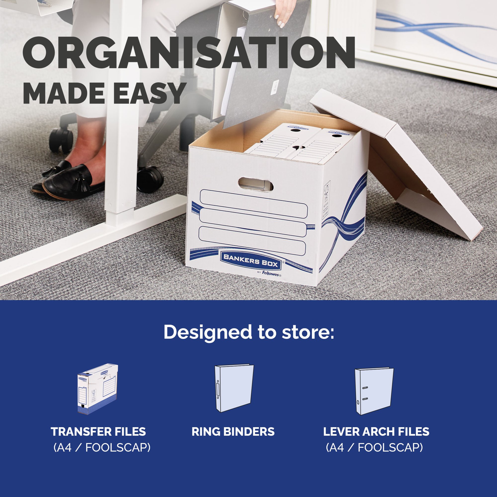 Medium-Duty stackable storage box that will also hold level arch files.