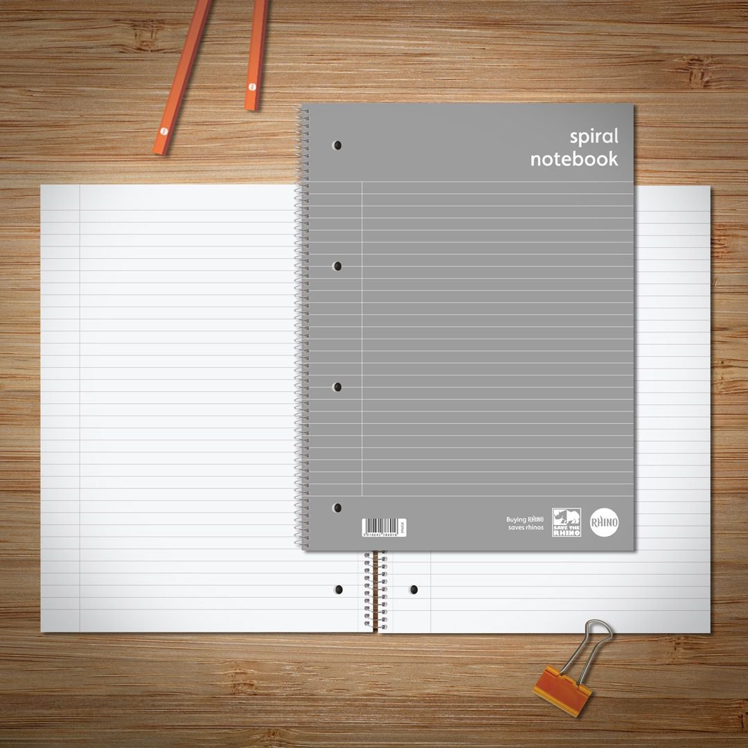 RHINO Spiral Notebook A4+ with 140 pages each ruled with 8mm lines and a margin. This notebook can be used as a refill pad, journal, organiser or for everyday notetaking in the office, it is designed to keep your important notes safe and secure.