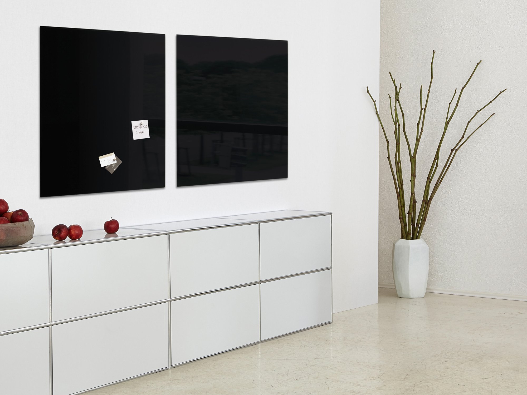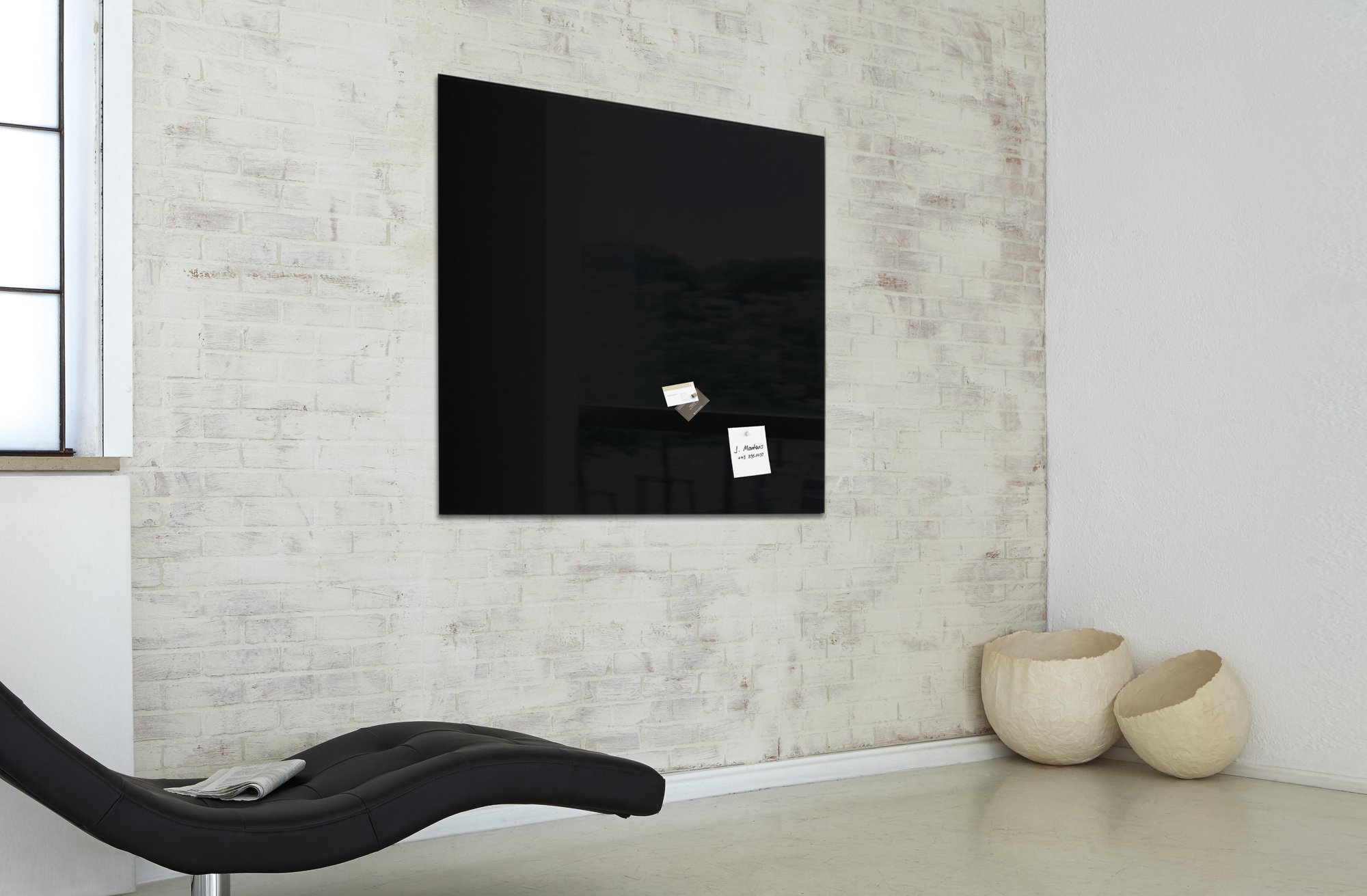 As an agile tool, the large magnetic glass boards are ideal for creative brainstorming sessions and contemporary work methods such as Scrum, Kanban, Design Thinking and much more besides. The magnetic glass board in 100 x 100 cm format in black is the perfect setting for your ideas and eye-catching on any wall.<br><br>Box contents: 1x Glass whiteboard, screws, anchors for solid walls, mounting instructions incl. drilling template, 2 extra-strong SuperDym magnets GL705 (silver, cube design)