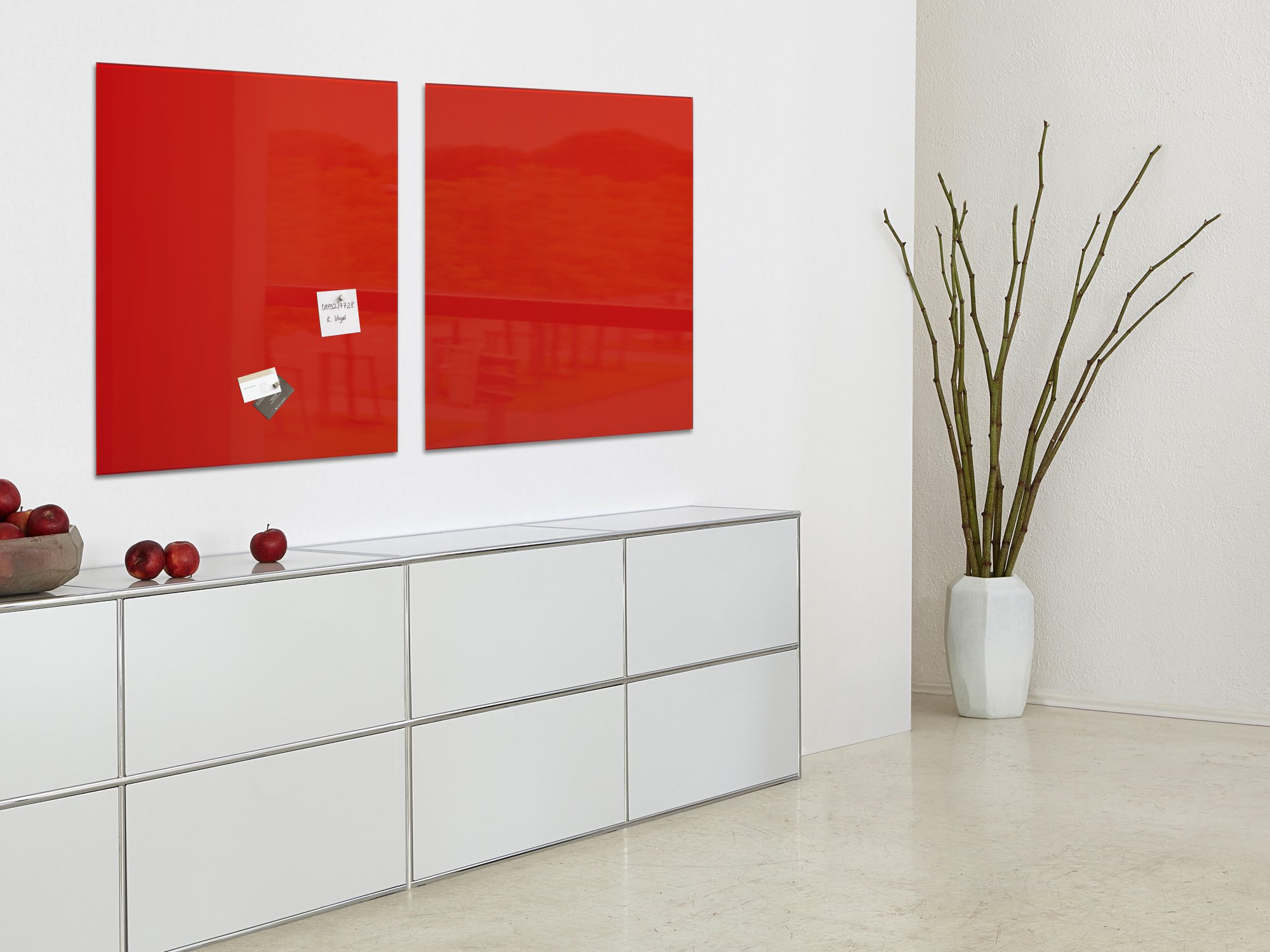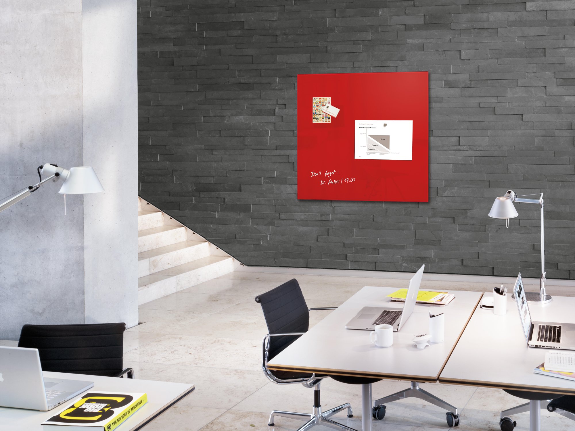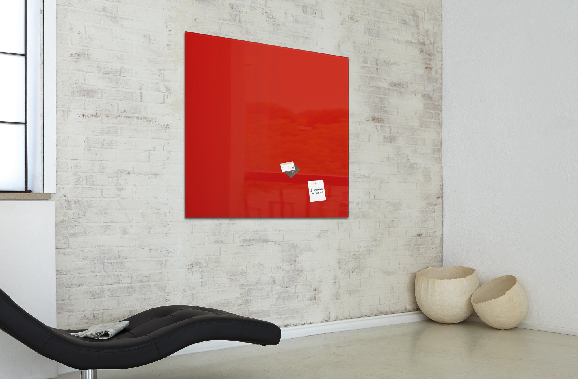 As an agile tool, the large magnetic glass boards are ideal for creative brainstorming sessions and contemporary work methods such as Scrum, Kanban, Design Thinking and much more besides. The magnetic glass board in 100 x 100 cm format in red is the perfect setting for your ideas and eye-catching on any wall.<br><br>Box contents: 1x Glass whiteboard, screws, anchors for solid walls, mounting instructions incl. drilling template, 2 extra-strong SuperDym magnets GL705 (silver, cube design)