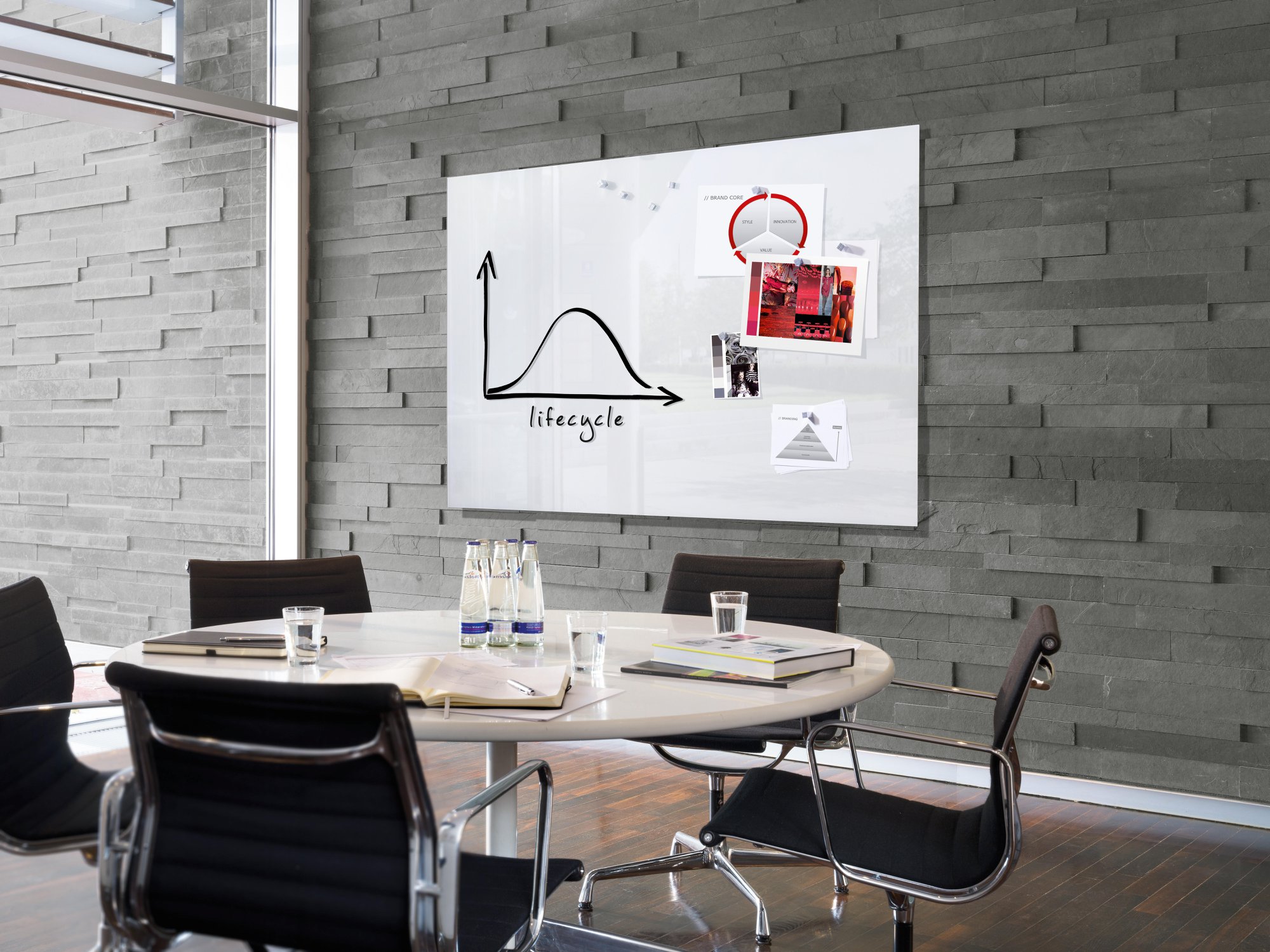 As an agile tool, the large magnetic glass boards are ideal for creative brainstorming sessions and contemporary work methods such as Scrum, Kanban, Design Thinking and much more besides. The magnetic glass board in 120 x 90 cm format in super white is the perfect setting for your ideas and eye-catching on any wall. The super-white magnetic glass boards from the SIGEL range do not have a green shimmer.<br><br>Box contents: 1x Glass whiteboard, screws, anchors for solid walls, mounting instructions incl. drilling template, 2 extra-strong SuperDym magnets GL705 (silver, cube design)