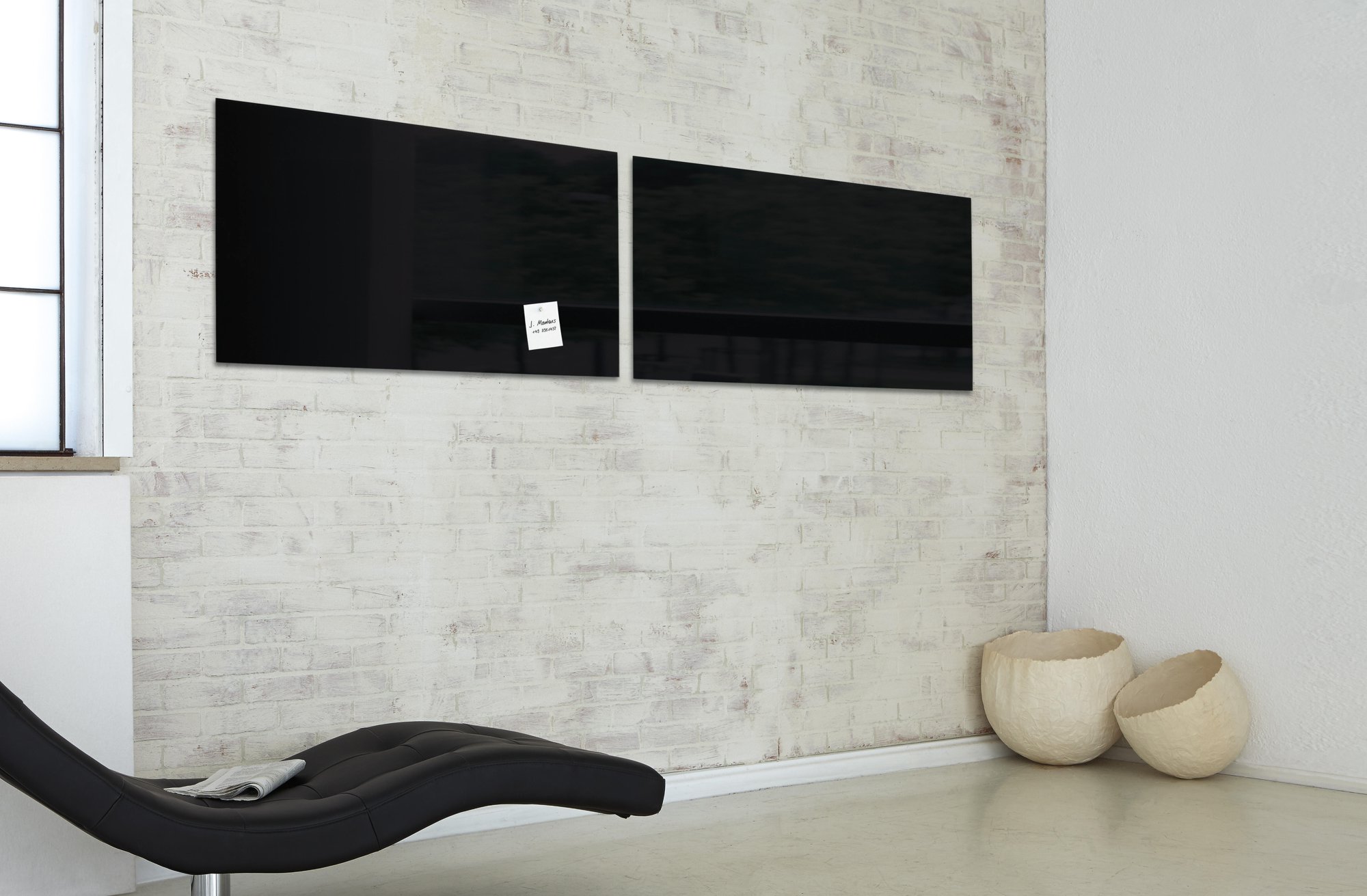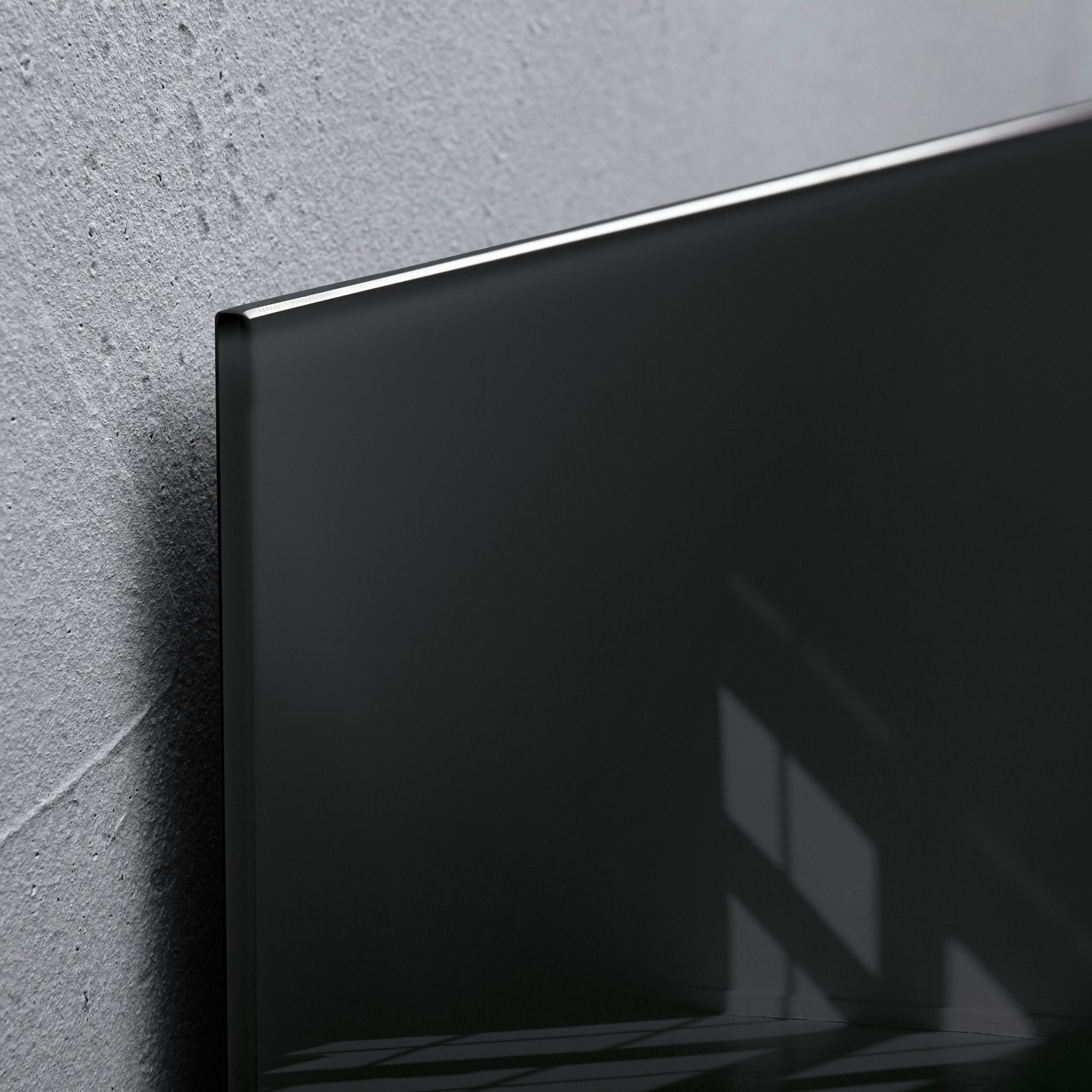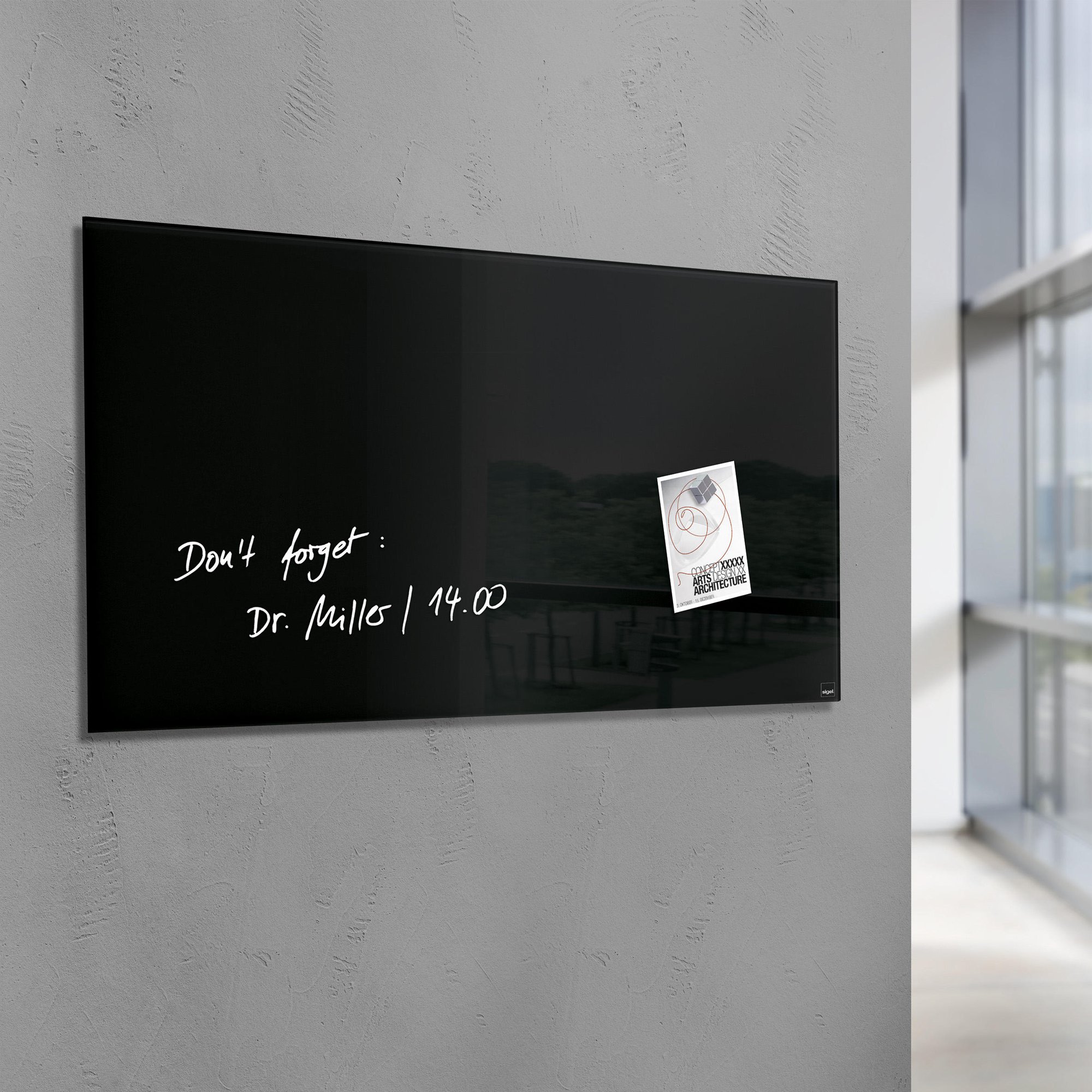 As an agile tool, the large magnetic glass boards are ideal for creative brainstorming sessions and contemporary work methods such as Scrum, Kanban, Design Thinking and much more besides. The magnetic glass board in 130 x 55 cm format in black is the perfect setting for your ideas and eye-catching on any wall.<br><br>Box contents: 1x Glass whiteboard, screws, anchors for solid walls, mounting instructions incl. drilling template, 2 extra-strong SuperDym magnets GL705 (silver, cube design)