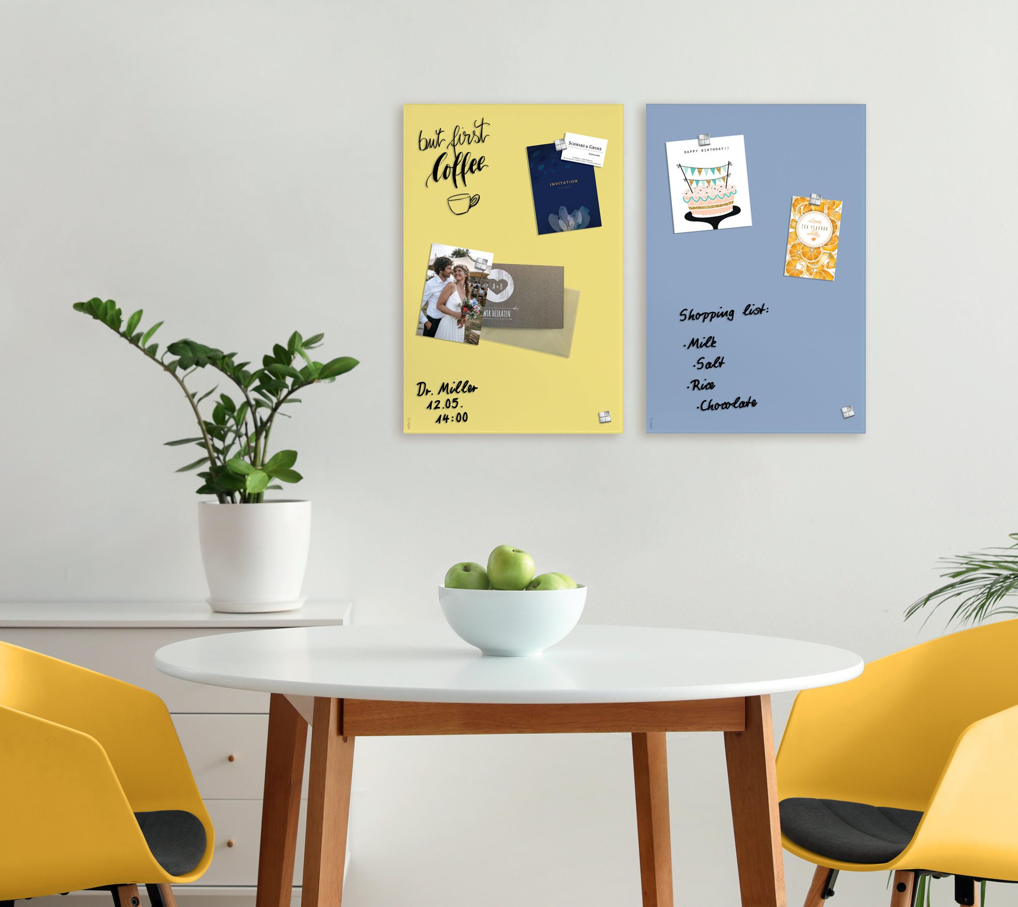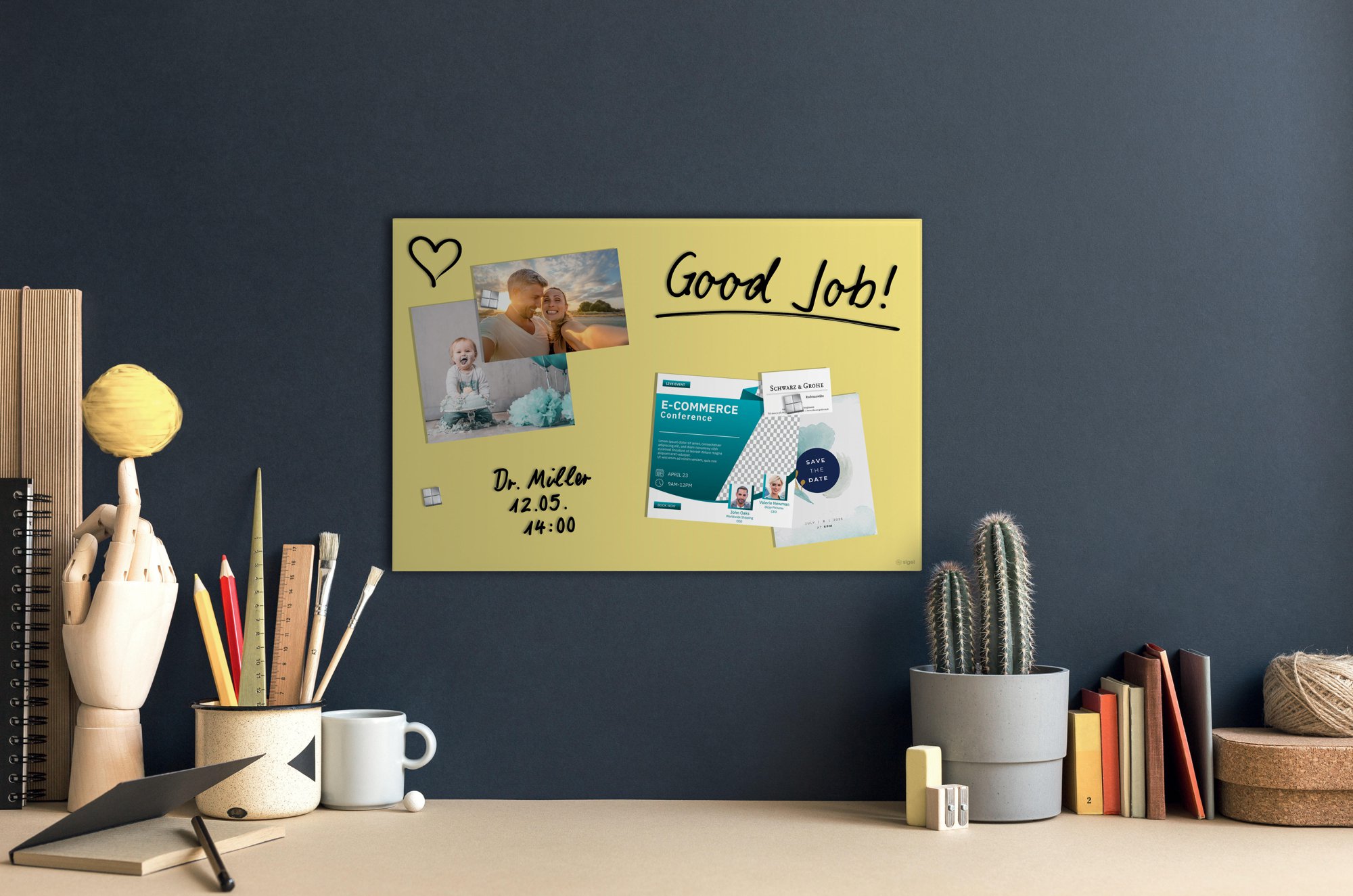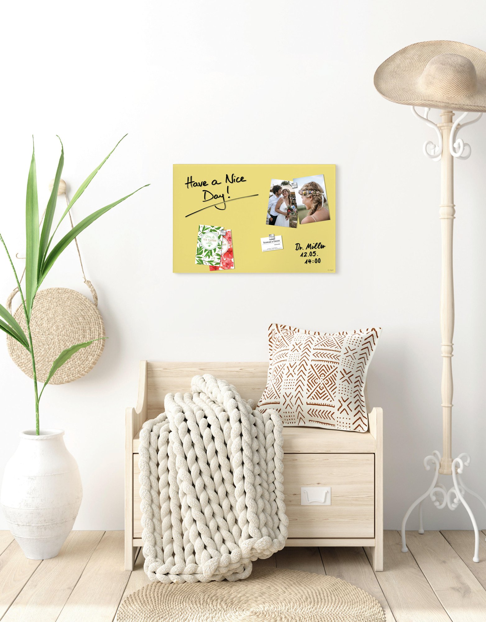 The Artverum magnetic glass board with its writable surface is a must-have in any home office as a modern alternative to a pinboard or classic whiteboard. Give free rein to your ideas: use the magnetic glass board to clearly list your to dos and visualise your ideas so you never lose track. Magnetic board in the 60 x 40 cm format in pastel yellow with minimal glare or reflection.<br><br>Box contents: 1x Magnetic Glass Board, screws, anchors for solid walls, mounting instructions incl. drilling template, 3 extra-strong SuperDym magnets GL705 (silver, cube design)