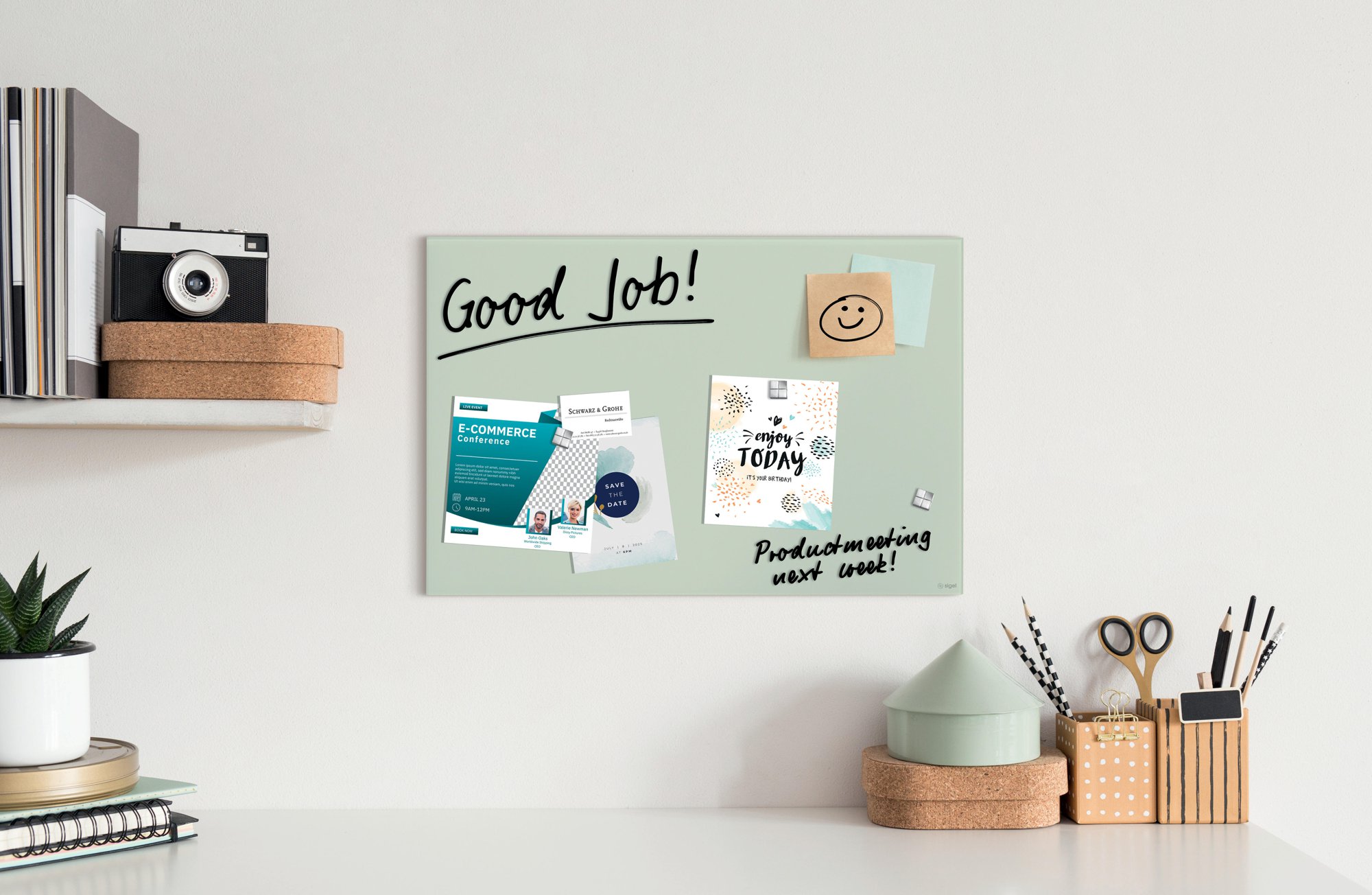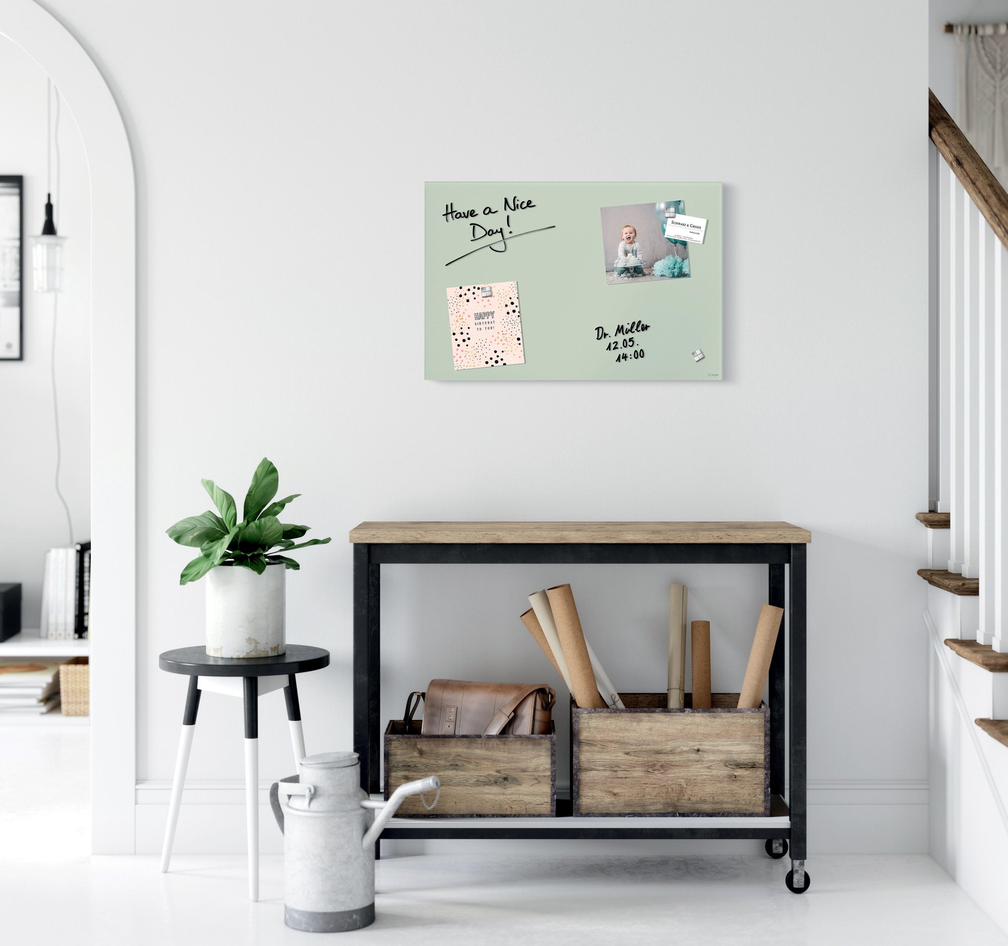 The Artverum magnetic glass board with its writable surface is a must-have in any home office as a modern alternative to a pinboard or classic whiteboard. Give free rein to your ideas: use the magnetic glass board to clearly list your to dos and visualise your ideas so you never lose track. Magnetic board in the 60 x 40 cm format in mint with minimal glare or reflection.<br><br>Box contents: 1x Magnetic Glass Board, screws, anchors for solid walls, mounting instructions incl. drilling template, 3 extra-strong SuperDym magnets GL705 (silver, cube design)
