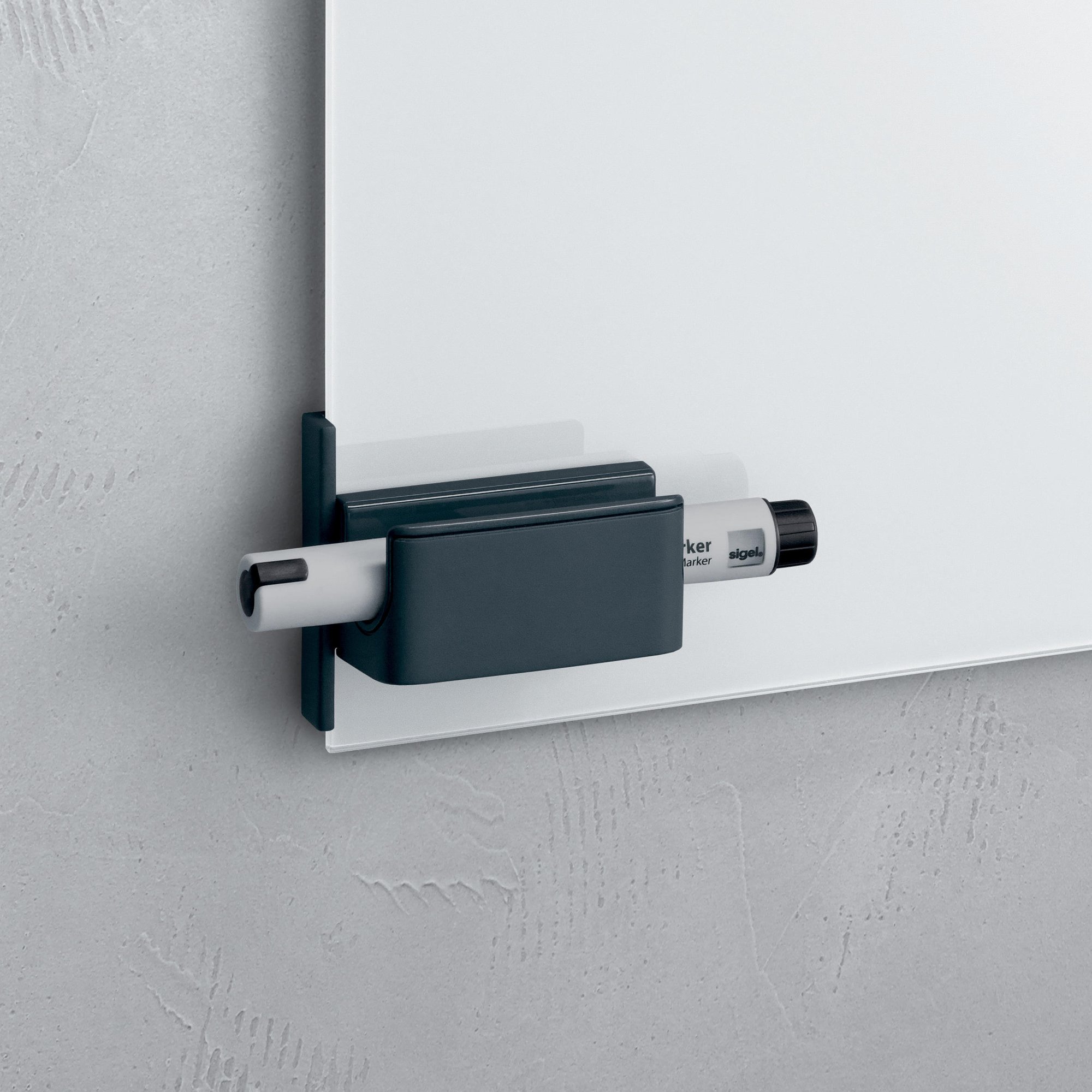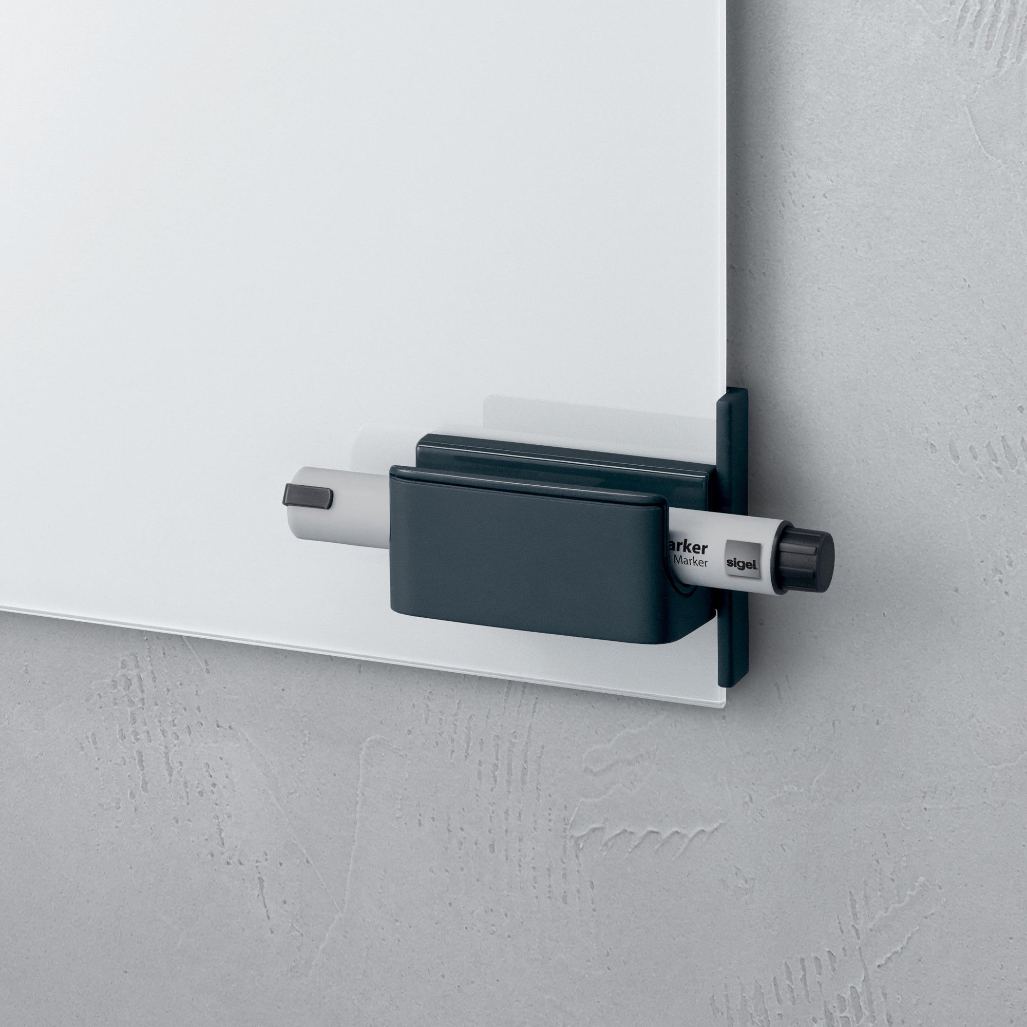 The innovative Clip & Organise accessories system is exclusive to SIGEL and is extremely practical when working with the Artverum magnetic glass boards and glass whiteboards. Classy and practical at the same time: Clip & Organise Pen holder in anthracite, 7,5 x 3,7 cm in size, for glass boards, holds up to 400. Incl. magnetic clip to attach to your Artverum magnetic glass board or your glass whiteboard.<br><br>Box contents: 1x GL800 Pen holder