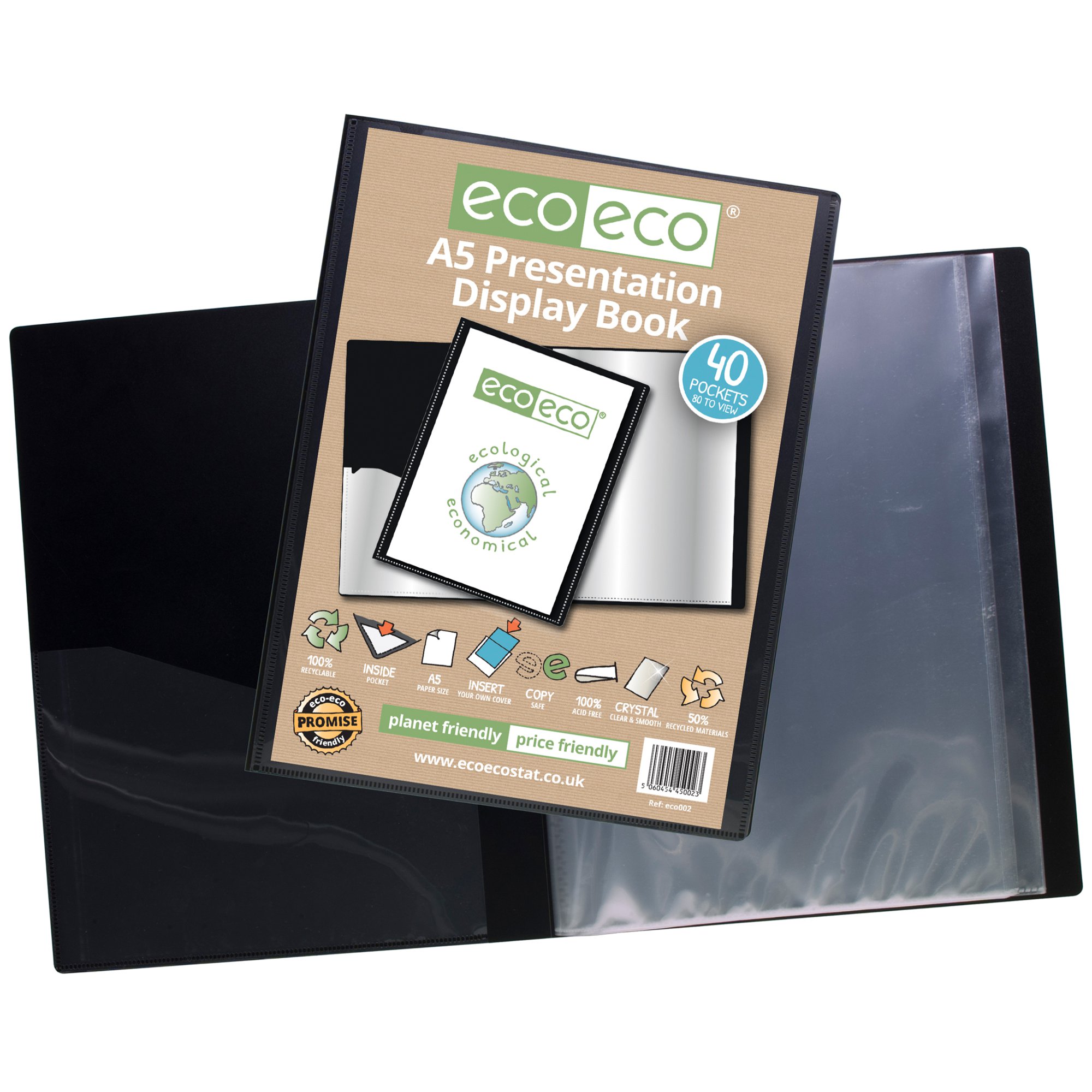 Strong black 600 micron cover display book with clear 160 micron A5 size sleeve on front cover for personalisation and presentation. Clear additional storage pocket featured inside of front cover to house loose items and documents. A total of 40 pages (80 sides to view) securely bound for optimum and multi-purpose filing. 50 micron pages are acid free, smooth, glass clear and copy safe. These pages securely hold A5 documents. Responsibly sourced materials and responsibly produced. Made from 50% recycled materials, product and packaging both 100% recyclable.