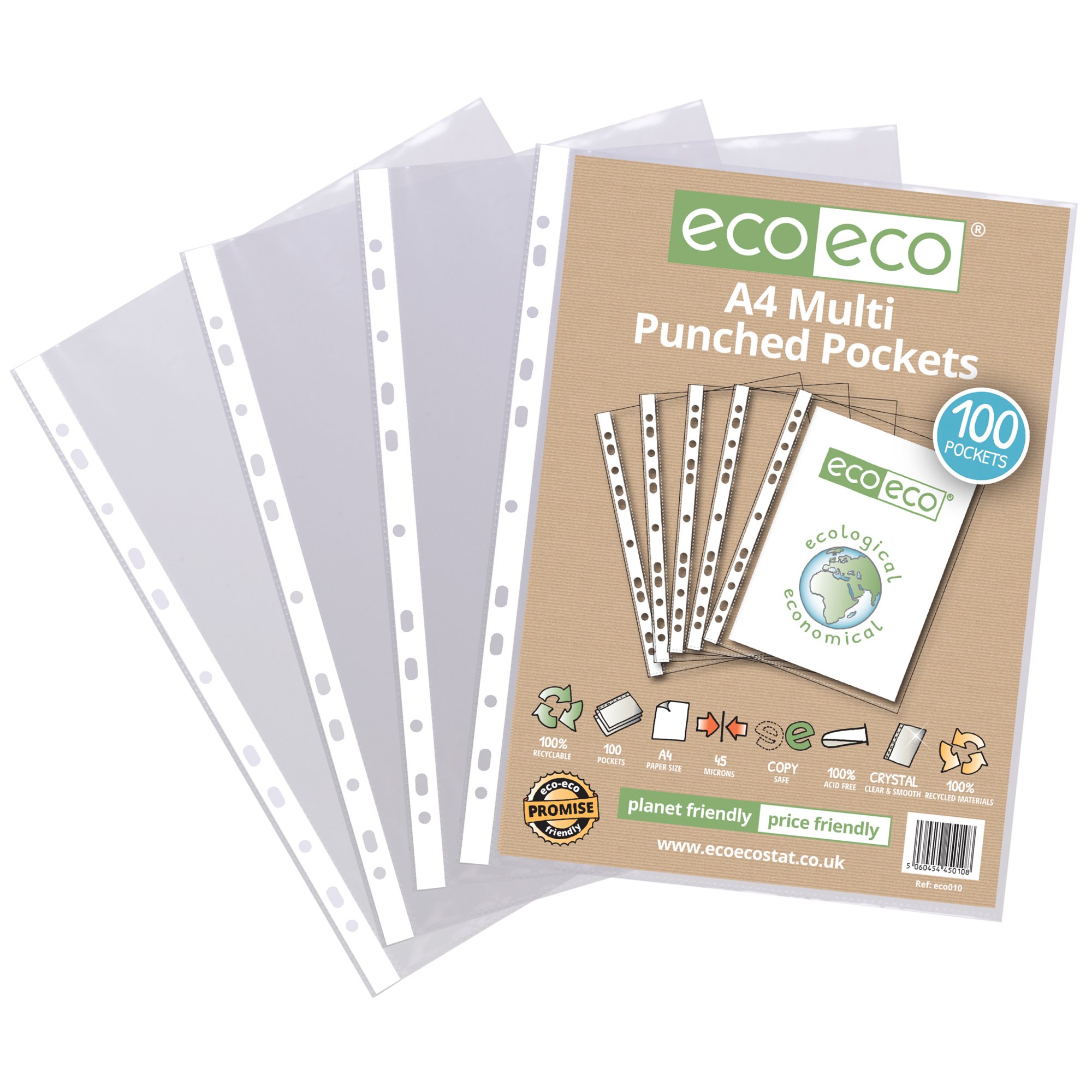 Strong 45 micron strength wallets, ideal for home, office and professional use. These pockets securely hold A4 documents. 100 pockets per single pack. Glass clear visibility with smooth finish. Multi-punched spine for universal filing. Acid free and copy safe. Responsibly sourced materials and responsibly produced. Made from 100% recycled materials, product and packaging both 100% recyclable.