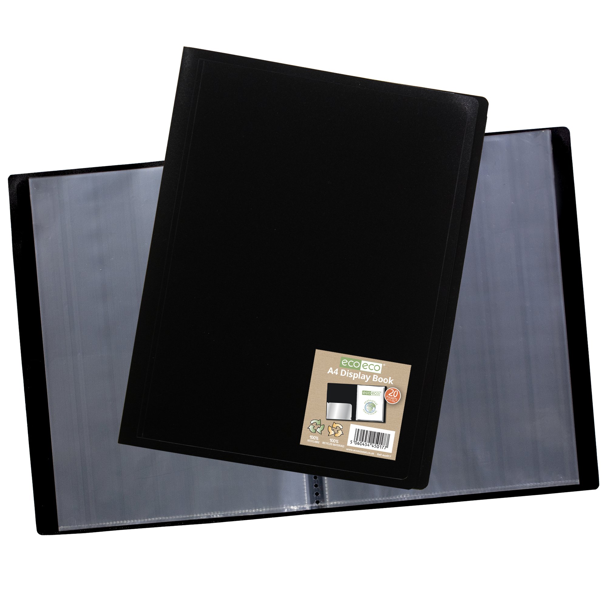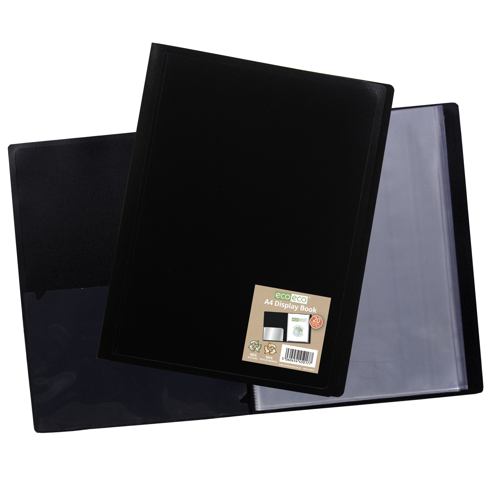 Strong and flexible black 400 micron cover display book, ideal for home, office and professional use. Clear additional storage pocket featured inside of front cover to house loose items and documents. A total of 20 pages (40 sides to view) securely bound for optimum and multi-purpose filing. 40 micron pages are acid free, smooth, glass clear and copy safe. These pages securely hold A4 documents. Made from 100% recycled materials, product and packaging both 100% recyclable.