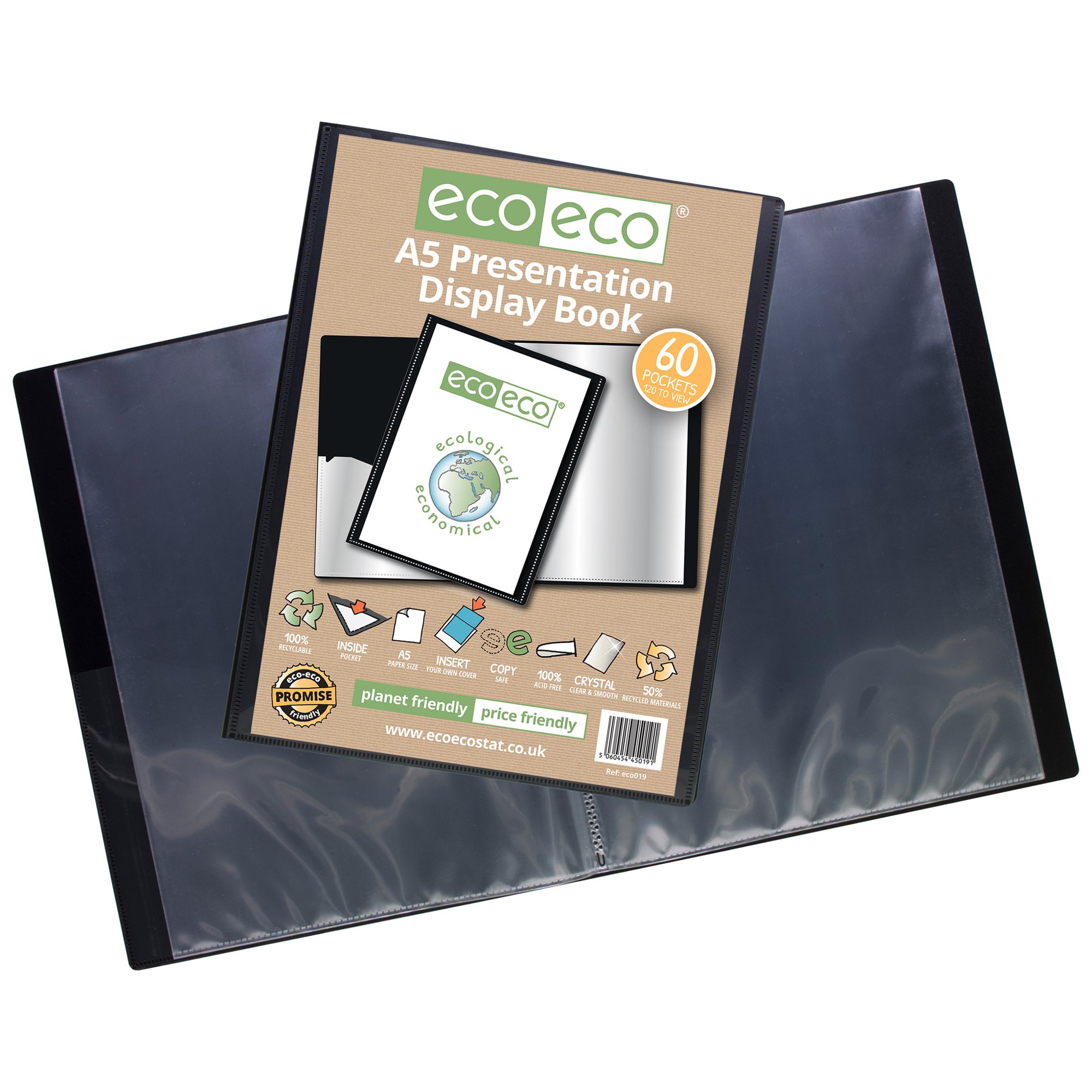Strong black 600 micron cover display book with clear 160 micron A5 size sleeve on front cover for personalisation and presentation. Clear additional storage pocket featured inside of front cover to house loose items and documents. A total of 60 pages (120 sides to view) securely bound for optimum and multi-purpose filing. 50 micron pages are acid free, smooth, glass clear and copy safe. These pages securely hold A5 documents. Responsibly sourced materials and responsibly produced. Made from 50% recycled materials, product and packaging both 100% recyclable.