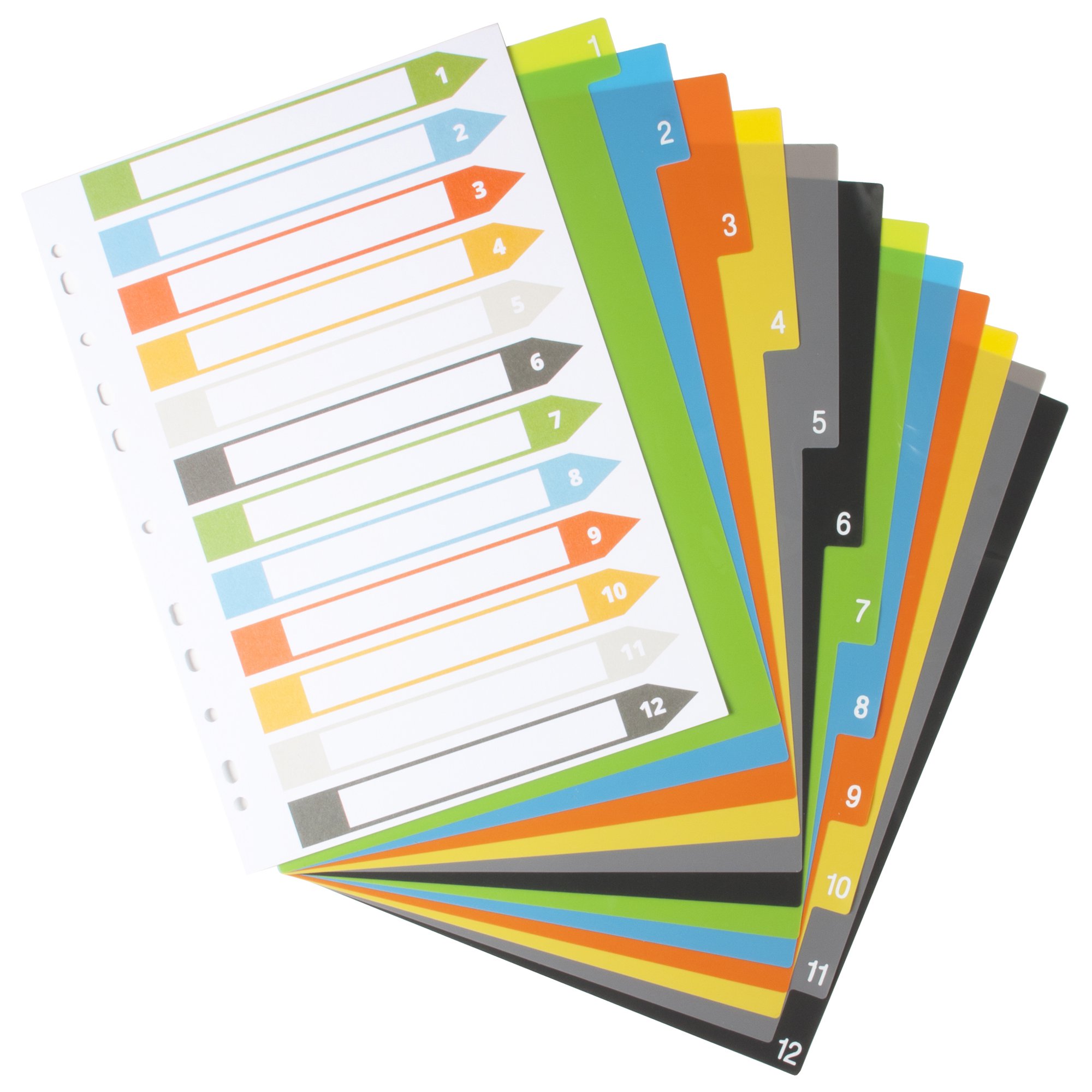 Strong 200 micron strength A4 size index file dividers, ideal for home, office and professional use. Set of 12 dividers colour coded and numbered 1 to 12 for the filing and organising of paperwork and documents in ring binders and files. Includes a contents page for easy referencing, templates can be downloaded from our website. Responsibly sourced materials and responsibly produced. Made from 50% recycled materials, product and packaging both 100% recyclable.