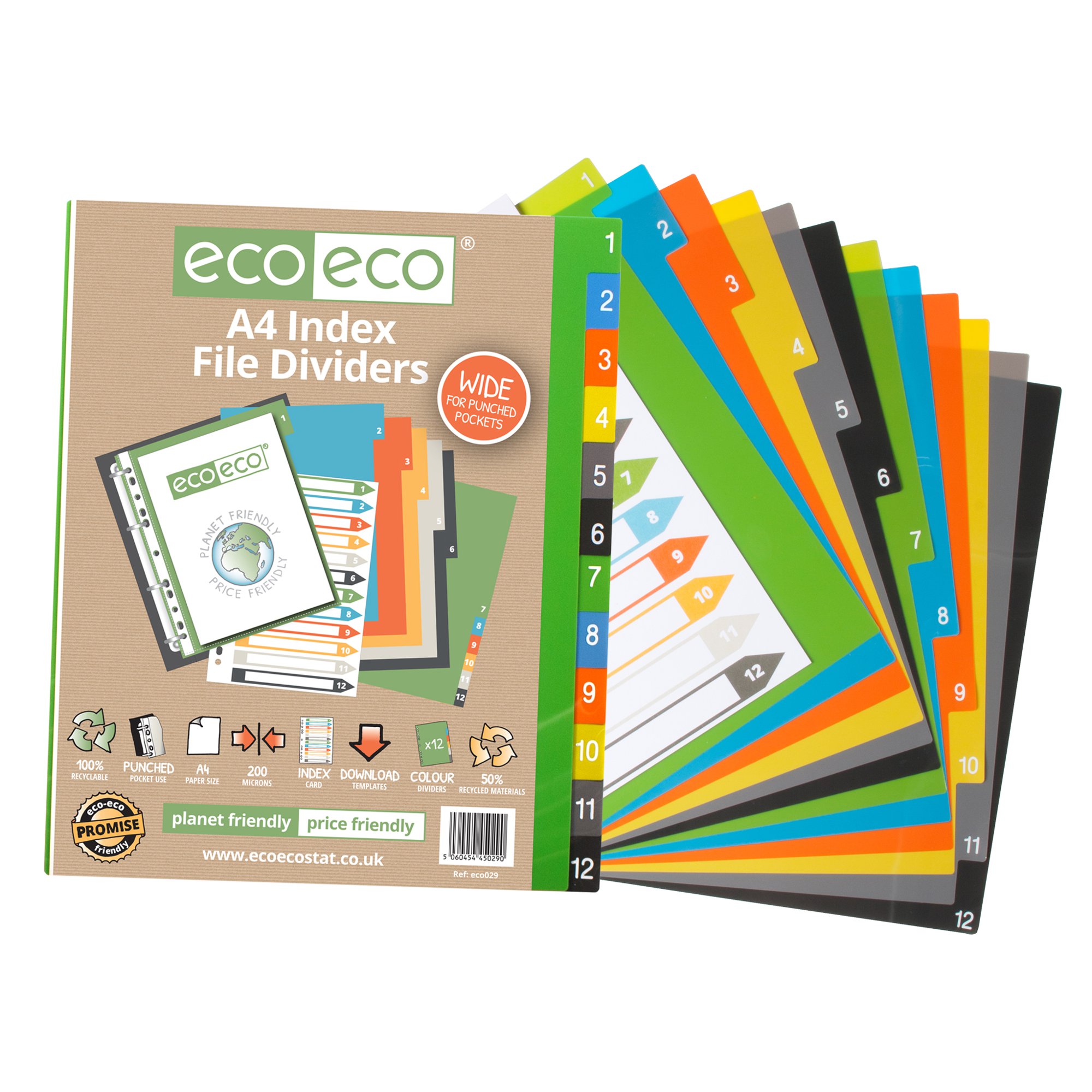 Strong 200 micron strength A4 size index file dividers, ideal for home, office and professional use. Set of 12 dividers colour coded and numbered 1 to 12 for the filing and organising of paperwork and documents in ring binders and files. Includes a contents page for easy referencing, templates can be downloaded from our website. Extra wide for use with multi-punched pockets. Responsibly sourced materials and responsibly produced. Made from 50% recycled materials, product and packaging both 100% recyclable.