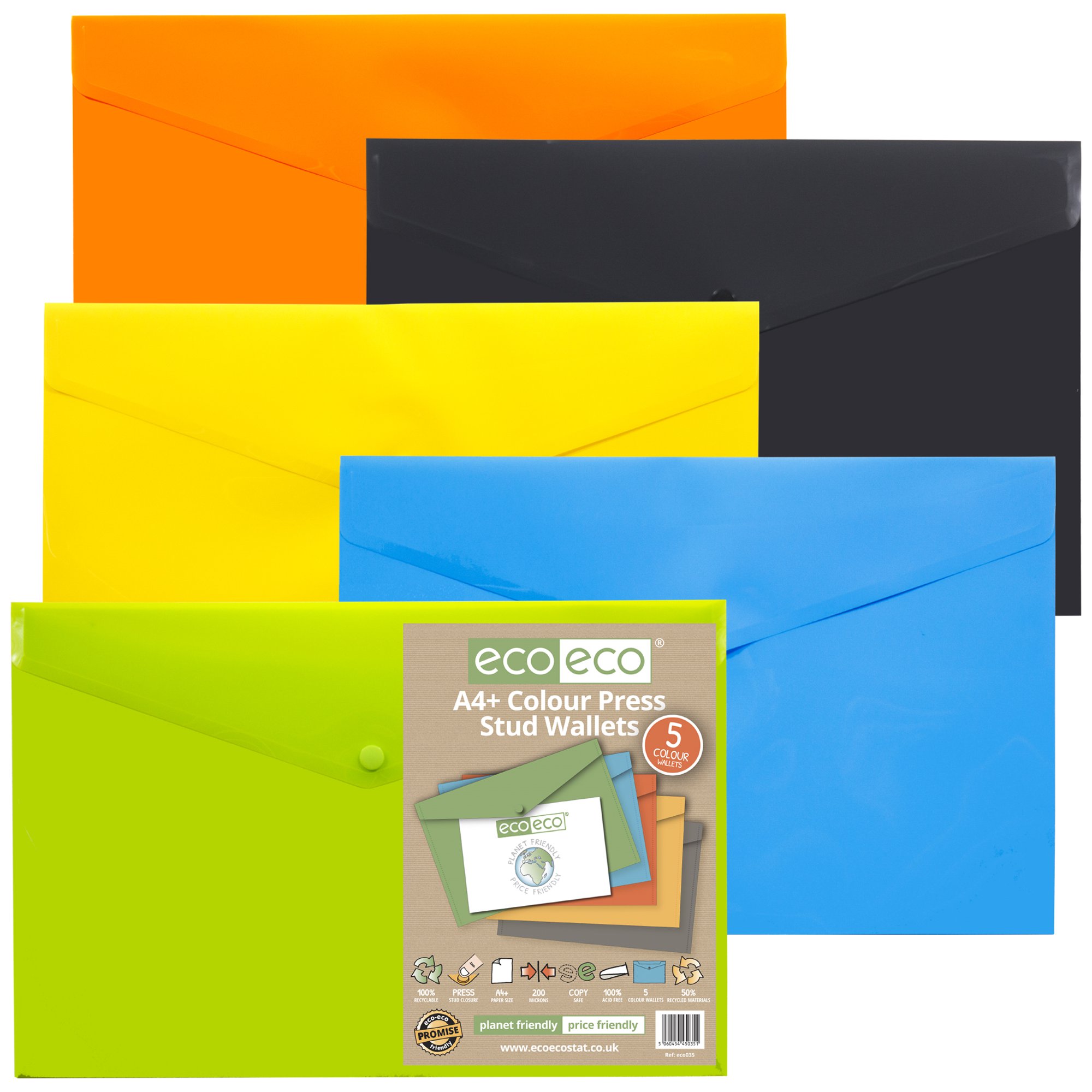 Strong 200 micron strength coloured A4+ size wallets, ideal for home, office and professional use. These wallets securely hold A4 and foolscap documents with a press stud closure. 5 wallets per single pack. 5 colours with smooth finish and superior strength. Acid free and copy safe. Responsibly sourced materials and responsibly produced. Made from 50% recycled materials, product and packaging both 100% recyclable.