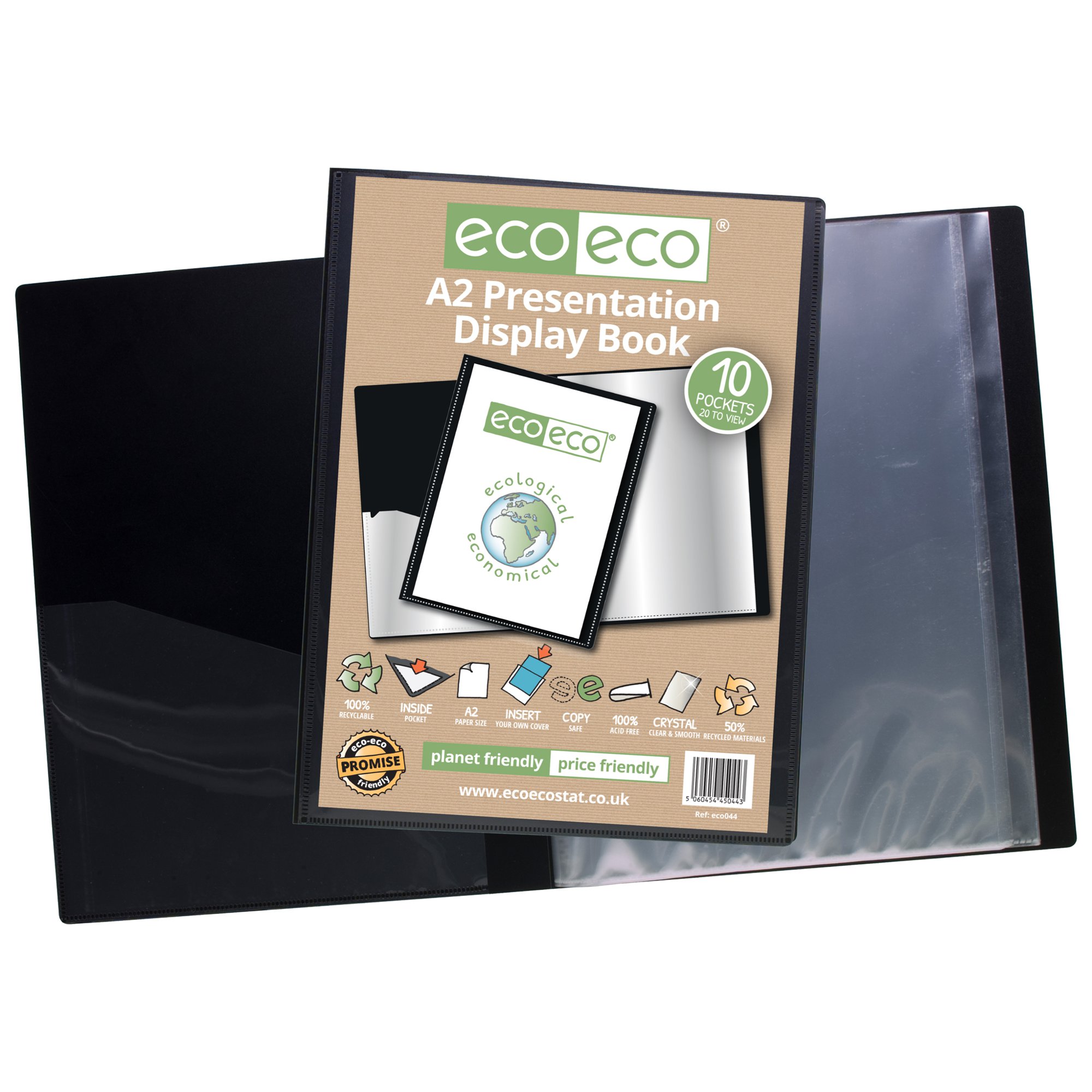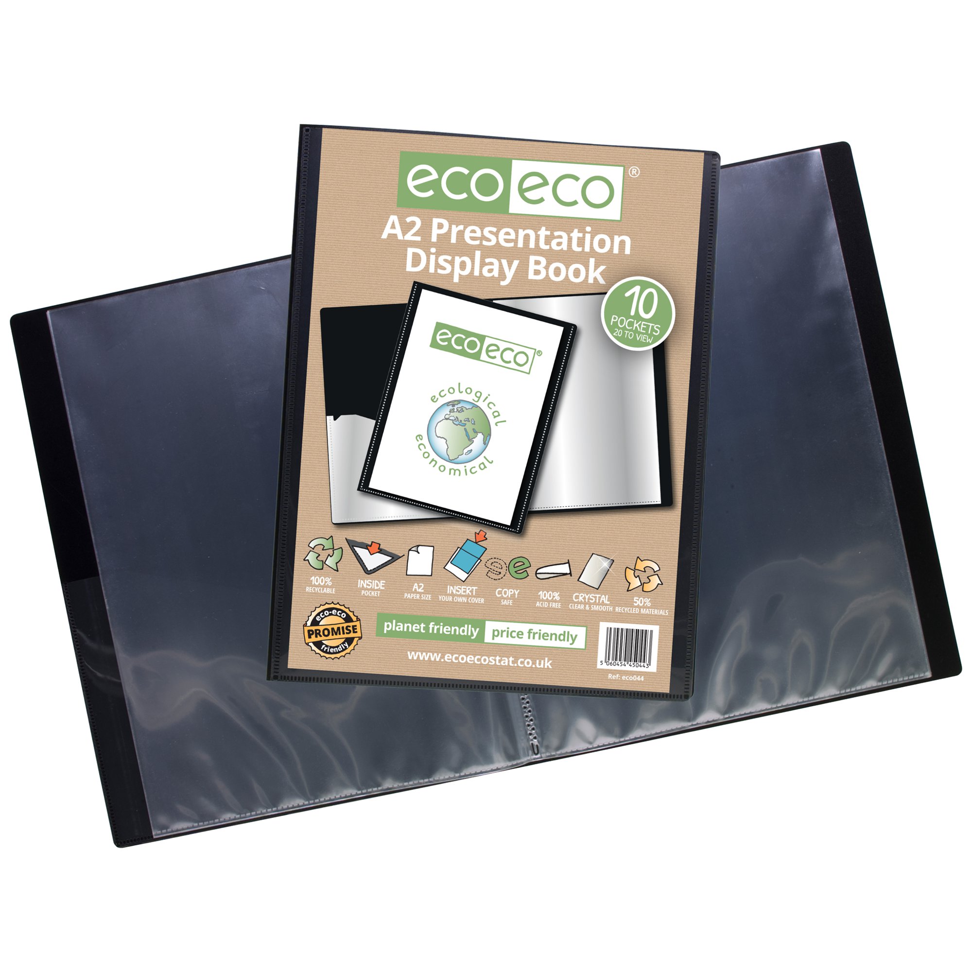 Strong black 1000 micron cover display book with clear 160 micron A2 size sleeve on front cover for personalisation and presentation. Clear additional storage pocket featured inside of front cover to house loose items and documents. A total of 10 pages (20 sides to view) securely bound for optimum and multi-purpose filing. 50 micron pages are acid free, smooth, glass clear and copy safe. These pages securely hold A2 documents. Responsibly sourced materials and responsibly produced. Made from 50% recycled materials, product and packaging both 100% recyclable.