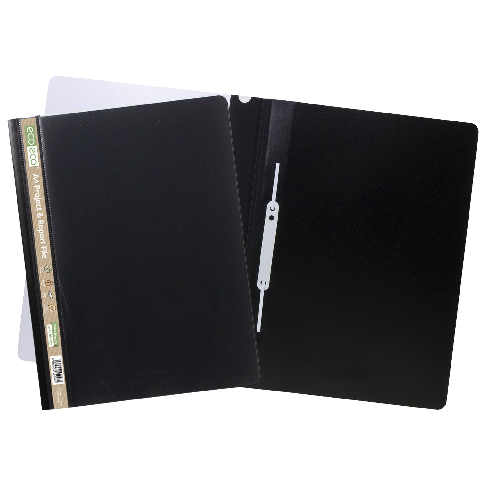 Strong A4 file, perfect for projects and reports, ideal for home, office and professional use. This file securely holds up to 25 sheets of punched A4 paper (80gsm) with its 2 pronged mechanism. Clear front cover 180 micron and black back cover 350 micron. Removeable spine presentation card for personalisation. Responsibly sourced materials and responsibly produced. Made from 50% recycled materials, product and packaging both 100% recyclable.
