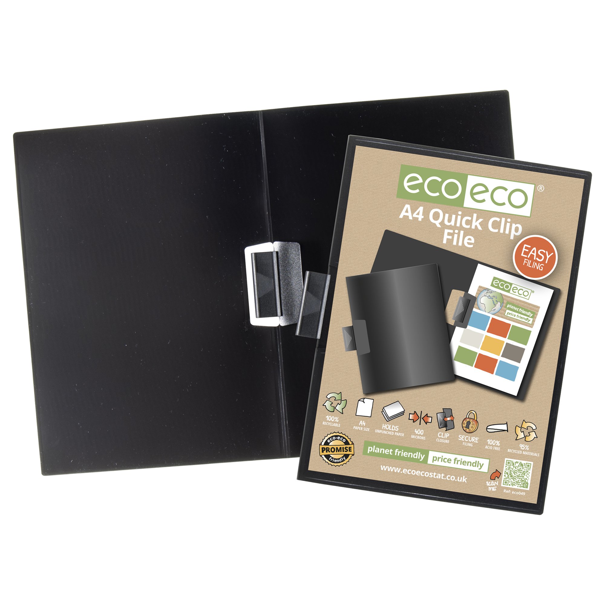 Strong black 400 micron cover A4 clip file, ideal for home, office and professional use. This file securely holds up to 25 sheets of unpunched A4 paper (80gsm) with its quick clip mechanism. Responsibly sourced materials and responsibly produced. Made from 95% recycled materials, product and packaging both 100% recyclable.