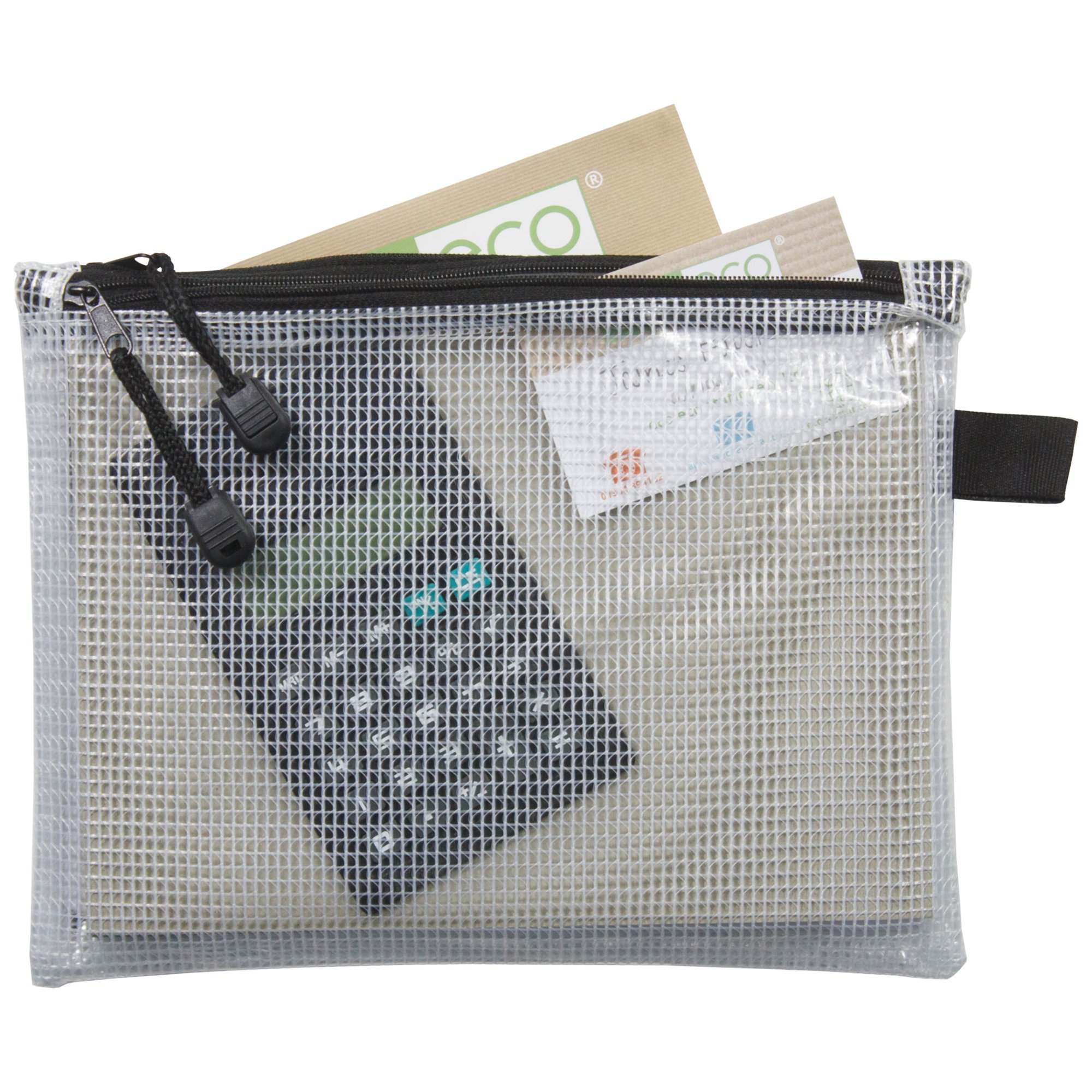 Strong reinforced 330 micron strength 230mm x 180mm size twin pocket bags, ideal for keeping items dry and safe. Water resistant with a clear smooth finish. 2 black zippers with a puller and hanging loop. Responsibly sourced materials and responsibly produced. Made from 90% recycled materials, product and packaging both 100% recyclable.