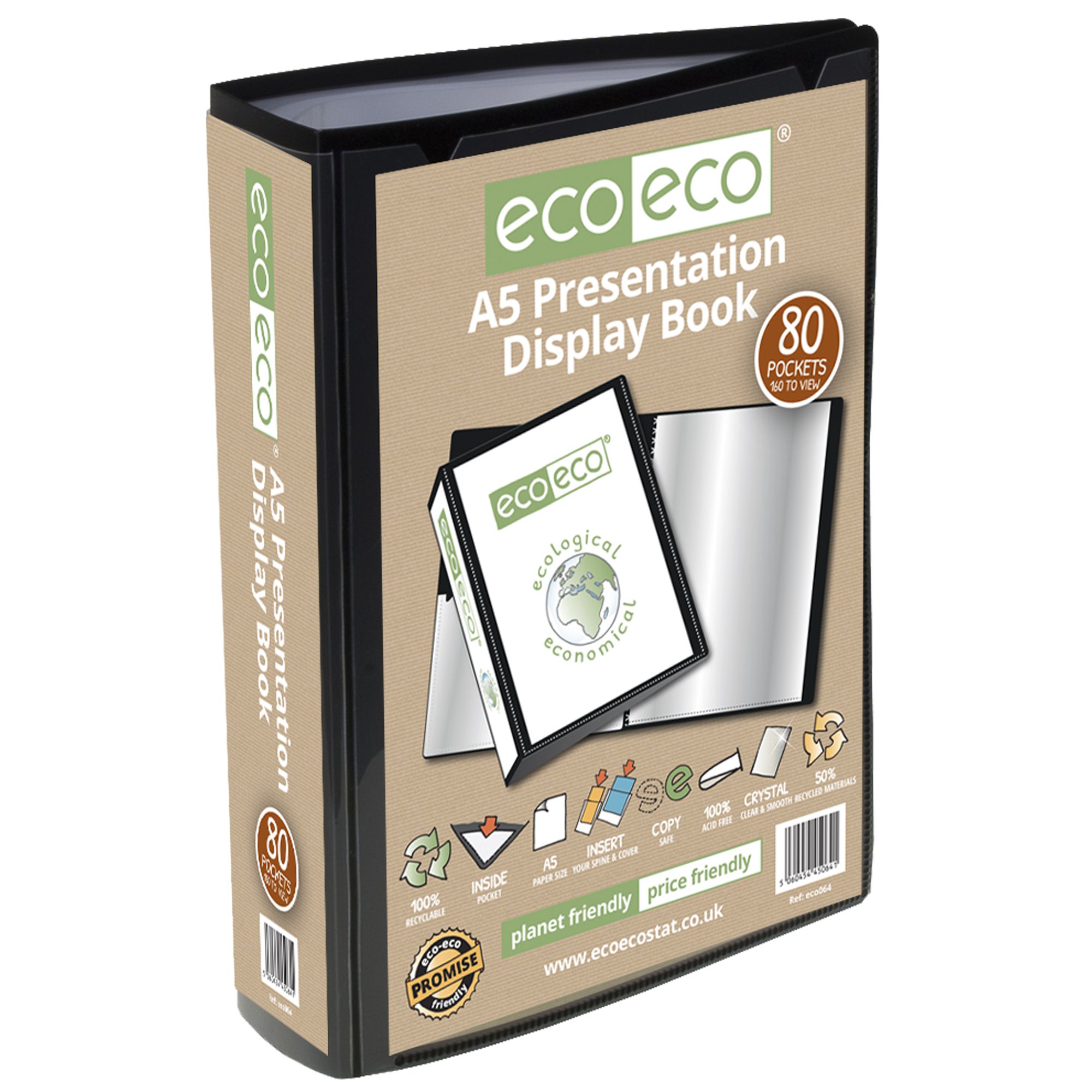 Strong black 700 micron cover display book with clear 160 micron A5 size sleeve on front cover for personalisation and presentation. Clear additional storage pocket featured inside of front cover to house loose items and documents. A total of 80 pages (160 sides to view) securely bound for optimum and multi-purpose filing. 50 micron pages are acid free, smooth, glass clear and copy safe. These pages securely hold A5 documents. Responsibly sourced materials and responsibly produced. Made from 50% recycled materials, product and packaging both 100% recyclable.