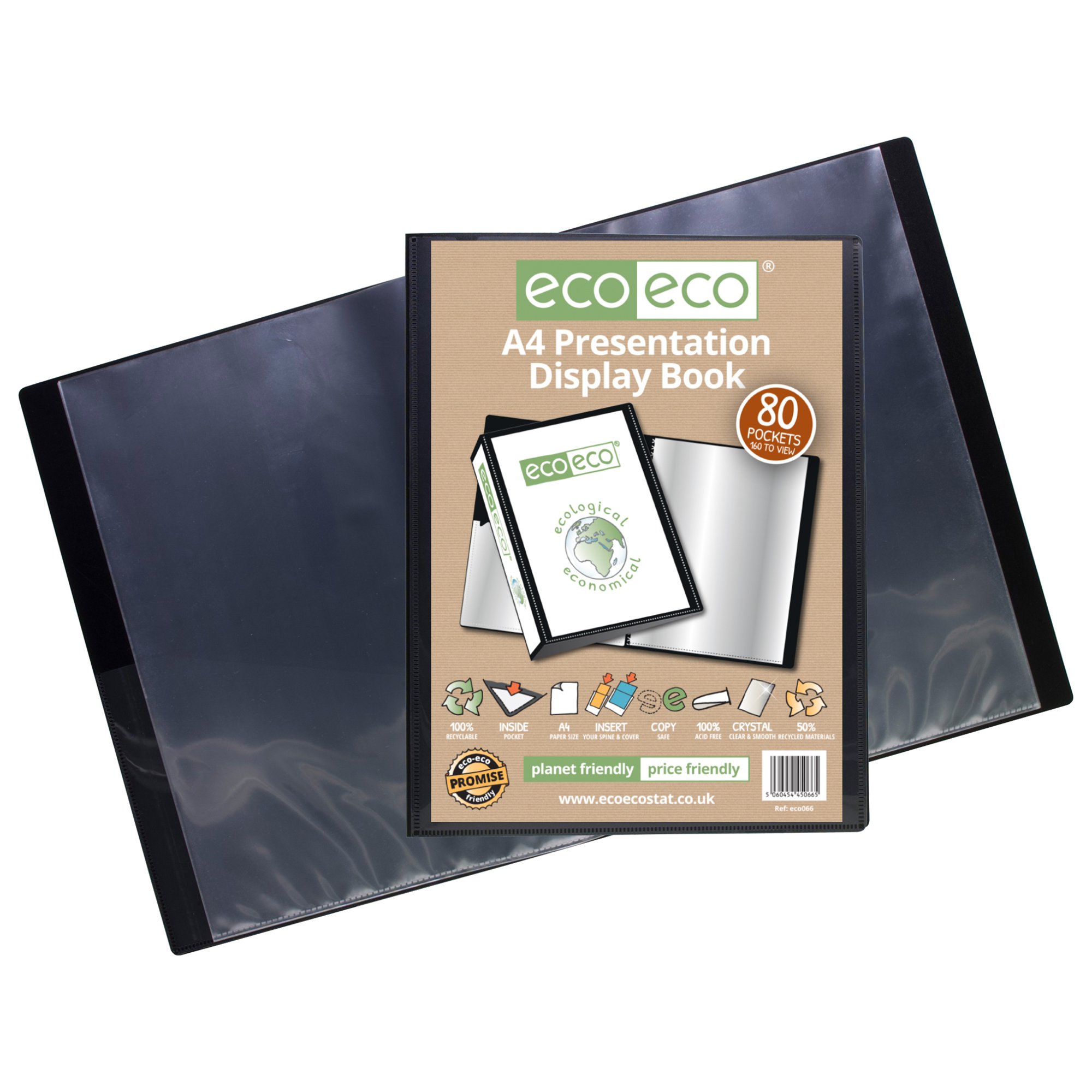 Strong black 900 micron cover display book with clear 160 micron A4 size sleeve on front cover for personalisation and presentation. Clear additional storage pocket featured inside of front cover to house loose items and documents. A total of 80 pages (160 sides to view) securely bound for optimum and multi-purpose filing. 50 micron pages are acid free, smooth, glass clear and copy safe. These pages securely hold A4 documents. Responsibly sourced materials and responsibly produced. Made from 50% recycled materials, product and packaging both 100% recyclable.