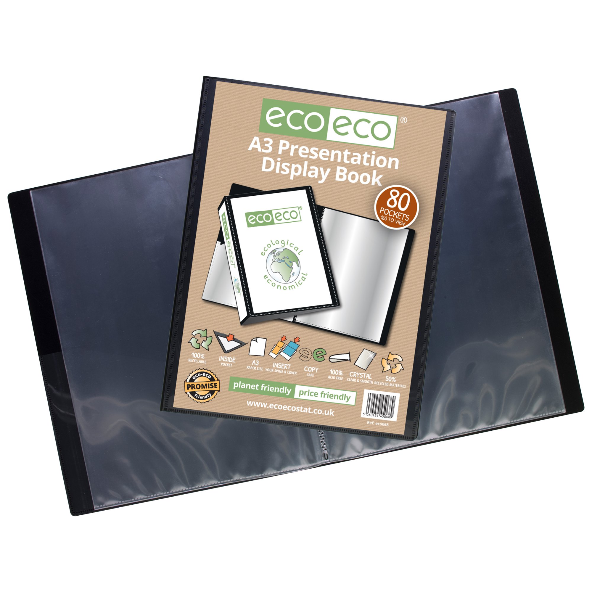 Strong black 1000 micron cover display book with clear 160 micron A3 size sleeve on front cover for personalisation and presentation. Clear additional storage pocket featured inside of front cover to house loose items and documents. A total of 80 pages (160 sides to view) securely bound for optimum and multi-purpose filing. 50 micron pages are acid free, smooth, glass clear and copy safe. These pages securely hold A3 documents. Responsibly sourced materials and responsibly produced. Made from 50% recycled materials, product and packaging both 100% recyclable.