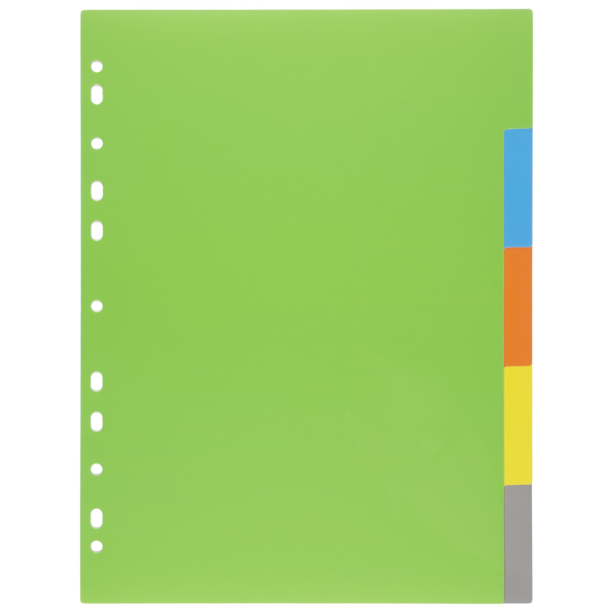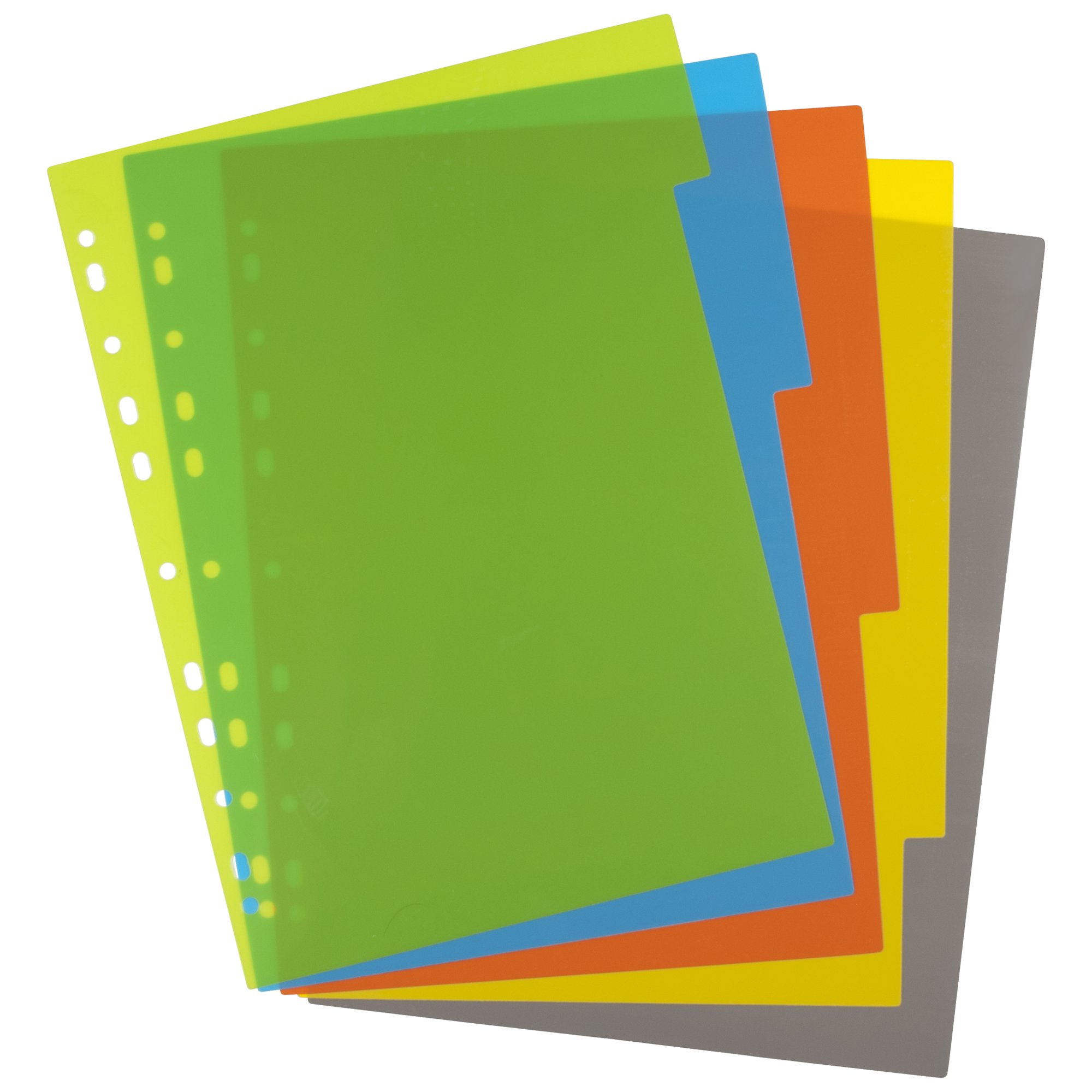 Strong 200 micron strength A4 size file dividers, ideal for home, office and professional use. Set of 5 dividers colour coded for the filing and organising of paperwork and documents in ring binders and files. Contents page templates can be downloaded from our website. Responsibly sourced materials and responsibly produced. Made from 50% recycled materials, product and packaging both 100% recyclable.