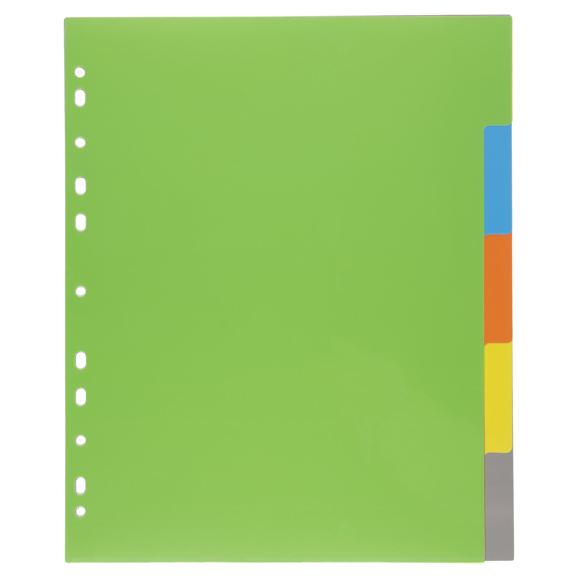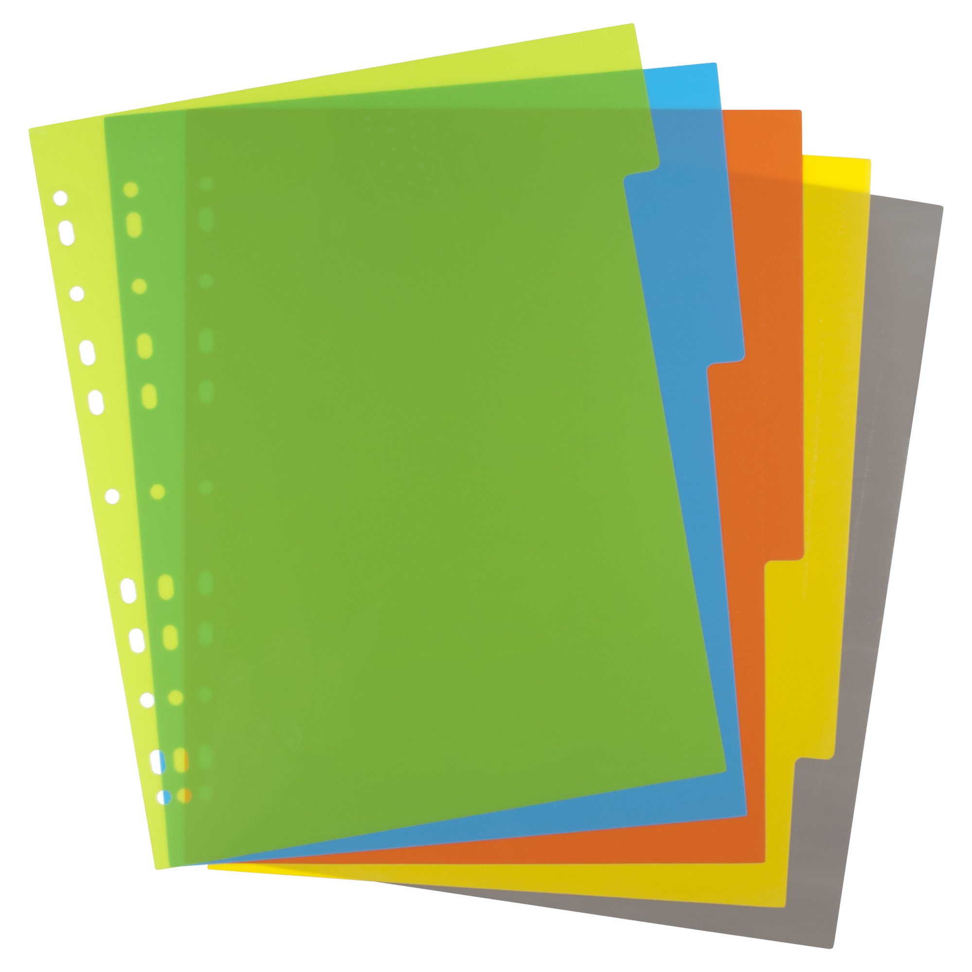 Strong 200 micron strength A4 size file dividers, ideal for home, office and professional use. Set of 5 dividers colour coded for the filing and organising of paperwork and documents in ring binders and files. Extra wide for use with multi-punched pockets. Contents page templates can be downloaded from our website. Responsibly sourced materials and responsibly produced. Made from 50% recycled materials, product and packaging both 100% recyclable.