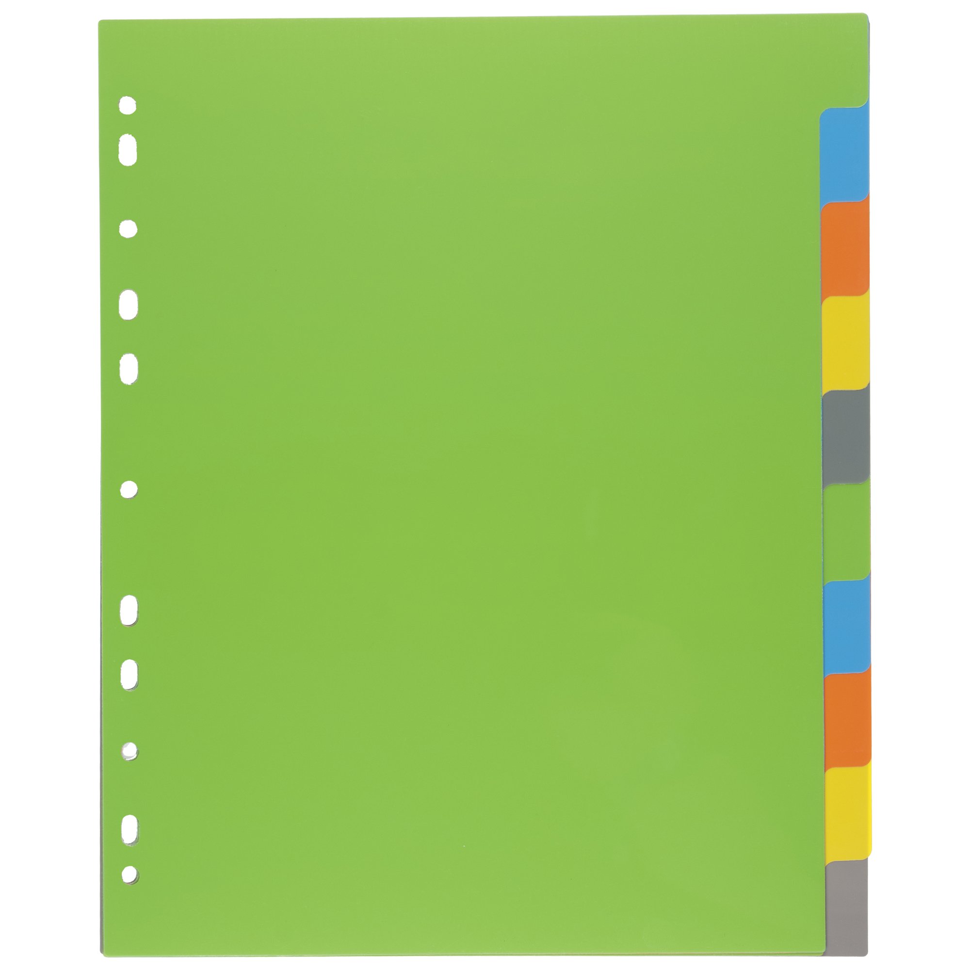 Strong 200 micron strength A4 size file dividers, ideal for home, office and professional use. Set of 10 dividers colour coded for the filing and organising of paperwork and documents in ring binders and files. Extra wide for use with multi-punched pockets. Contents page templates can be downloaded from our website. Responsibly sourced materials and responsibly produced. Made from 50% recycled materials, product and packaging both 100% recyclable.