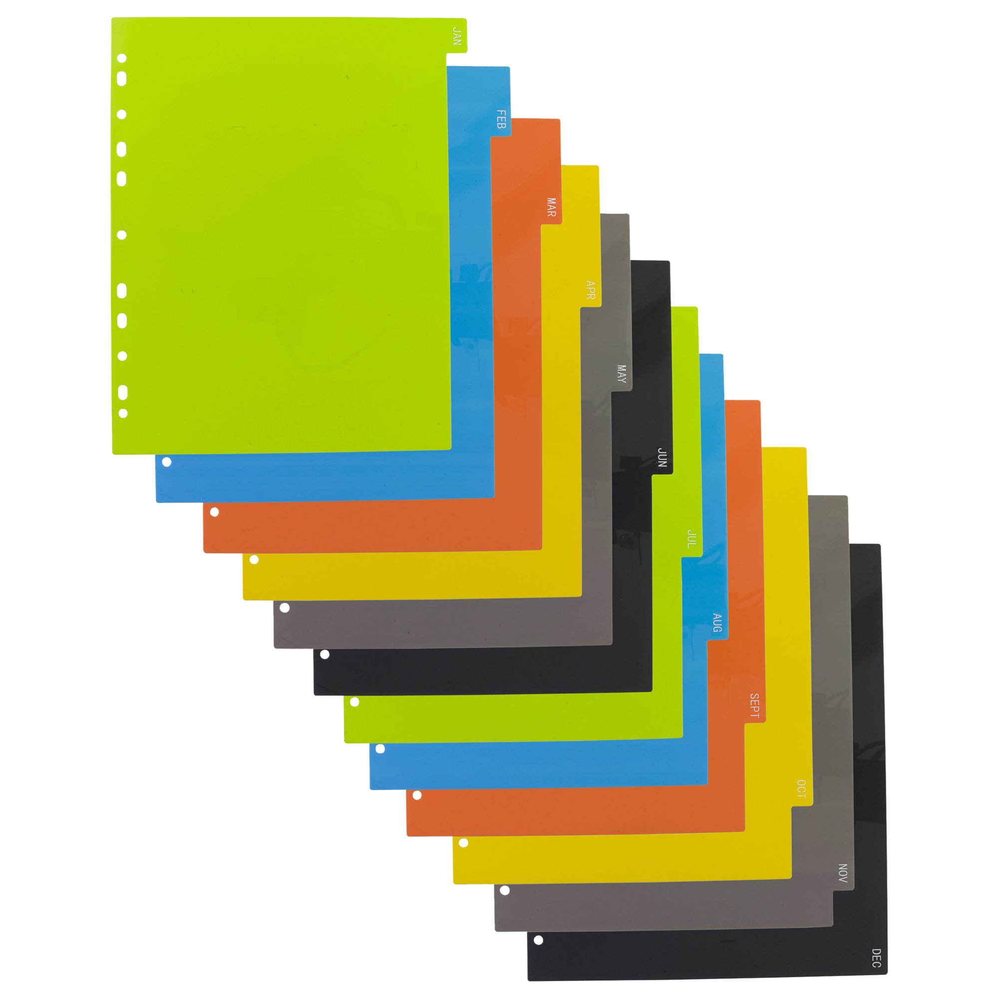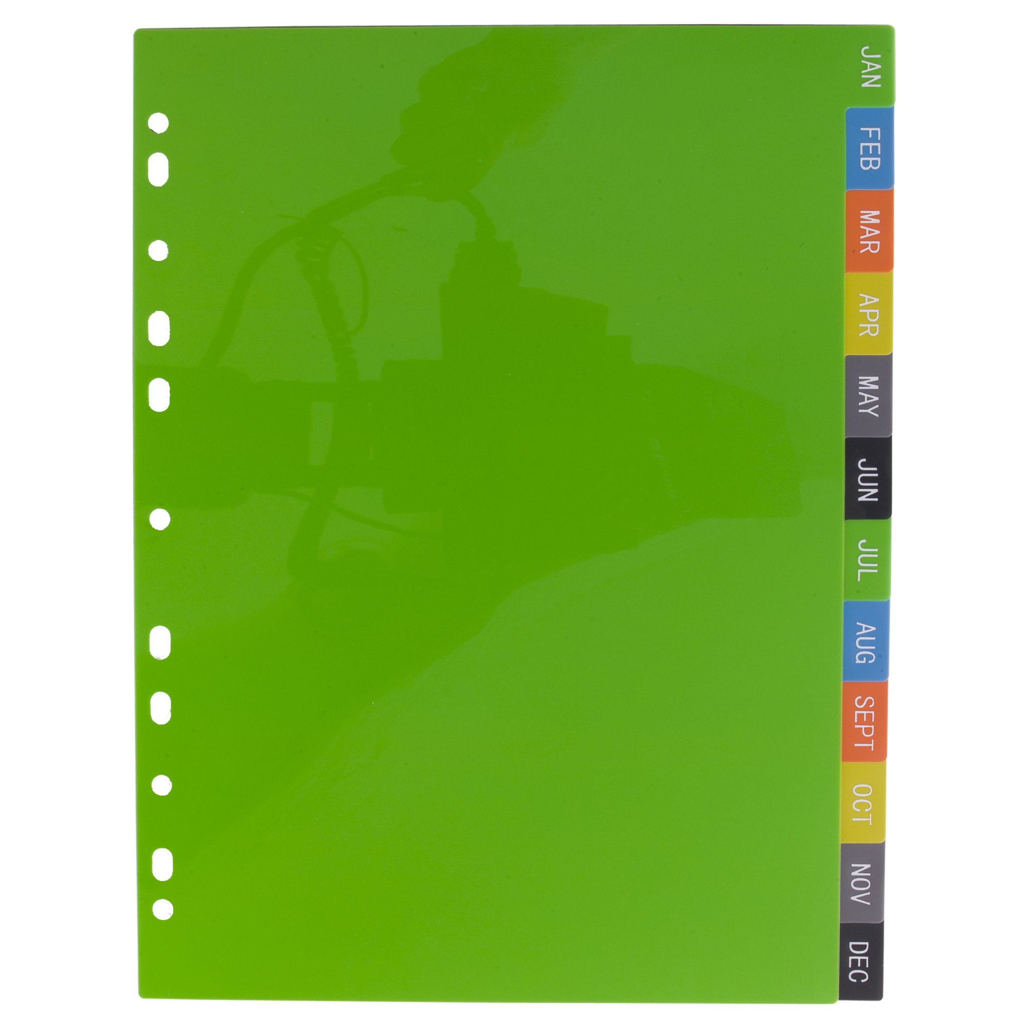 Strong 200 micron strength A4 size index file dividers, ideal for home, office and professional use. Set of 12 dividers colour coded and labelled January - December for the filing and organising of paperwork and documents in ring binders and files. Contents page templates can be downloaded from our website. Responsibly sourced materials and responsibly produced. Made from 50% recycled materials, product and packaging both 100% recyclable.