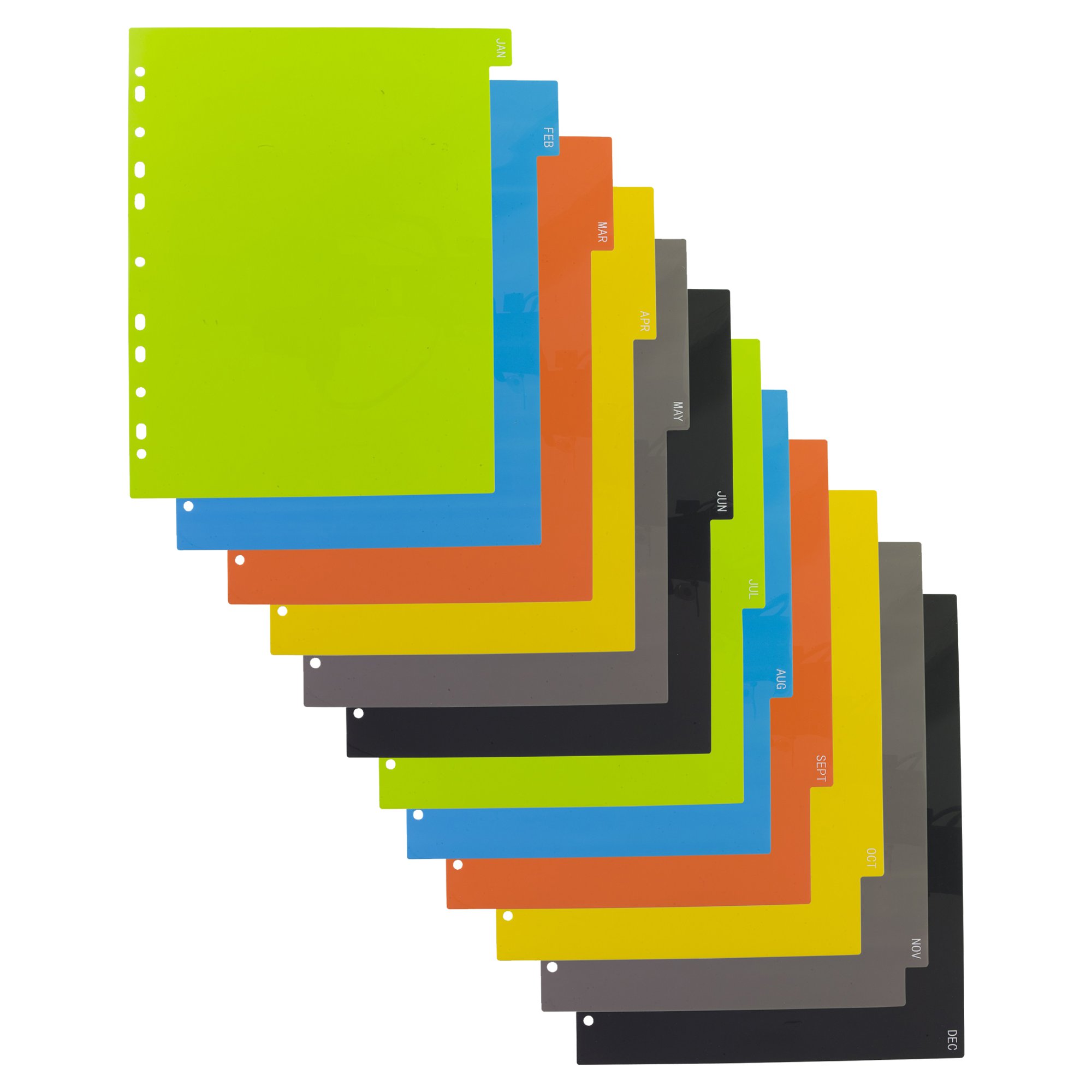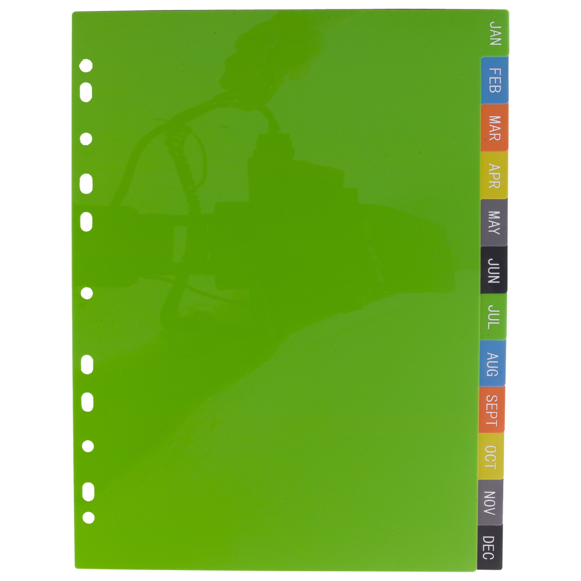 Strong 200 micron strength A4 size index file dividers, ideal for home, office and professional use. Set of 12 dividers colour coded and labelled January - December for the filing and organising of paperwork and documents in ring binders and files. Extra wide for use with multi-punched pockets. Contents page templates can be downloaded from our website. Responsibly sourced materials and responsibly produced. Made from 50% recycled materials, product and packaging both 100% recyclable.