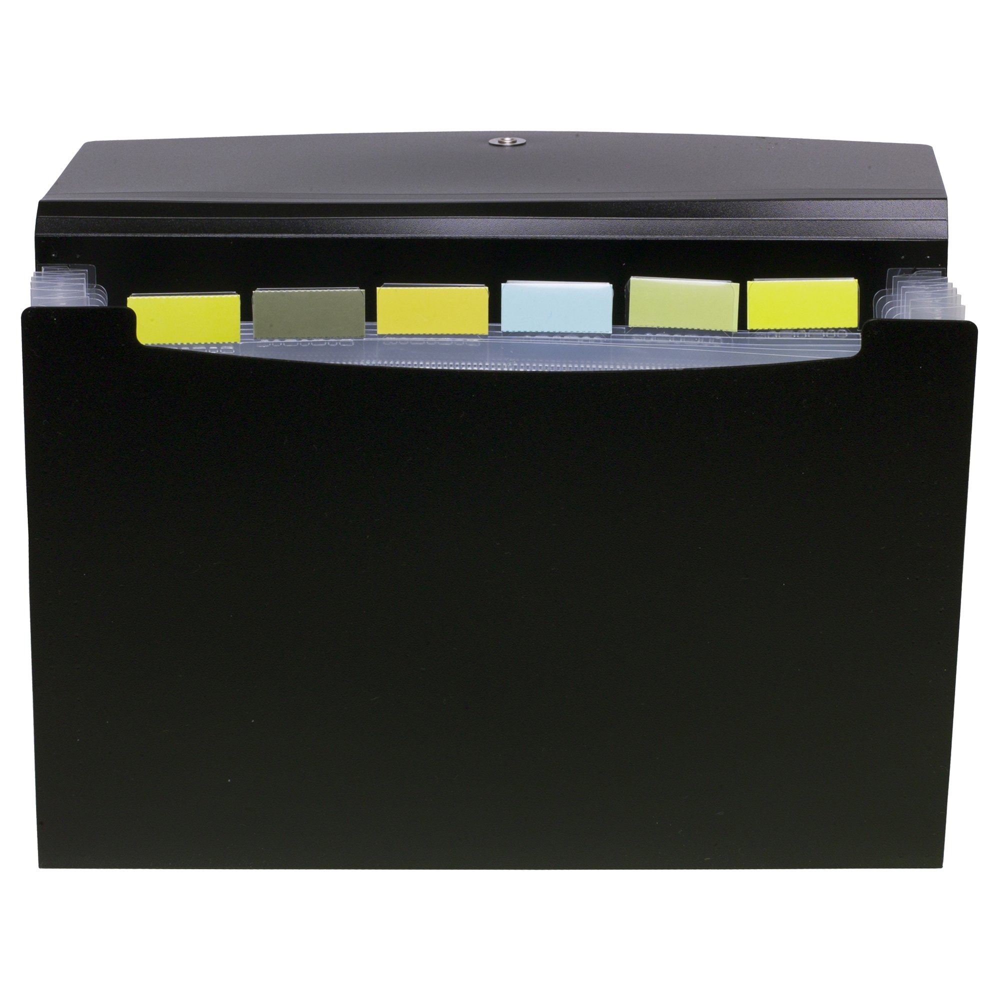 Strong black 700 micron expanding file with clear 160 micron A4 size internal Compatibleartments and elasticated closure. A total of 7 Compatibleartments which are ideal for multi purpose filing. Responsibly sourced materials and responsibly produced. Made from 50% recycled materials, product and packaging both 100% recyclable.