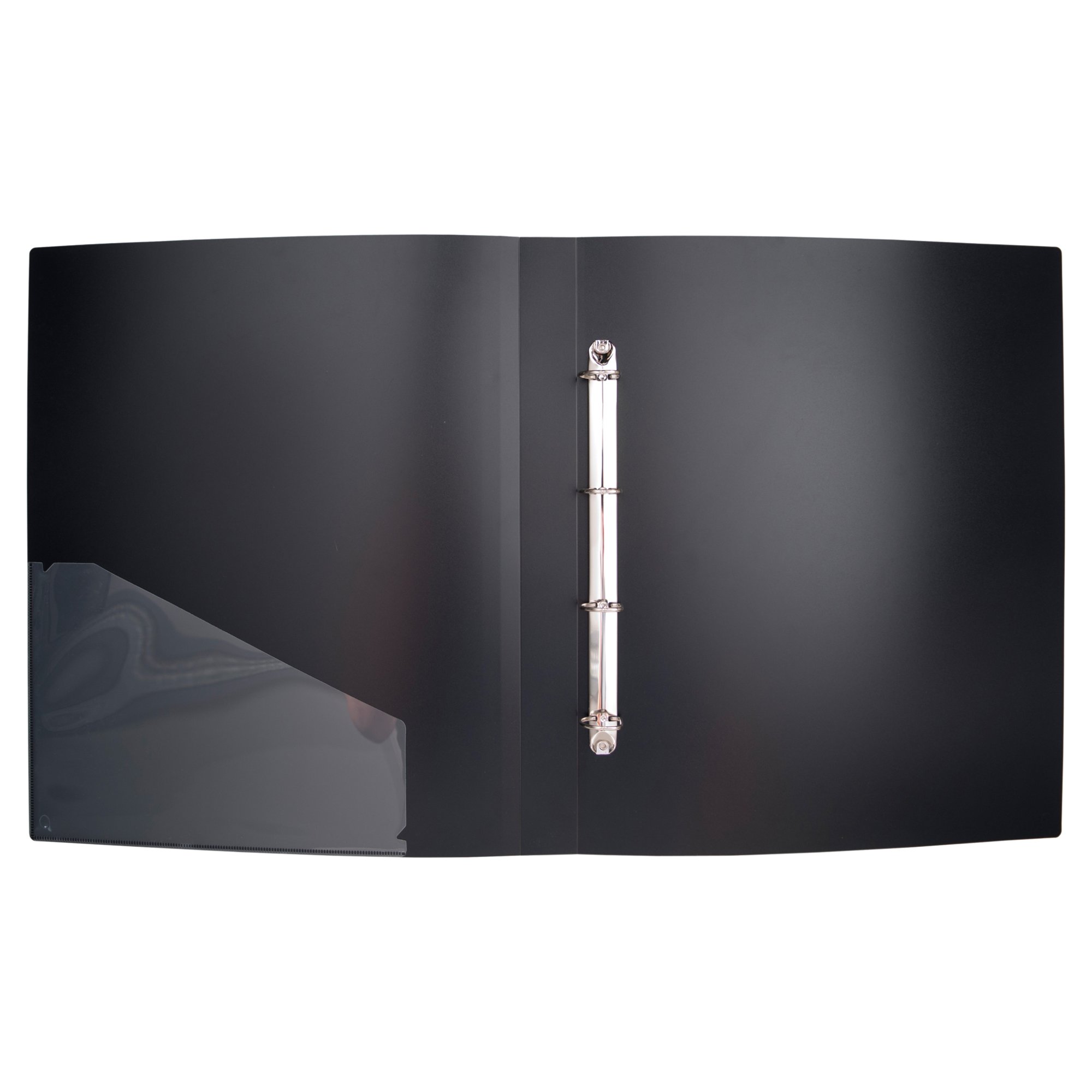 Strong black 1000 micron portrait cover ring binder with clear 160 micron A3 size sleeve on front cover and spine cover for personalisation and presentation. Clear additional storage pocket featured inside of front cover to house loose items and documents. 4 €D€ ring mechanism securely hold A3 punched pockets or paper. Ring capacity 25mm with a 40mm spine. Responsibly sourced materials and responsibly produced. Made from 95% recycled materials, product 100% recyclable.