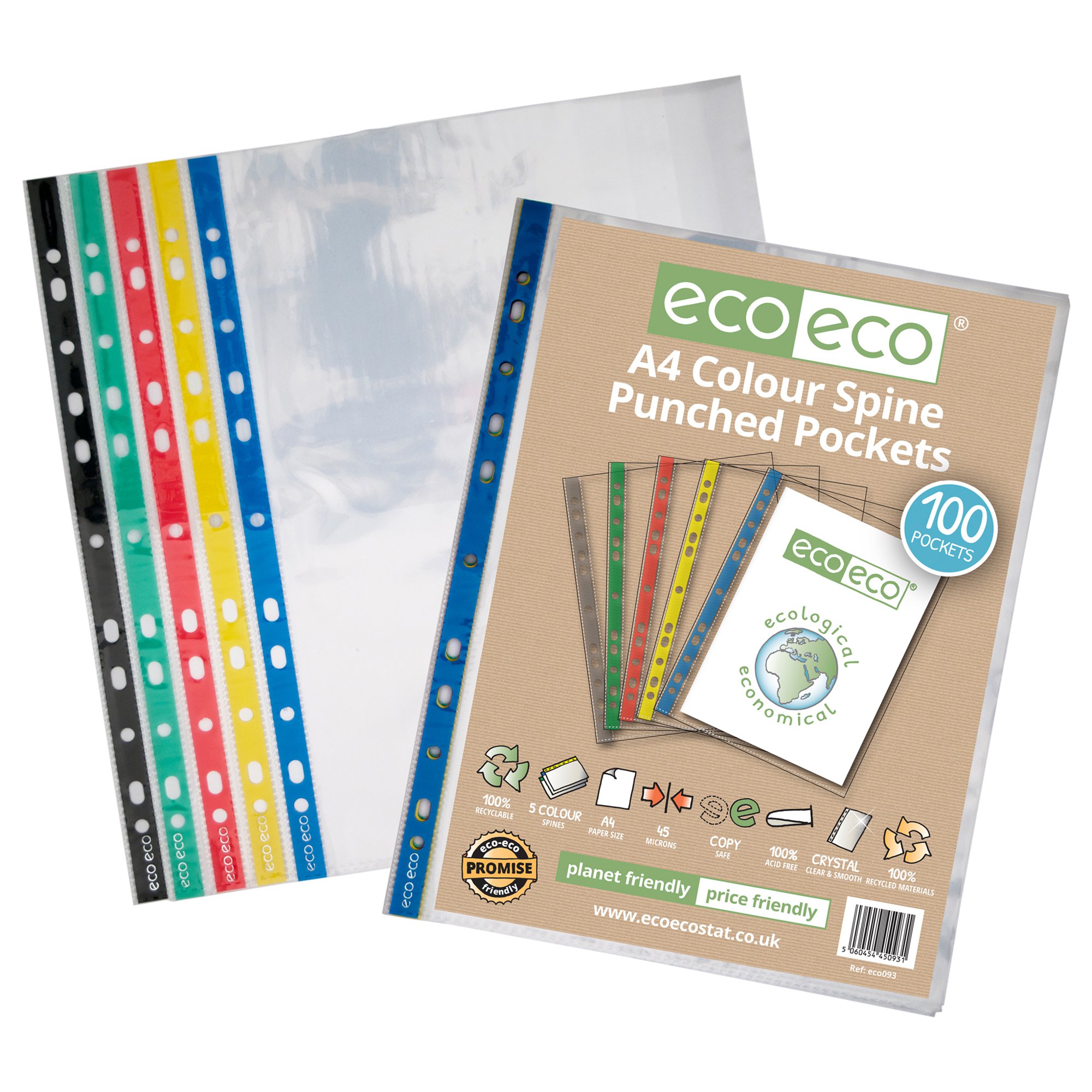 Strong 45 micron strength wallets with coloured spines, ideal for home, office and professional use. These pockets securely hold A4 documents. 100 pockets per single pack. Glass clear visibility with smooth finish. Coloured multi-punched spine for universal filing. Acid free and copy safe. Responsibly sourced materials and responsibly produced. Made from 100% recycled materials, product and packaging both 100% recyclable.