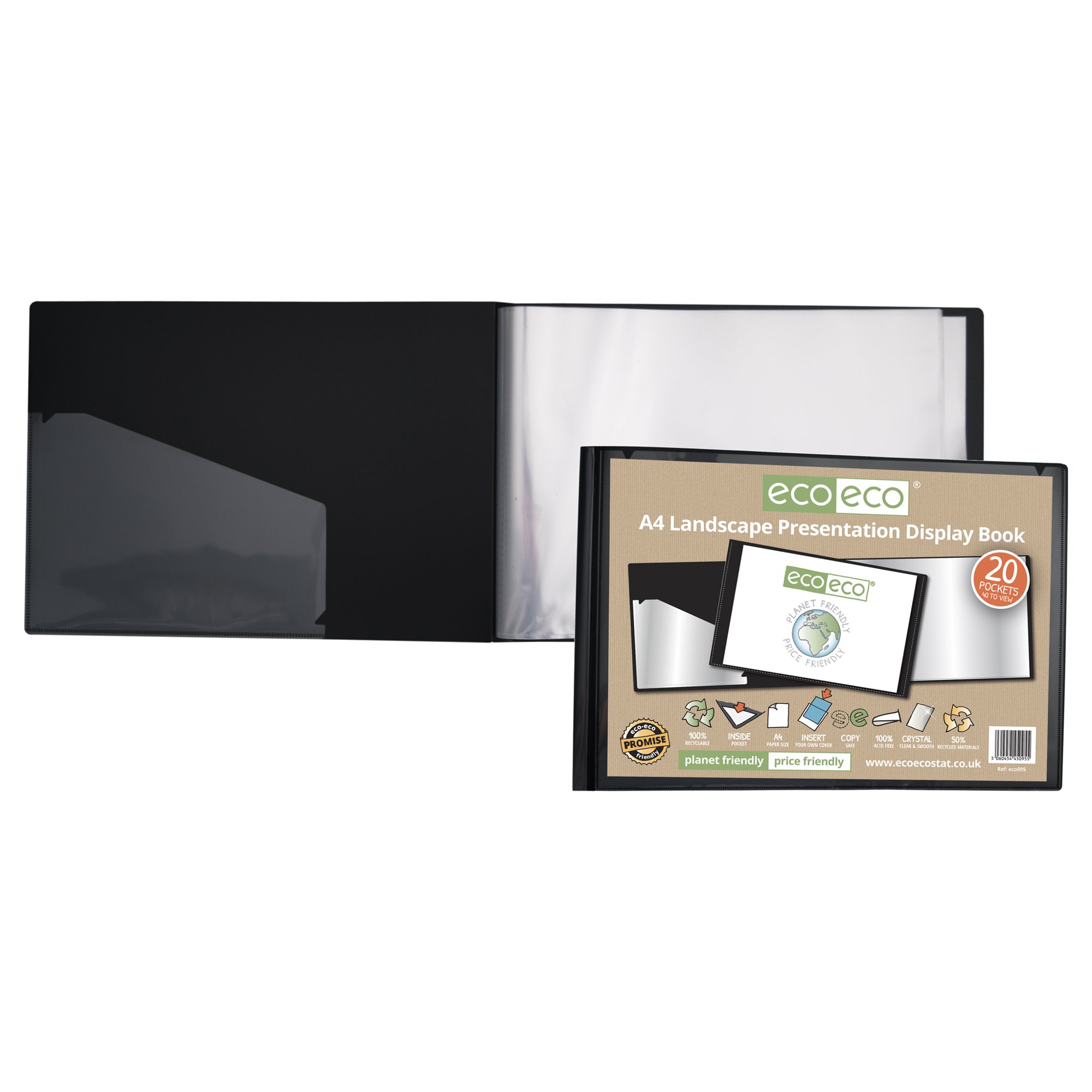 Strong black 600 micron cover landscape display book with clear 160 micron A4 size sleeve on front cover for personalisation and presentation. Clear additional storage pocket featured inside of front cover to house loose items and documents. A total of 20 pages (40 sides to view) securely bound for optimum and multi-purpose filing. 50 micron pages are acid free, smooth, glass clear and copy safe. These pages securely hold A4 documents. Responsibly sourced materials and responsibly produced. Made from 50% recycled materials, product and packaging both 100% recyclable.