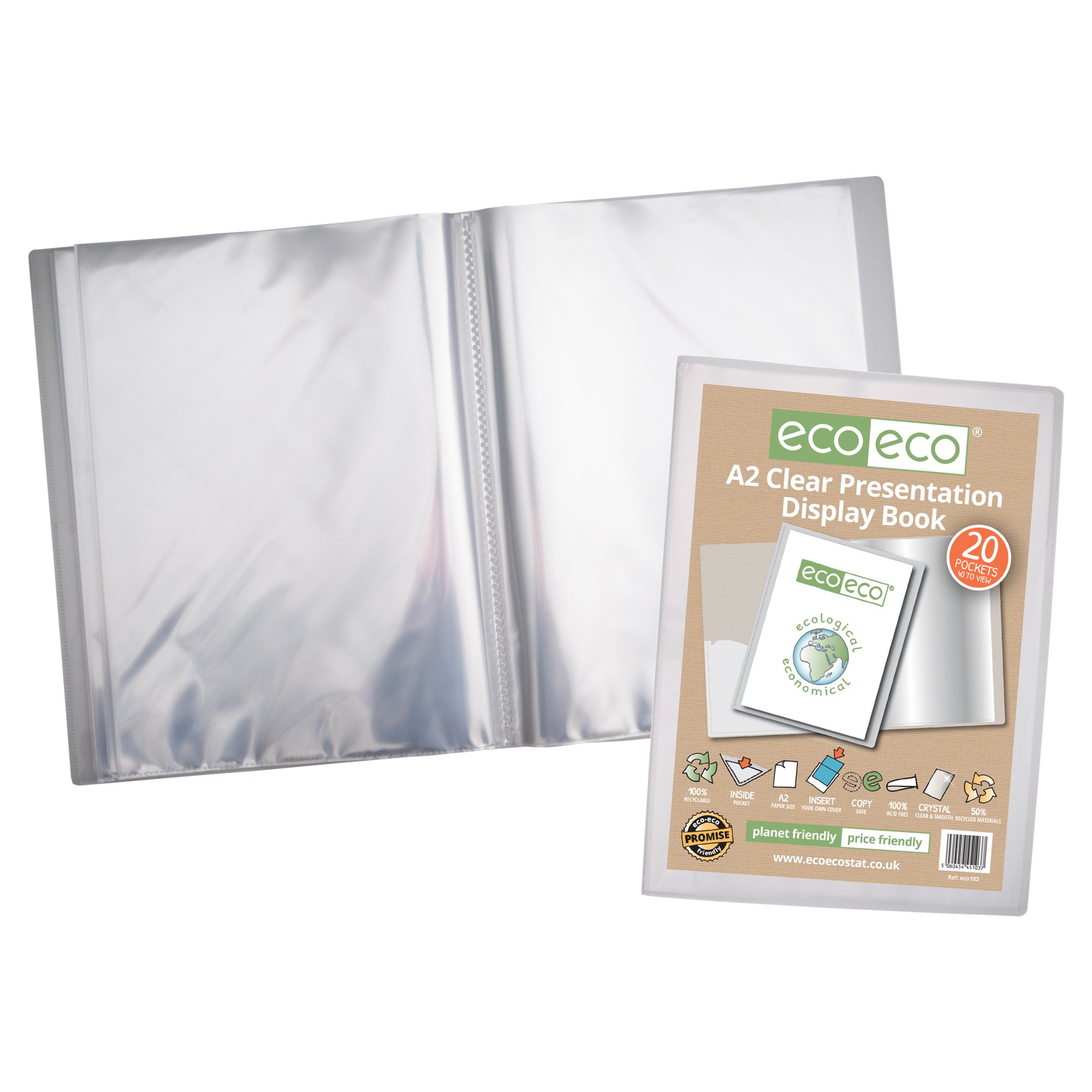 Strong clear 1000 micron cover display book with clear 160 micron A2 size sleeve on front cover for personalisation and presentation. Clear additional storage pocket featured inside of front cover to house loose items and documents. A total of 20 pages (40 sides to view) securely bound for optimum and multi-purpose filing. 50 micron pages are acid free, smooth, glass clear and copy safe. These pages securely hold A2 documents. Responsibly sourced materials and responsibly produced. Made from 50% recycled materials, product and packaging both 100% recyclable.