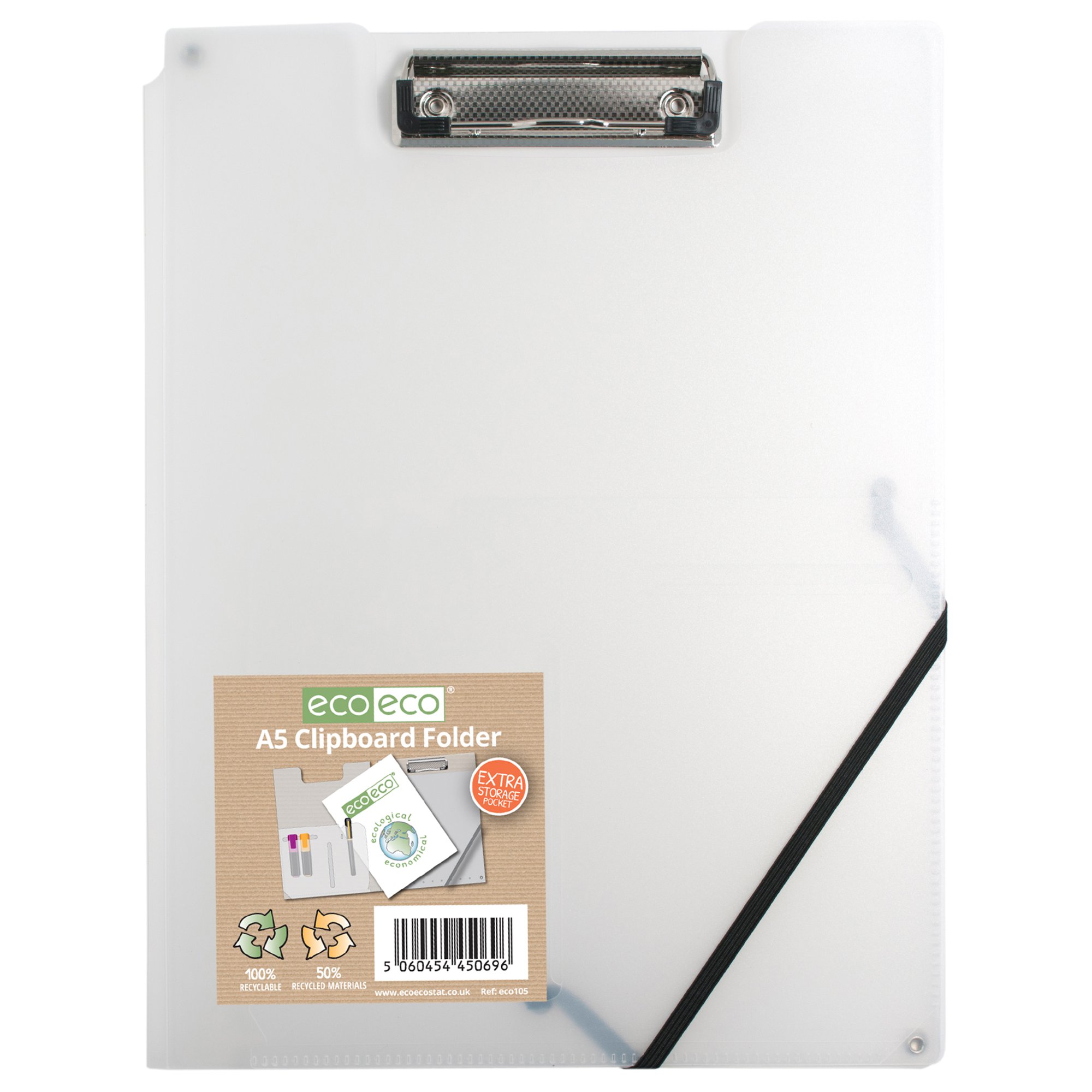 Strong A5 clipboard with metal clip, ideal for home, office and professional use. Available in black or clear with an elasticated closure. Clear additional storage pocket featured inside of front cover to house loose items and documents. Large rear pocket for extra storage. Responsibly sourced materials and responsibly produced. Made from 50% recycled materials, product 100% recyclable.