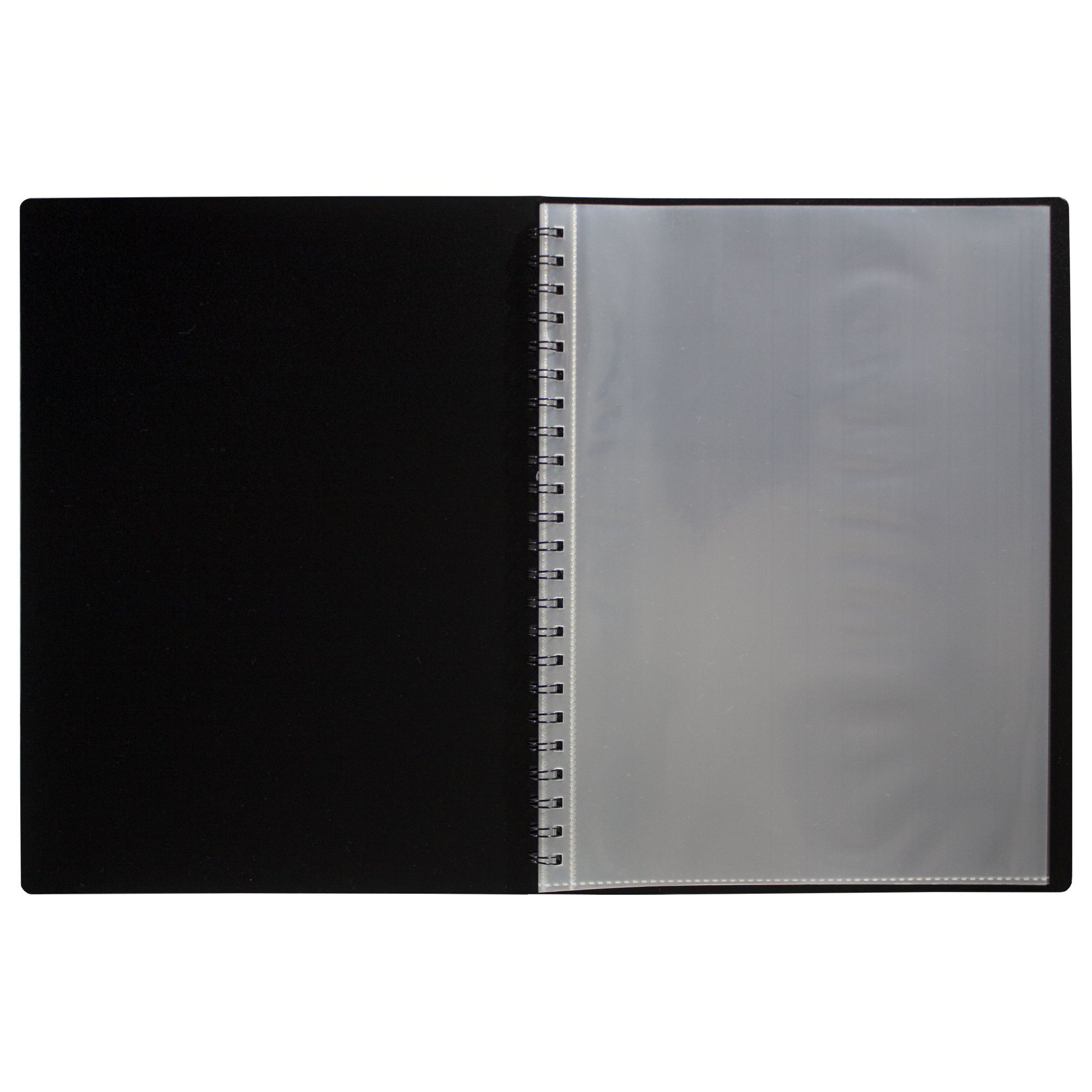 Strong black 800 micron cover fold flat spiral display book with clear 150 micron A4 size sleeve on front cover for personalisation and presentation. Clear additional storage pocket featured inside of front cover to house loose items and documents. A total of 40 pages (80 sides to view) securely bound for optimum and multi-purpose filing. 50 micron pages are acid free, smooth, glass clear and copy safe. These pages securely hold A4 documents. Responsibly sourced materials and responsibly produced. Made from 90% recycled materials, product and packaging both 100% recyclable.