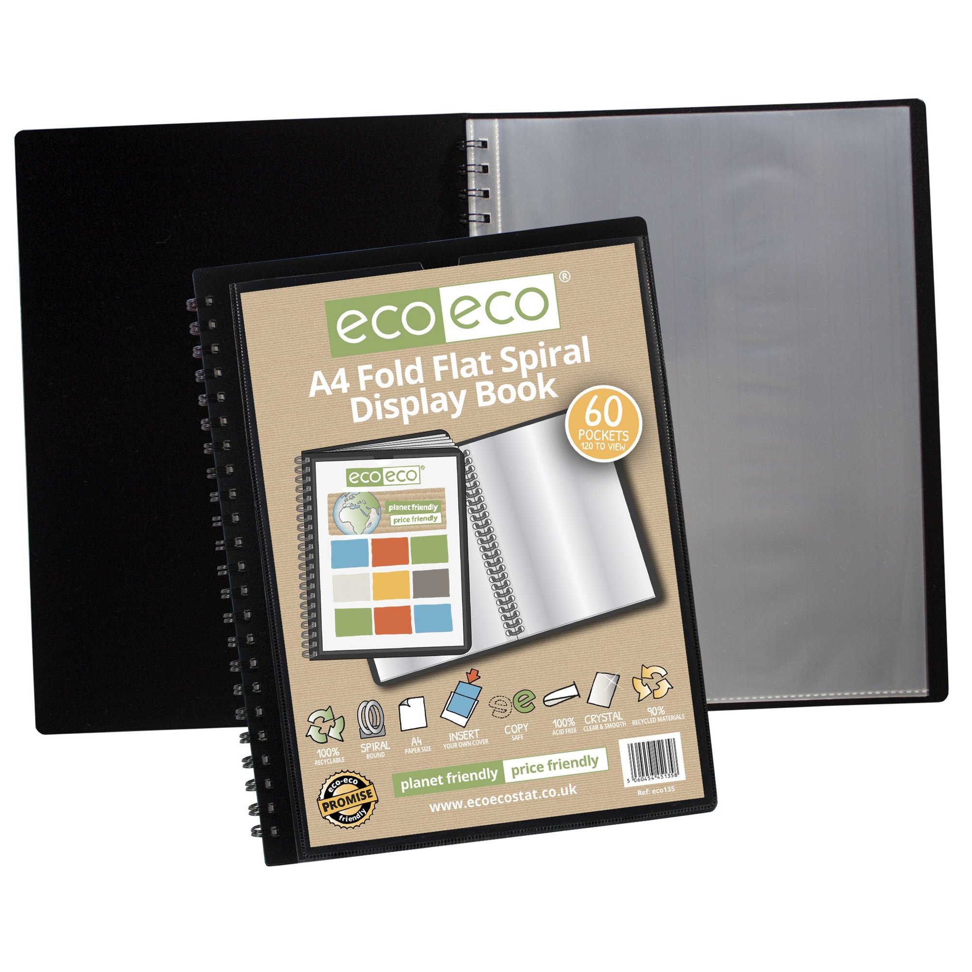 Strong black 800 micron cover fold flat spiral display book with clear 150 micron A4 size sleeve on front cover for personalisation and presentation. Clear additional storage pocket featured inside of front cover to house loose items and documents. A total of 60 pages (120 sides to view) securely bound for optimum and multi-purpose filing. 50 micron pages are acid free, smooth, glass clear and copy safe. These pages securely hold A4 documents. Responsibly sourced materials and responsibly produced. Made from 90% recycled materials, product and packaging both 100% recyclable.
