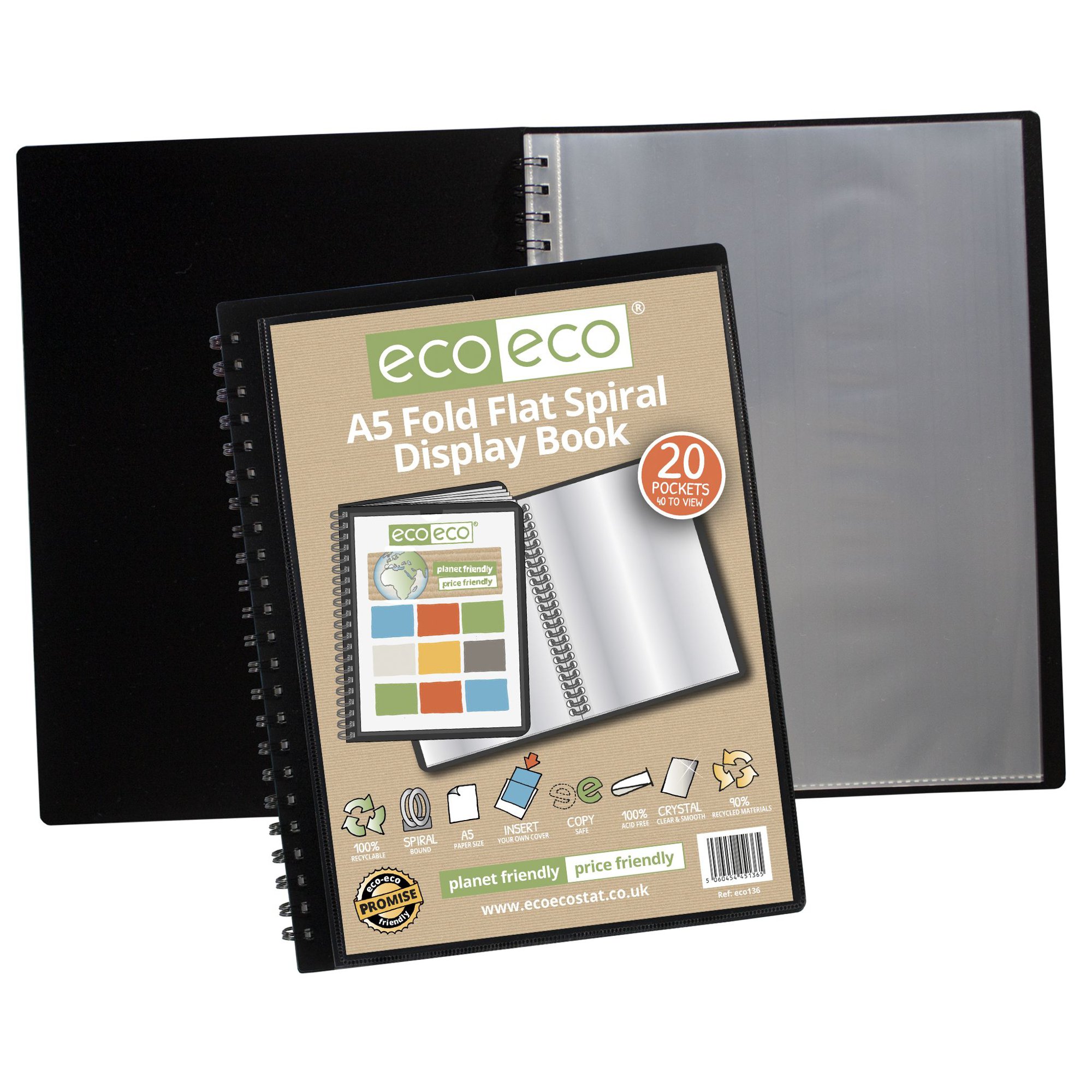 Strong black 800 micron cover fold flat spiral display book with clear 150 micron A5 size sleeve on front cover for personalisation and presentation. Clear additional storage pocket featured inside of front cover to house loose items and documents. A total of 20 pages (40 sides to view) securely bound for optimum and multi-purpose filing. 50 micron pages are acid free, smooth, glass clear and copy safe. These pages securely hold A5 documents. Responsibly sourced materials and responsibly produced. Made from 90% recycled materials, product and packaging both 100% recyclable.