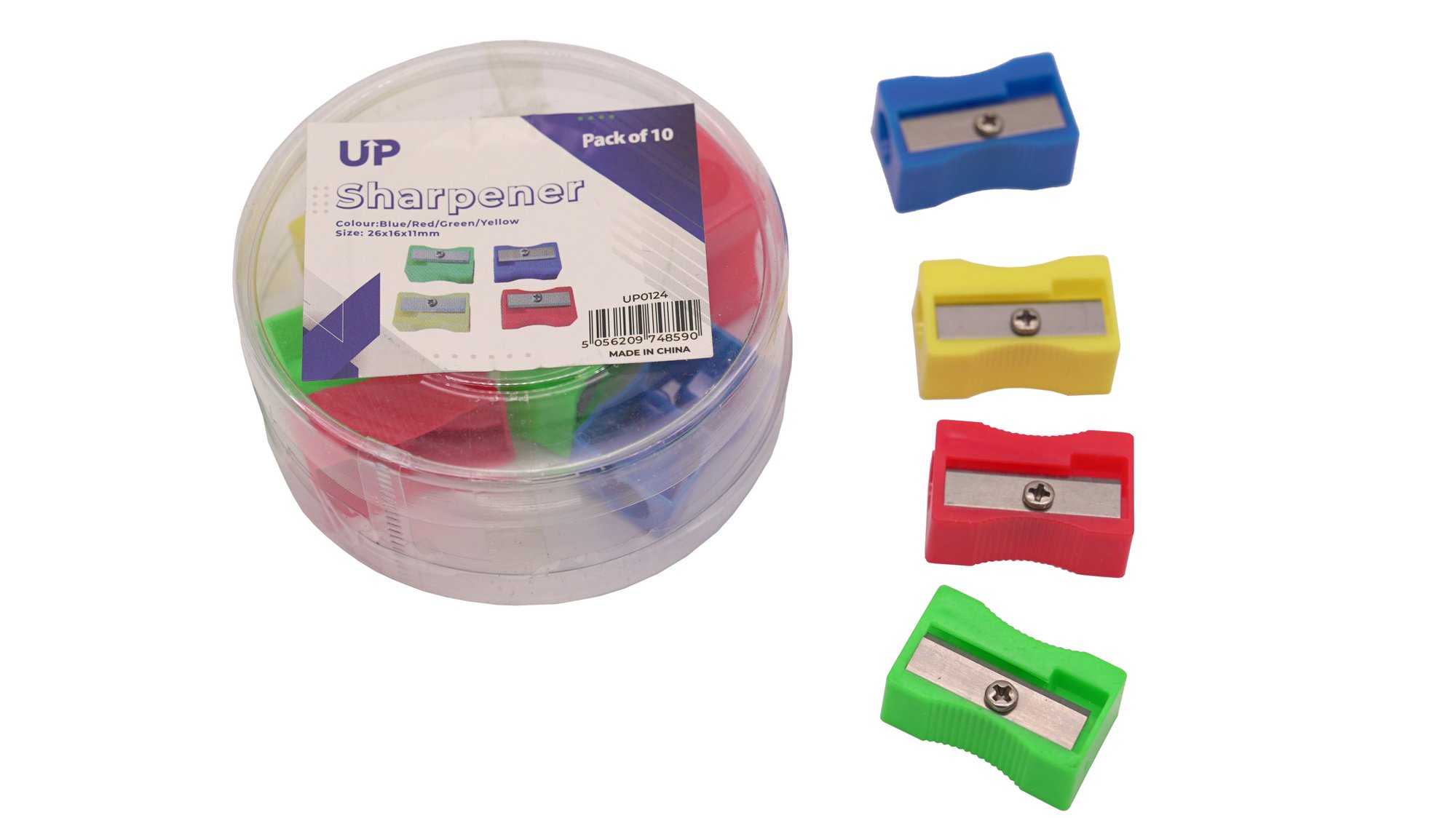 Durable plastic casing of this manual pencil sharpener houses a steel blade to get your pencils consistently sharp. Compatibleact size allows for easy storage—perfect for tossing into a backpack on the way to school. Assorted colors are sure to brighten up any desk. Pack includes 10 pencil sharpeners.